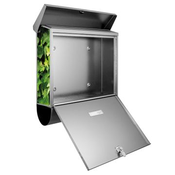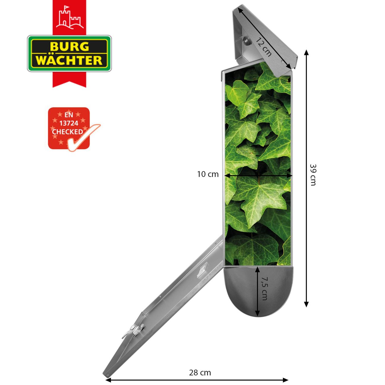 Der BURG-WÄCHTER Edelstahl Briefkasten mit Motiv Efeu und Zeitungsrolle bietet Ihnen mit seinem Fassungsvermögen genügend Platz auch für große A4 Sendungen und Zeitschriften. Das integrierte Regendach schützt Ihre Post vor dem Eindringen von Regen.
