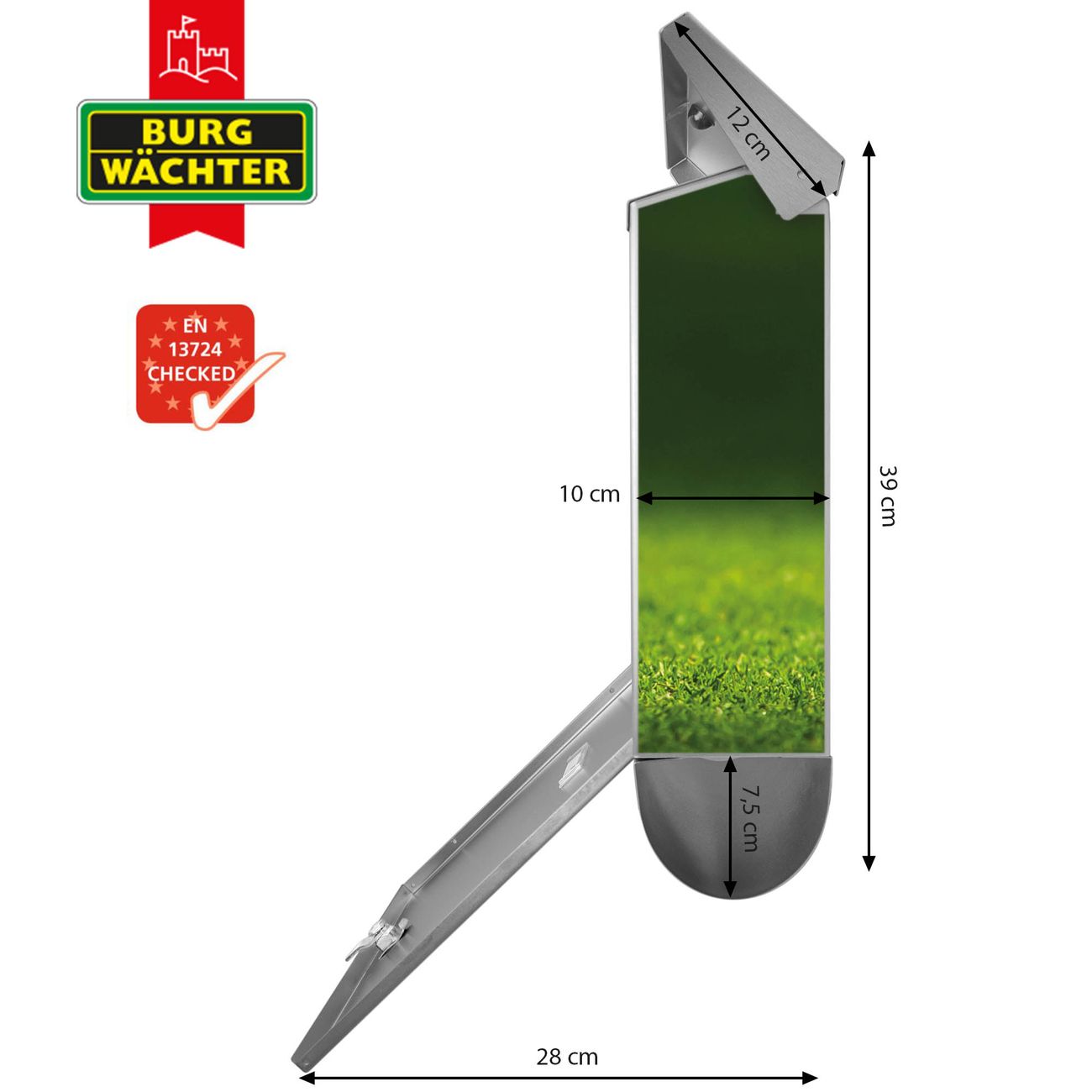 Der BURG-WÄCHTER Edelstahl Briefkasten mit Motiv Einsamer Golfball und Zeitungsrolle bietet Ihnen mit seinem Fassungsvermögen genügend Platz auch für große A4 Sendungen und Zeitschriften. Das integrierte Regendach schützt Ihre Post vor dem Eindringen von Regen.