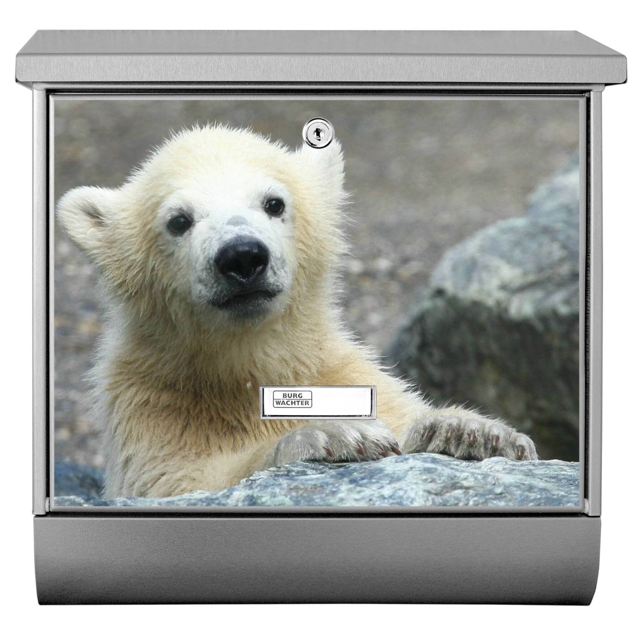 Der BURG-WÄCHTER Edelstahl Briefkasten mit Motiv Eisbär Baby und Zeitungsrolle bietet Ihnen mit seinem Fassungsvermögen genügend Platz auch für große A4 Sendungen und Zeitschriften. Das integrierte Regendach schützt Ihre Post vor dem Eindringen von Regen.