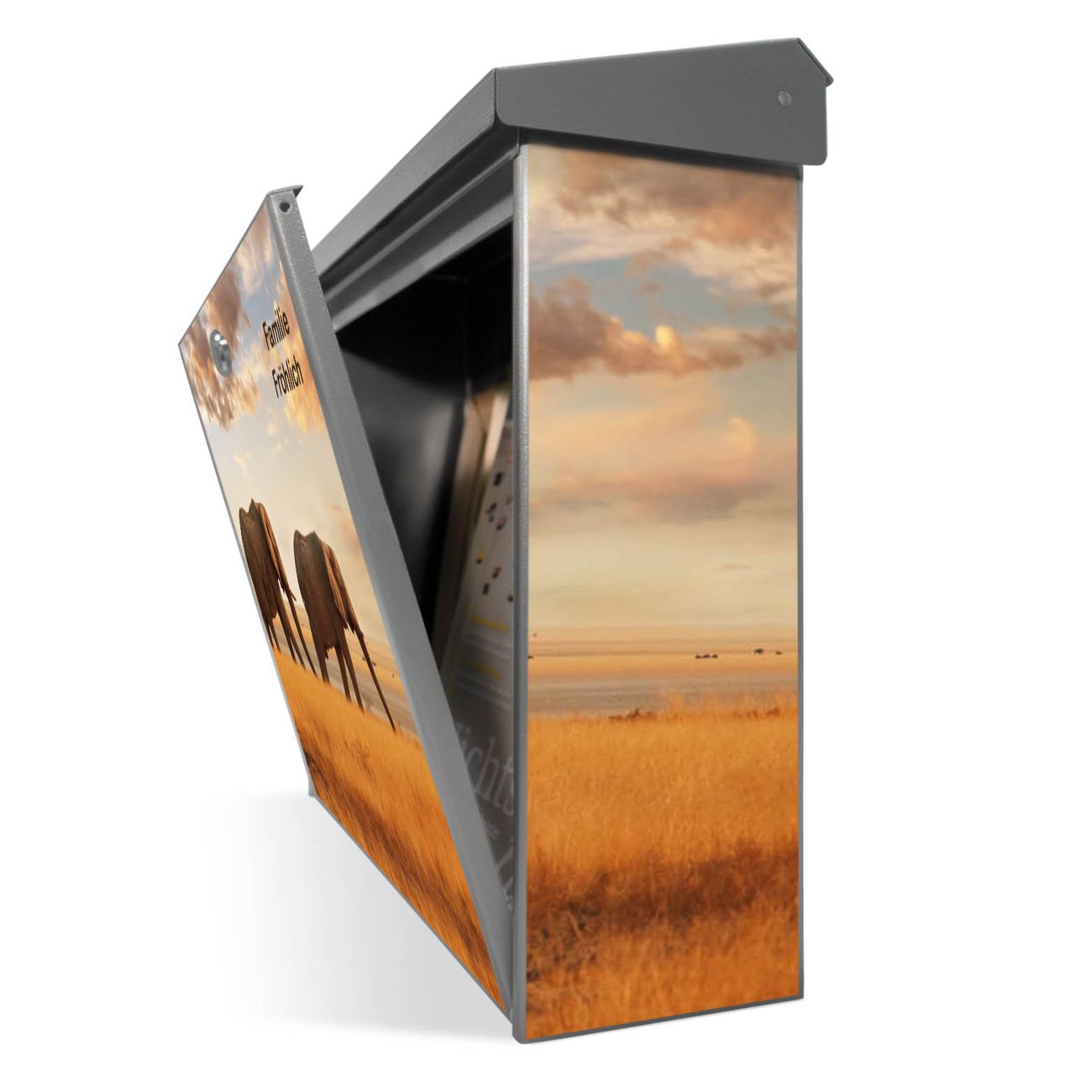 Sie können diesen Briefkasten sowohl als Wandbriefkasten montieren oder mit dem passenden Ständer als Standbriefkasten einbetonieren. Die gestaltete Motivfolie ist absolut wetterfest, UV-beständig und ein zusätzliches Schutzlaminat bewahrt Ihren Briefkasten vor unnötigen Kratzern.