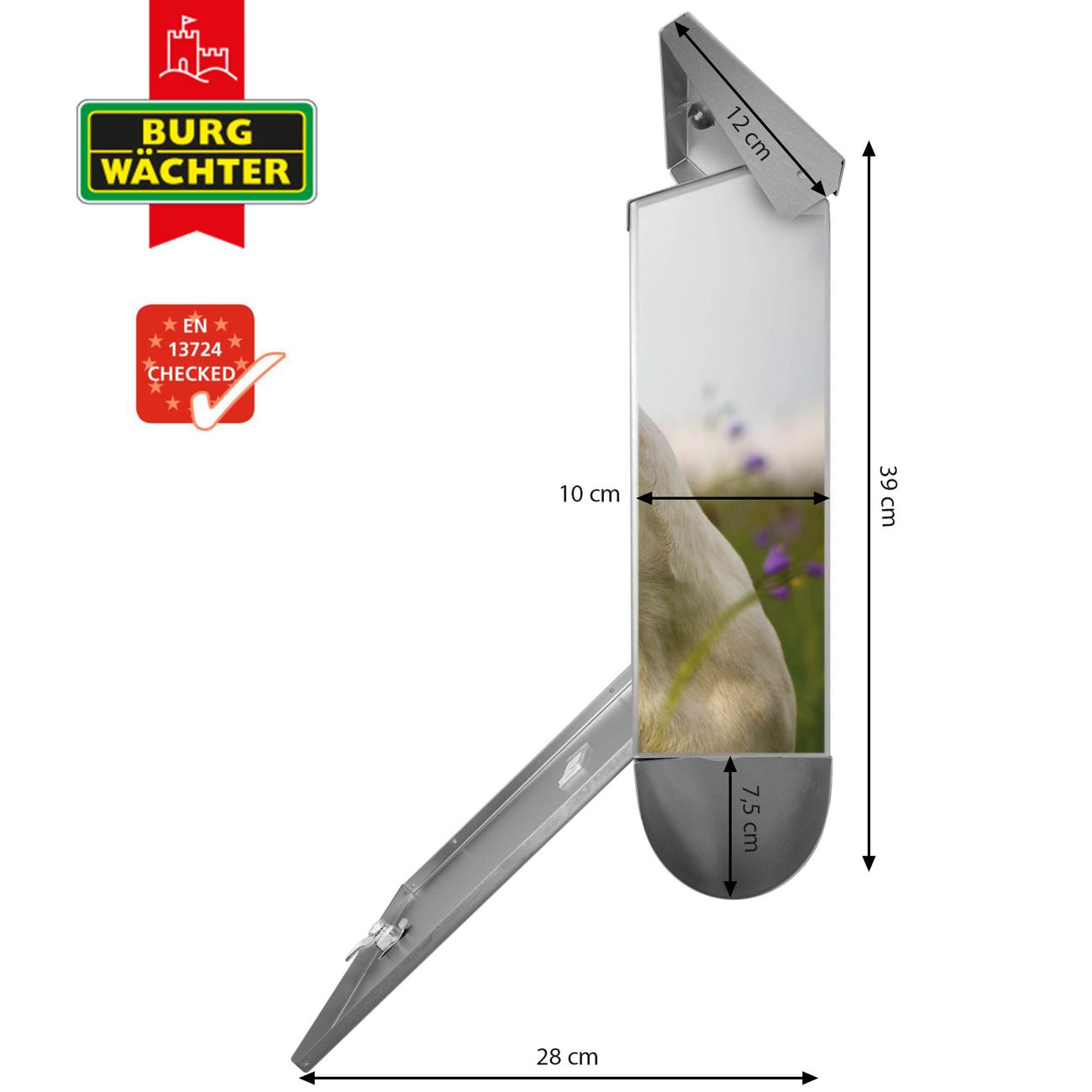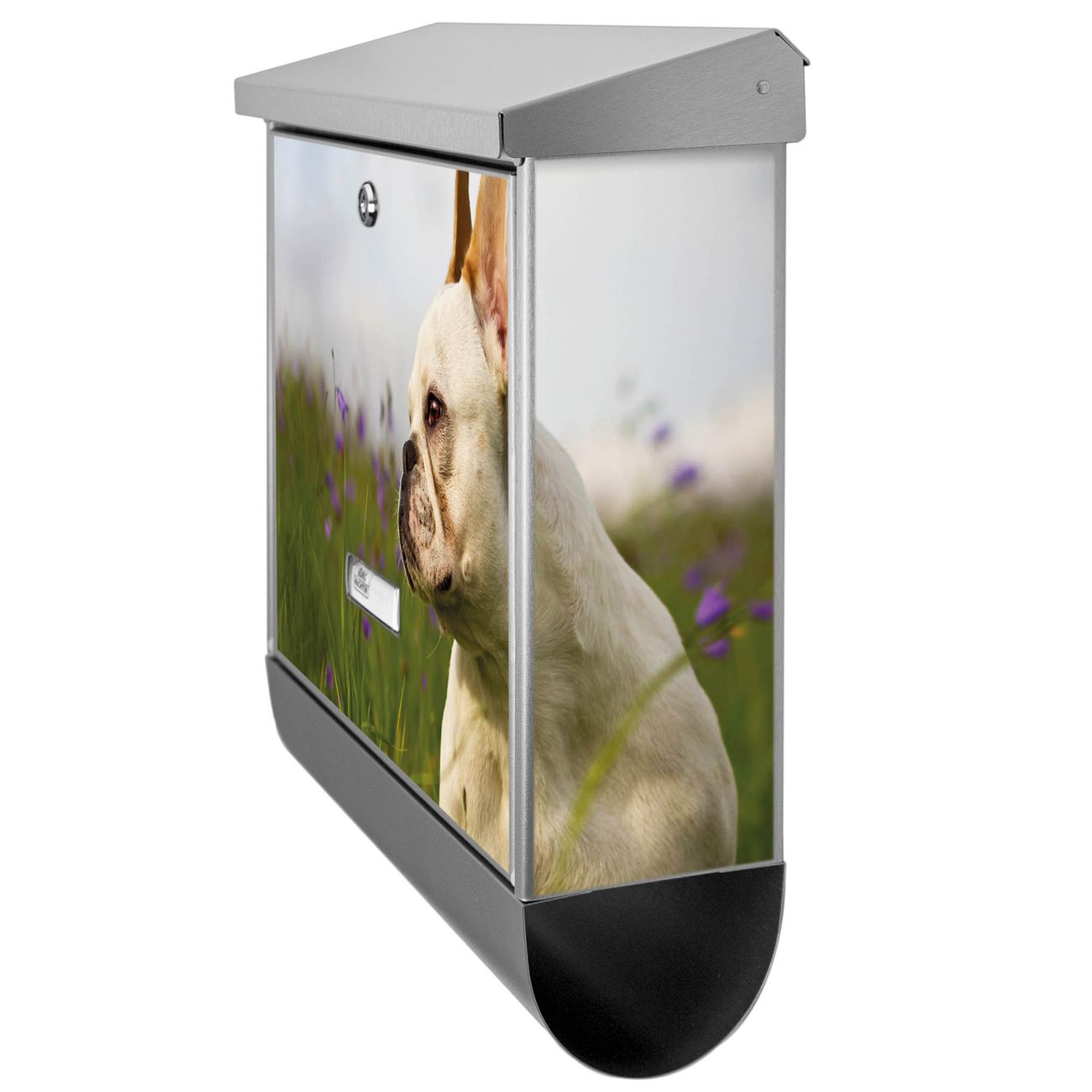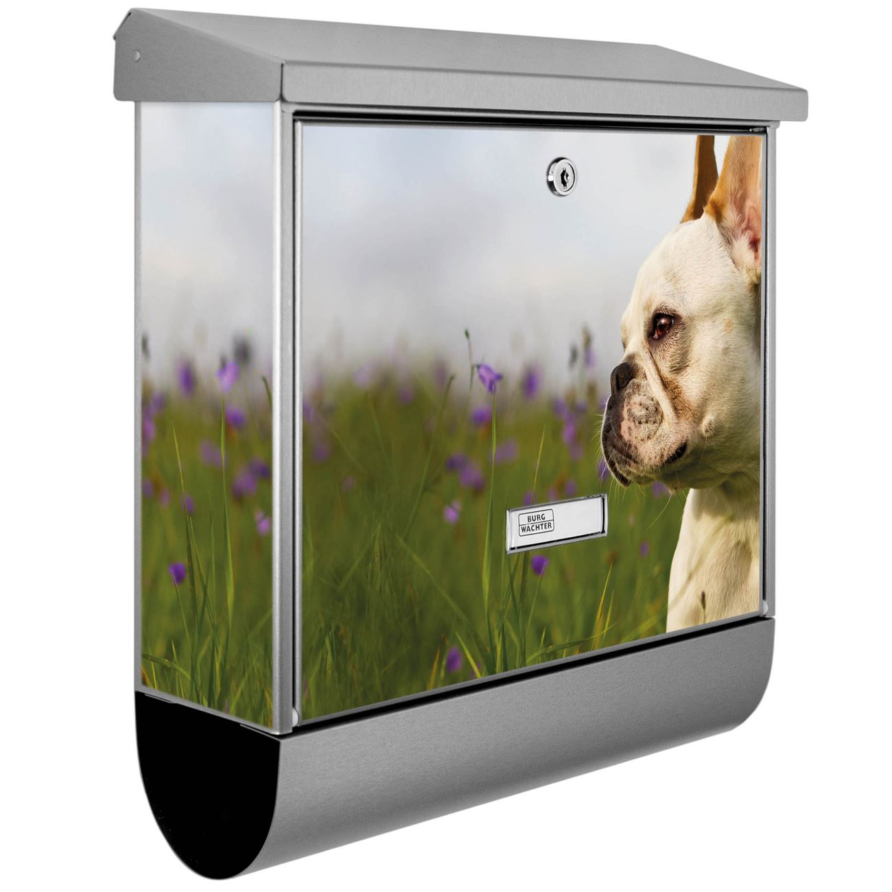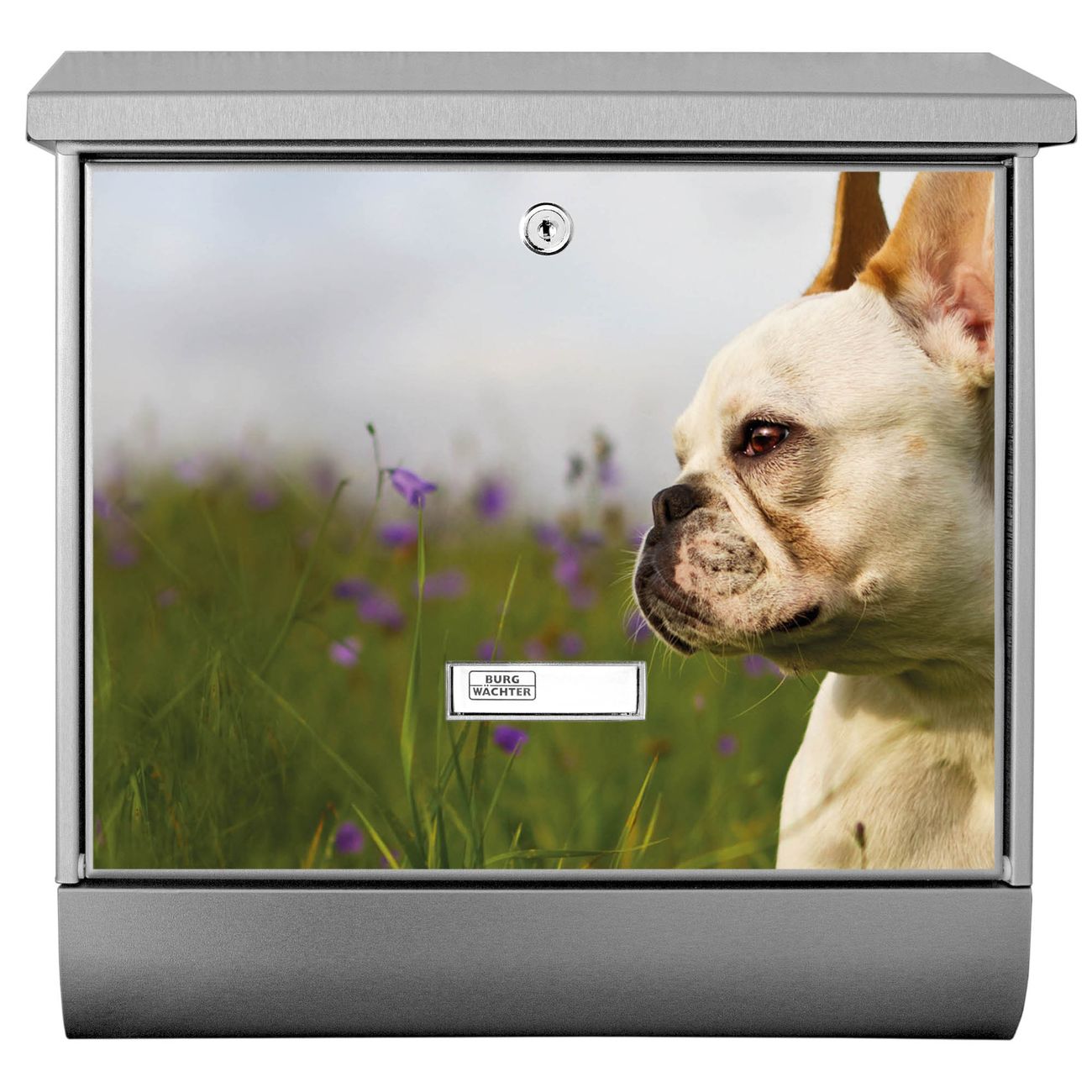 Der BURG-WÄCHTER Edelstahl Briefkasten mit Motiv Französische Bulldogge und Zeitungsrolle bietet Ihnen mit seinem Fassungsvermögen genügend Platz auch für große A4 Sendungen und Zeitschriften. Das integrierte Regendach schützt Ihre Post vor dem Eindringen von Regen.