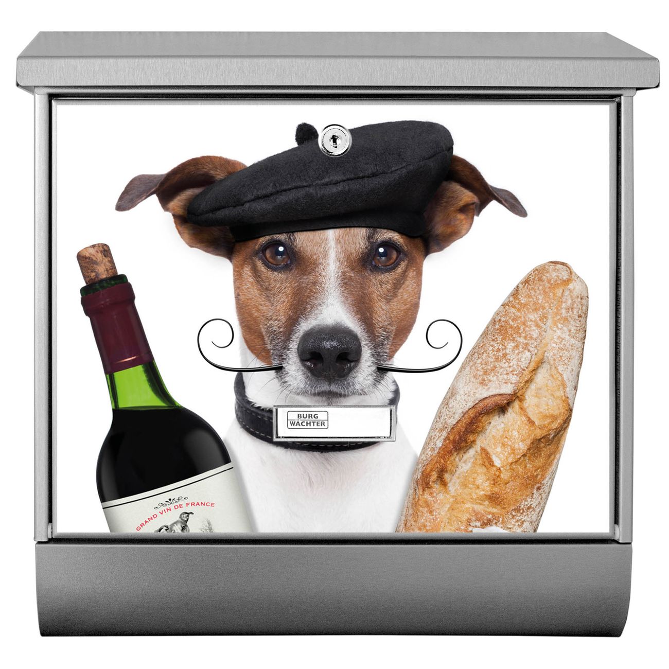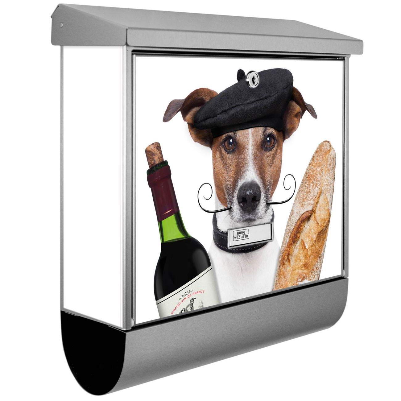 Der BURG-WÄCHTER Edelstahl Briefkasten mit Motiv Franzose Jack Russel und Zeitungsrolle bietet Ihnen mit seinem Fassungsvermögen genügend Platz auch für große A4 Sendungen und Zeitschriften. Das integrierte Regendach schützt Ihre Post vor dem Eindringen von Regen.