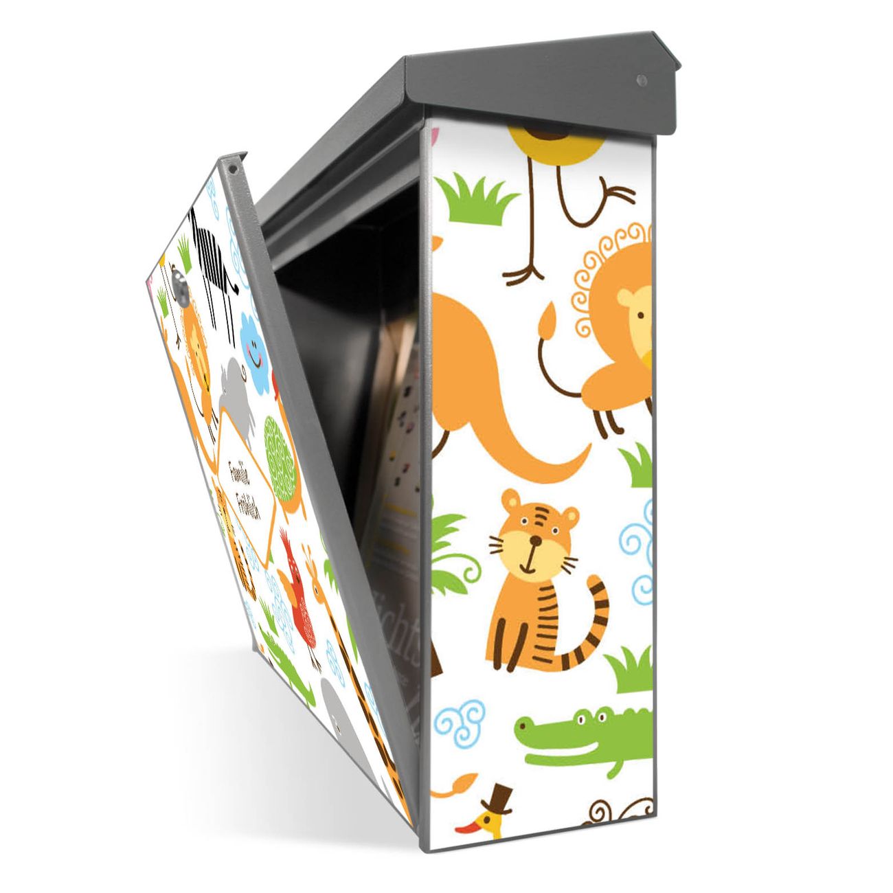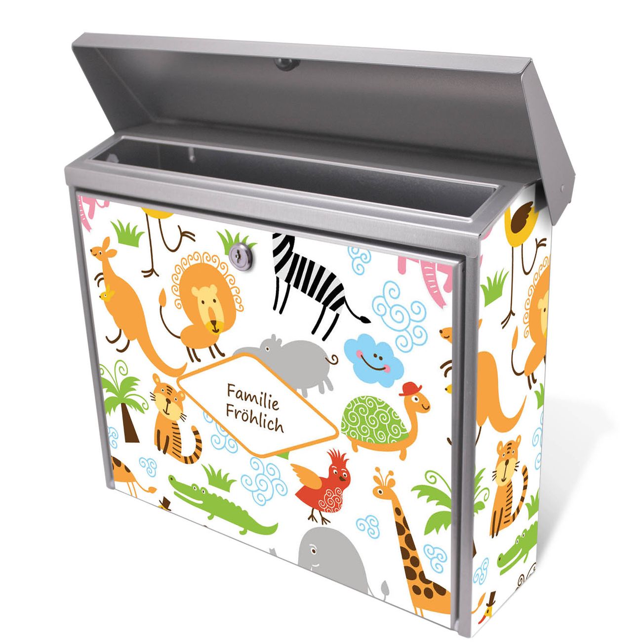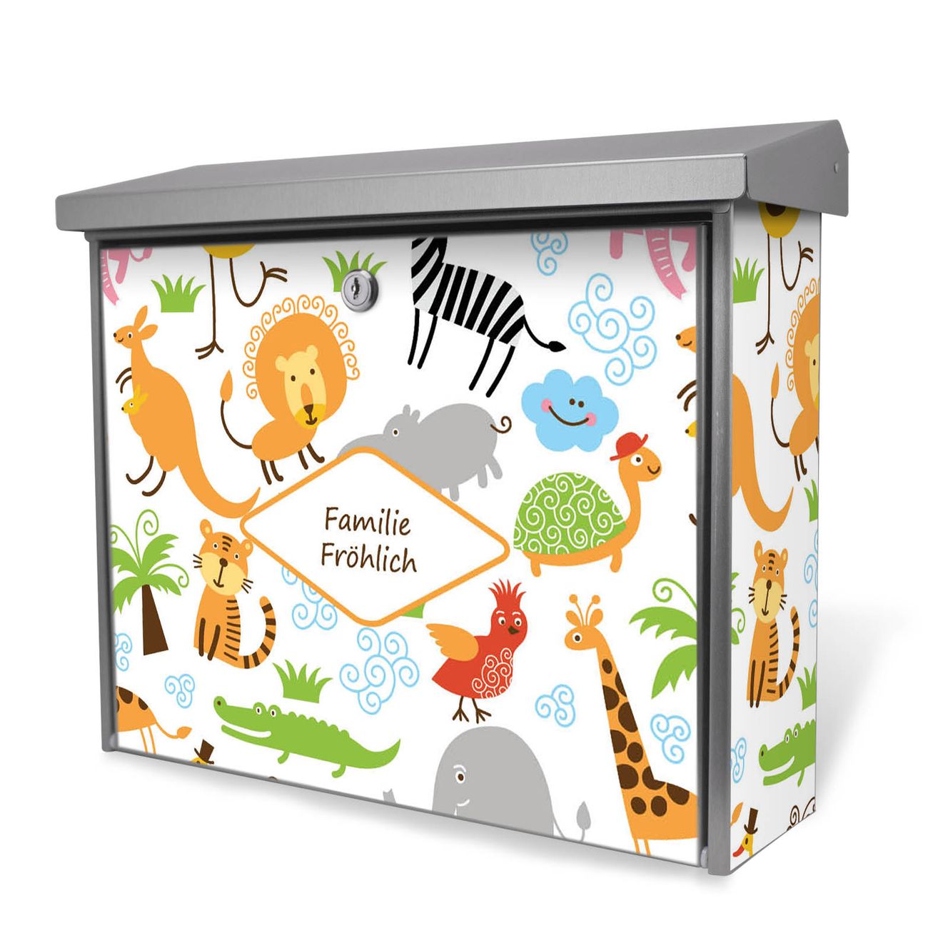 Der Postkasten mit Fröhliche Tiere Motiv hat ein sehr ansprechendes und zeitloses Design. Unsere Motivpalette hält jede Menge Varianten bereit, ob klassisch, modern, verspielt oder witzig - für jeden haben wir das passende Motiv parat. Der Briefkasten ist das Aushängeschild Ihres Hauses.