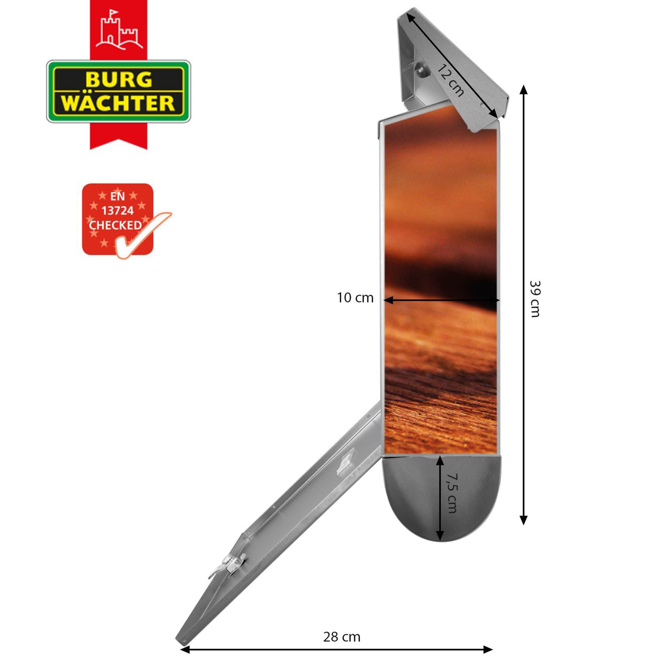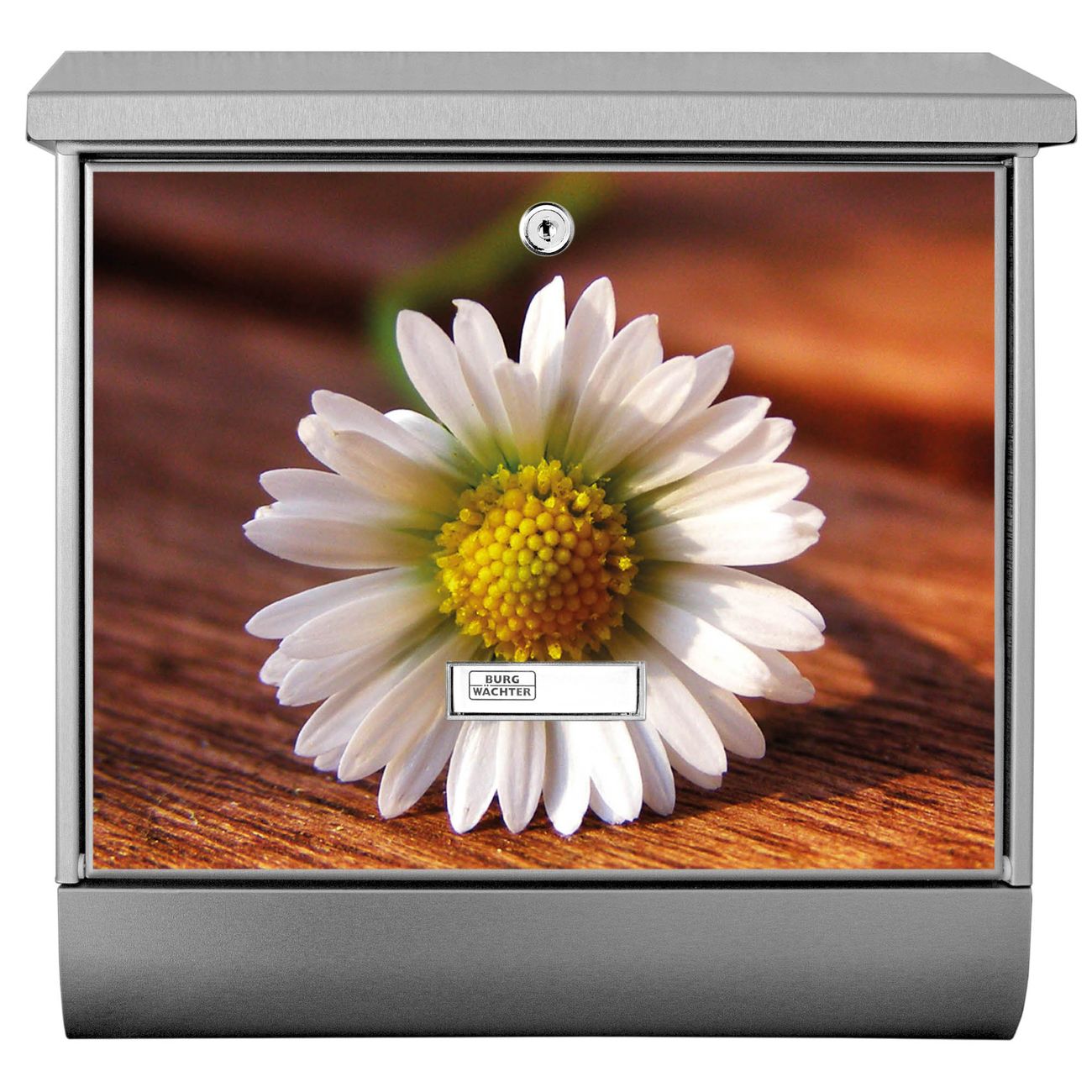 Der BURG-WÄCHTER Edelstahl Briefkasten mit Motiv Gänseblümchen und Zeitungsrolle bietet Ihnen mit seinem Fassungsvermögen genügend Platz auch für große A4 Sendungen und Zeitschriften. Das integrierte Regendach schützt Ihre Post vor dem Eindringen von Regen.