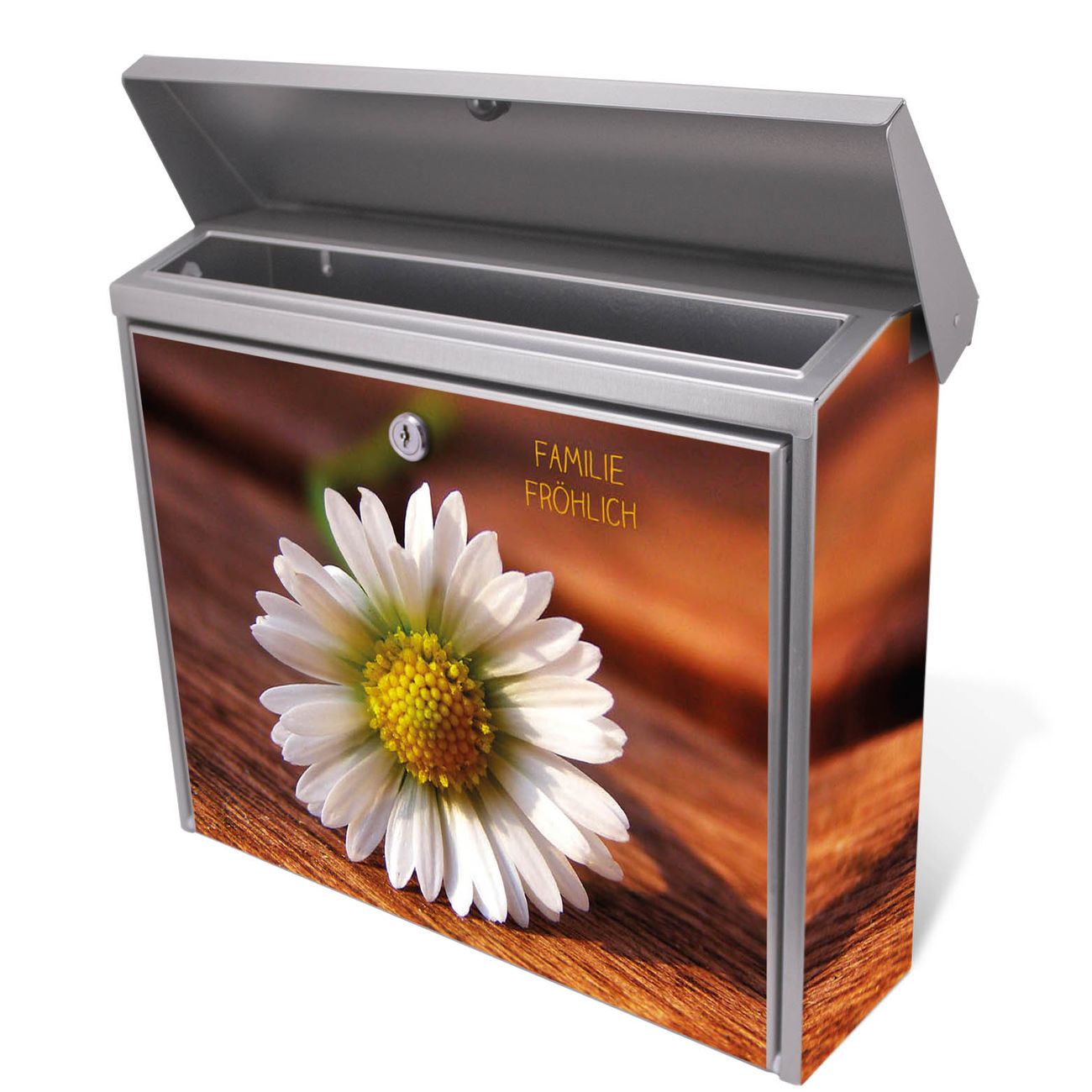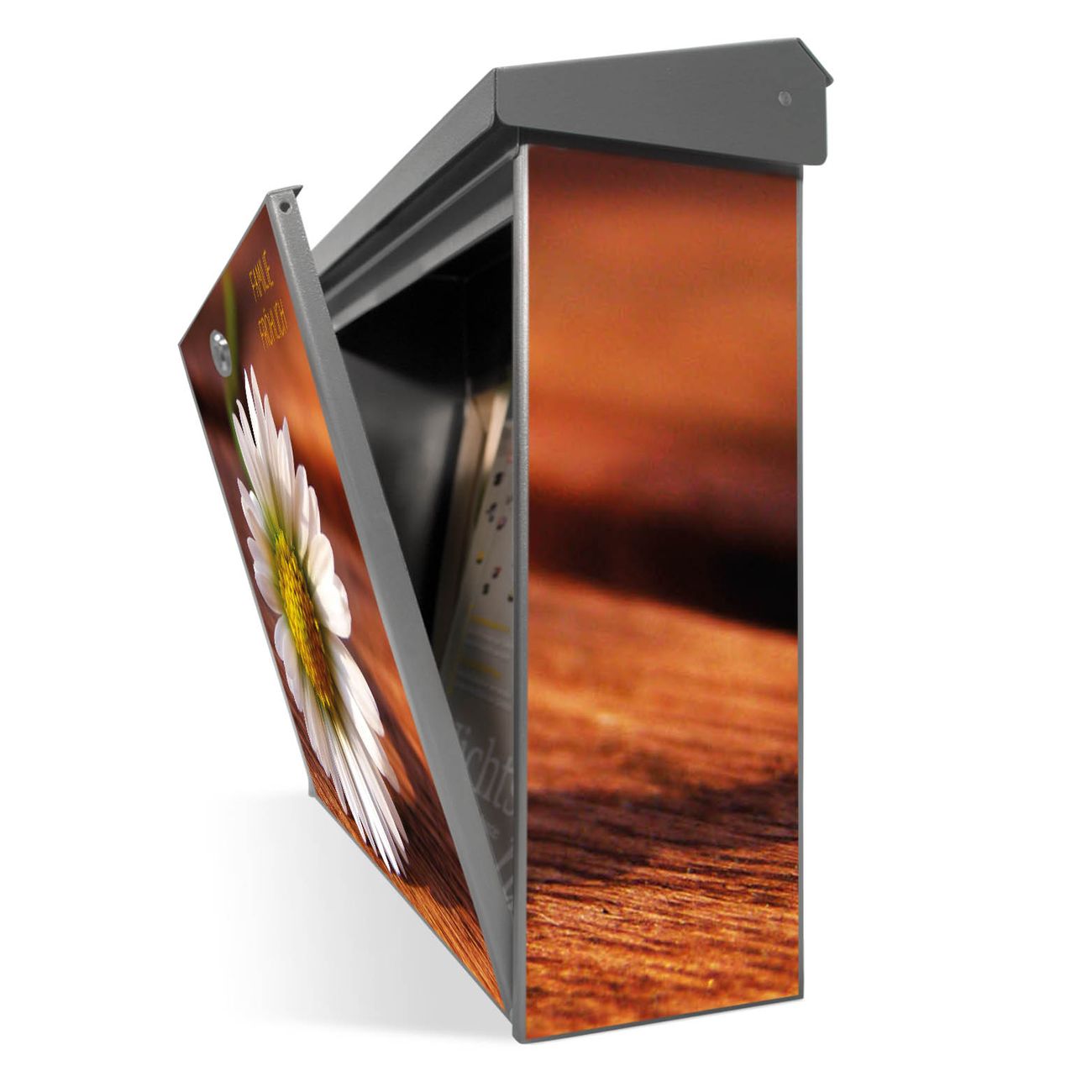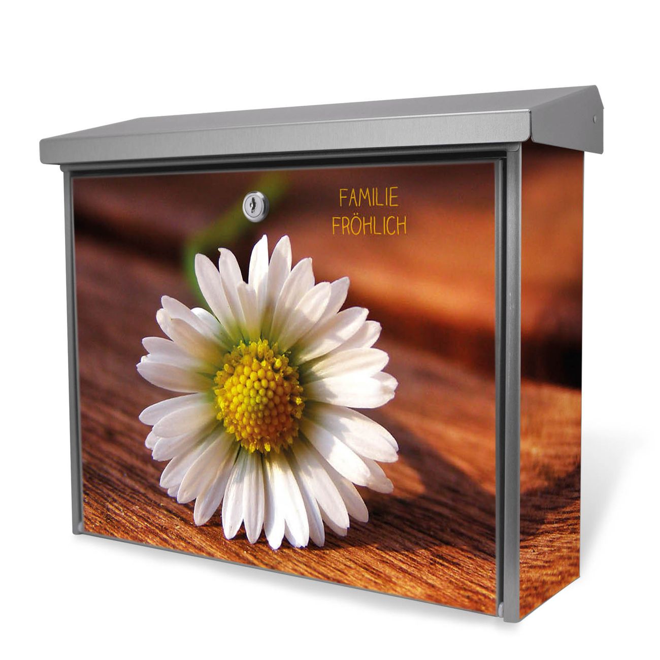Der Postkasten mit Gänseblümchen Motiv hat ein sehr ansprechendes und zeitloses Design. Unsere Motivpalette hält jede Menge Varianten bereit, ob klassisch, modern, verspielt oder witzig - für jeden haben wir das passende Motiv parat. Der Briefkasten ist das Aushängeschild Ihres Hauses.