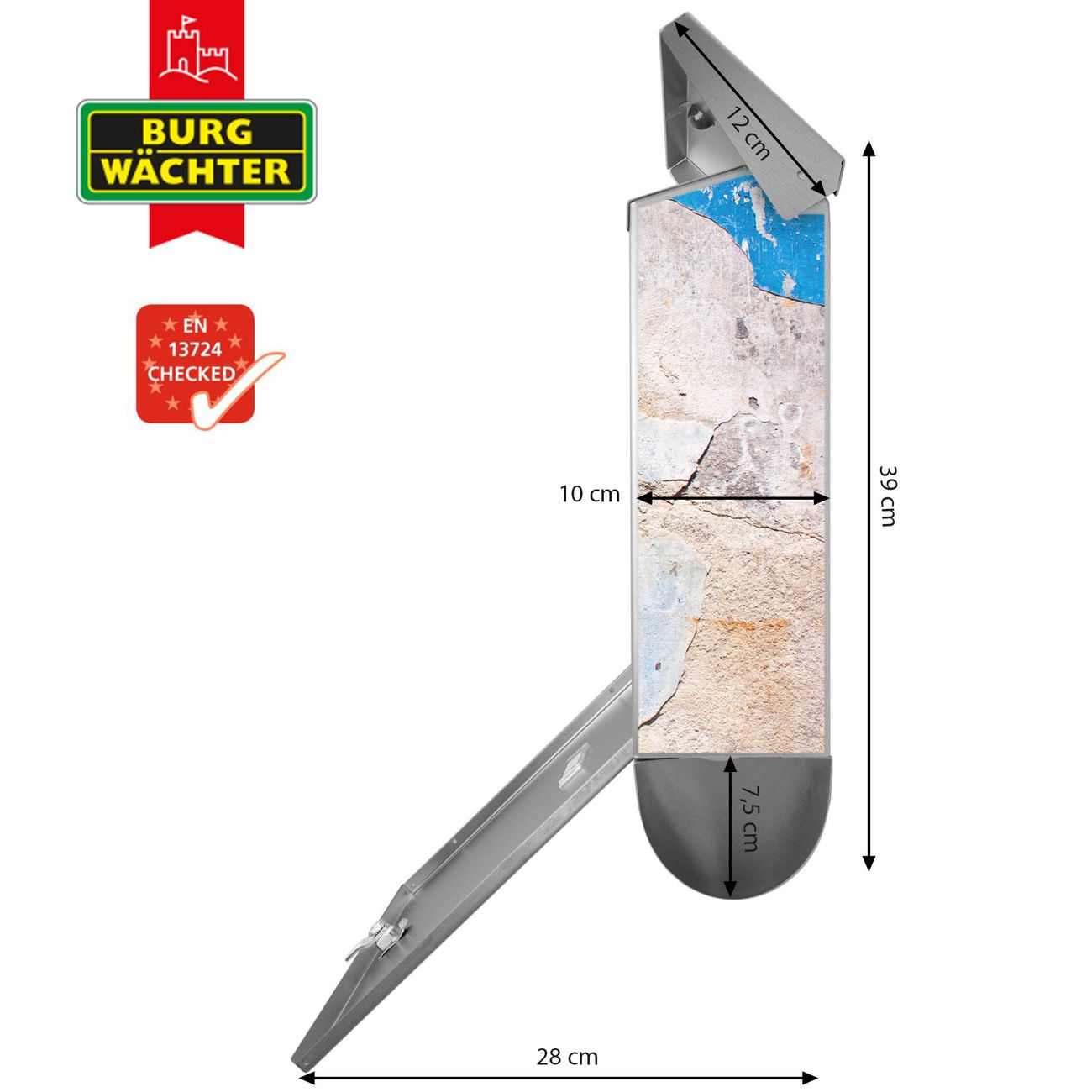 Der BURG-WÄCHTER Edelstahl Briefkasten mit Motiv Gebrochene Wand und Zeitungsrolle bietet Ihnen mit seinem Fassungsvermögen genügend Platz auch für große A4 Sendungen und Zeitschriften. Das integrierte Regendach schützt Ihre Post vor dem Eindringen von Regen.