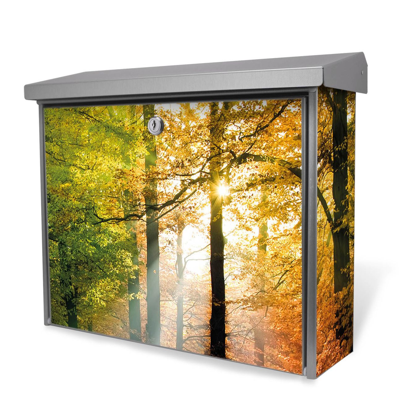 Der Postkasten mit Herbstwald Motiv hat ein sehr ansprechendes und zeitloses Design. Unsere Motivpalette hält jede Menge Varianten bereit, ob klassisch, modern, verspielt oder witzig - für jeden haben wir das passende Motiv parat. Der Briefkasten ist das Aushängeschild Ihres Hauses.