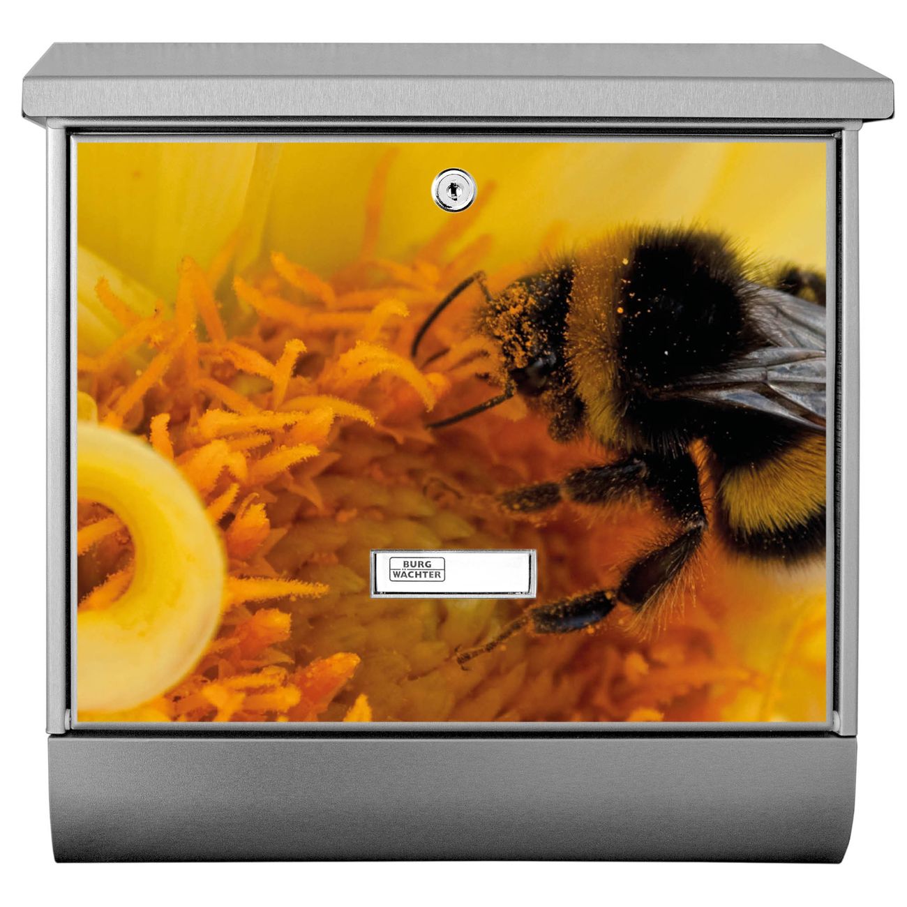 Der BURG-WÄCHTER Edelstahl Briefkasten mit Motiv Hummel und Zeitungsrolle bietet Ihnen mit seinem Fassungsvermögen genügend Platz auch für große A4 Sendungen und Zeitschriften. Das integrierte Regendach schützt Ihre Post vor dem Eindringen von Regen.