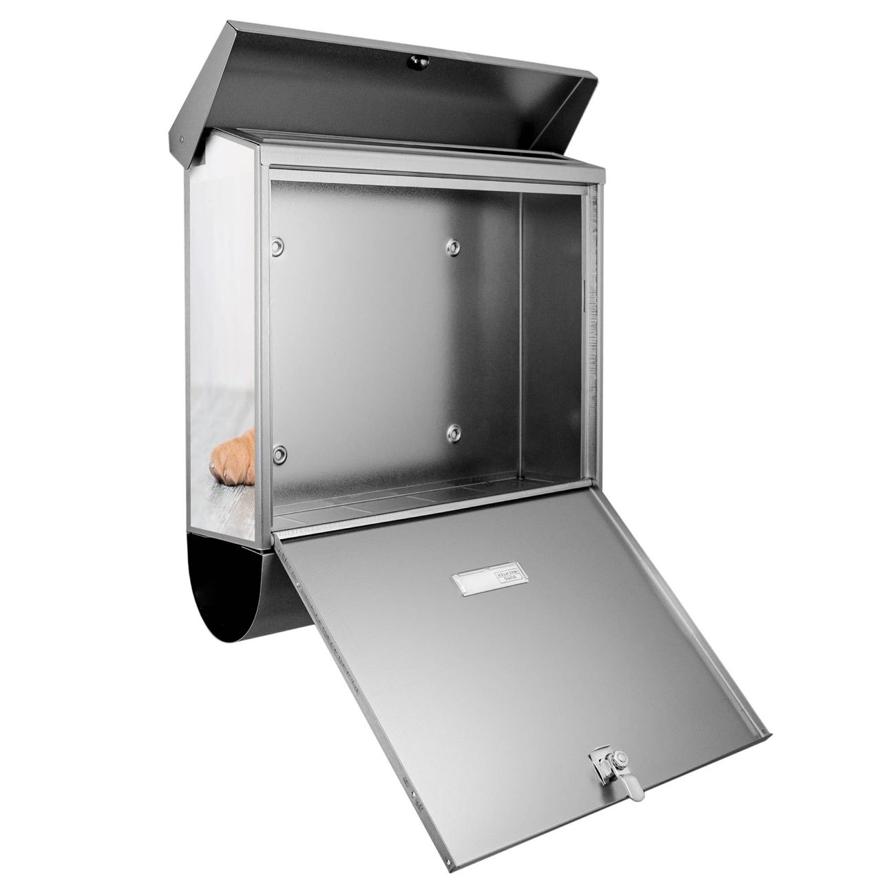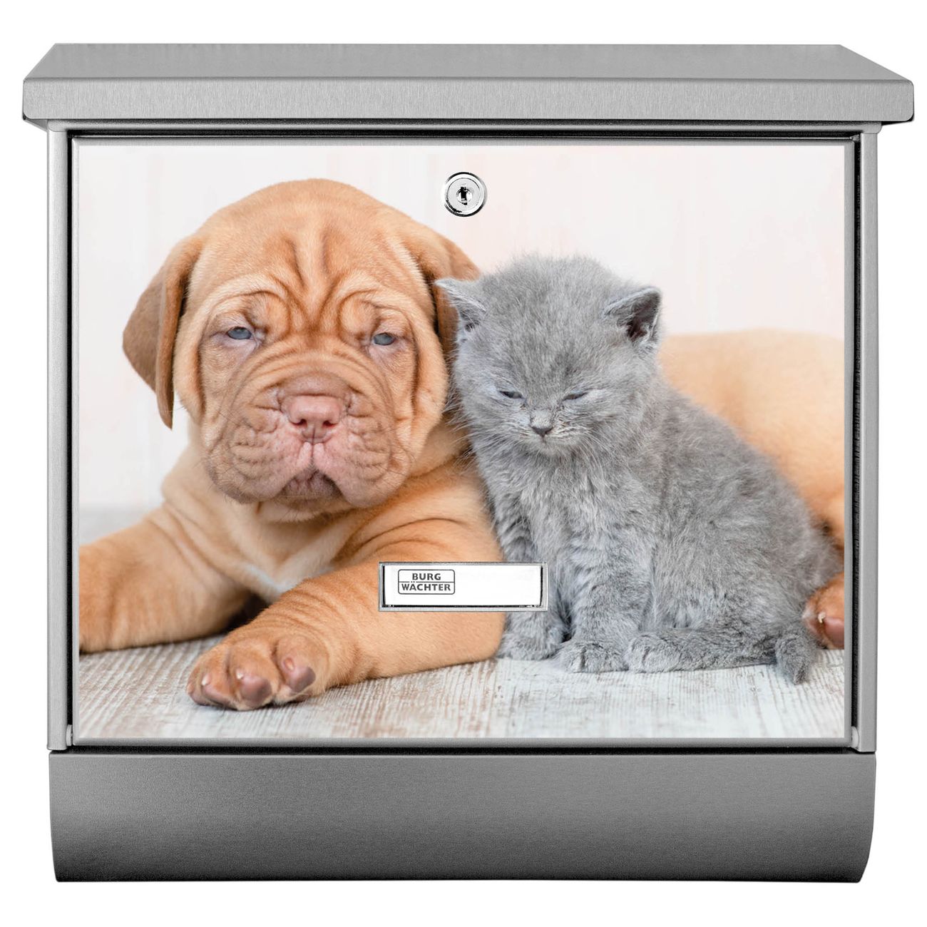 Der BURG-WÄCHTER Edelstahl Briefkasten mit Motiv Hund und Katze und Zeitungsrolle bietet Ihnen mit seinem Fassungsvermögen genügend Platz auch für große A4 Sendungen und Zeitschriften. Das integrierte Regendach schützt Ihre Post vor dem Eindringen von Regen.