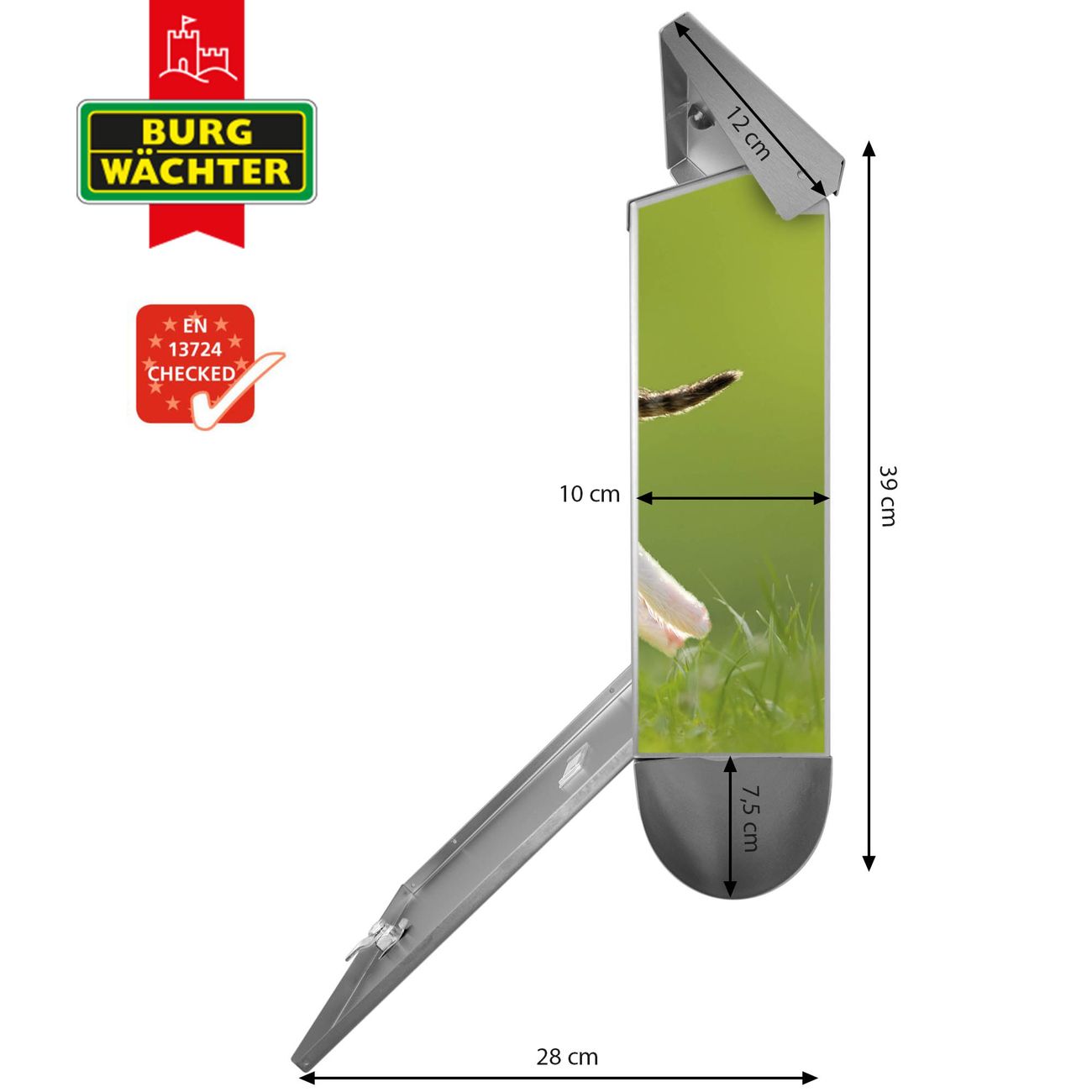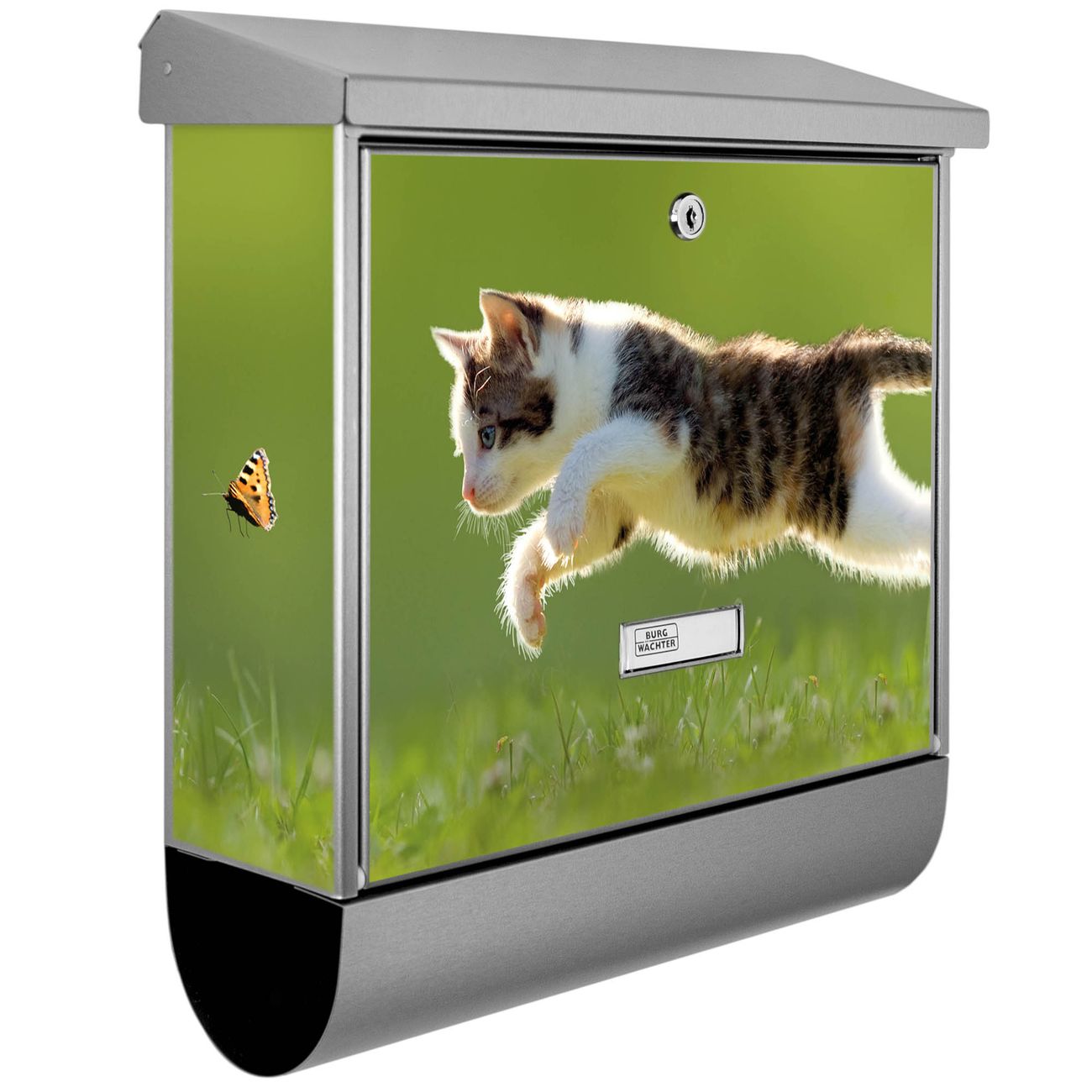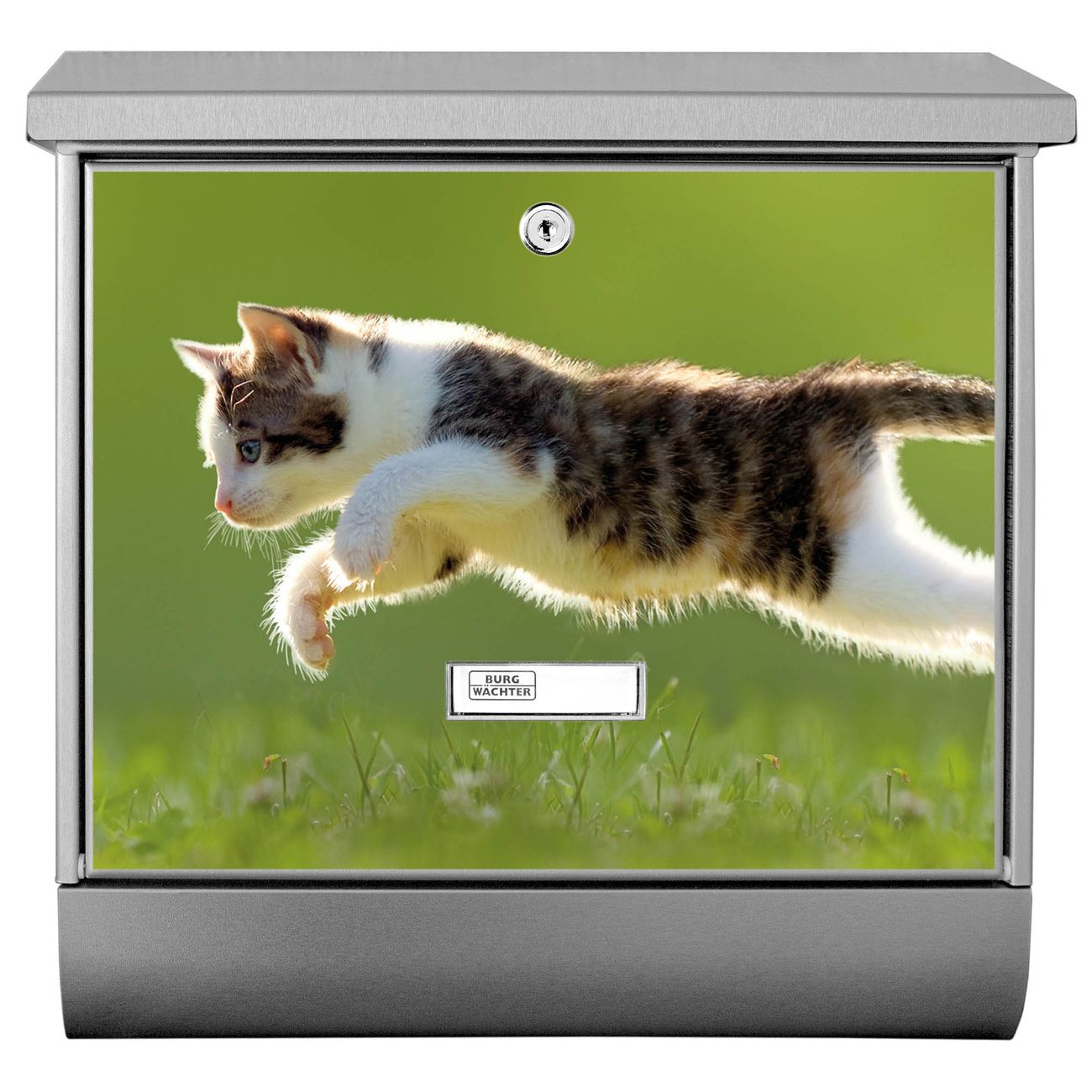 Der BURG-WÄCHTER Edelstahl Briefkasten mit Motiv Jagende Katze und Zeitungsrolle bietet Ihnen mit seinem Fassungsvermögen genügend Platz auch für große A4 Sendungen und Zeitschriften. Das integrierte Regendach schützt Ihre Post vor dem Eindringen von Regen.