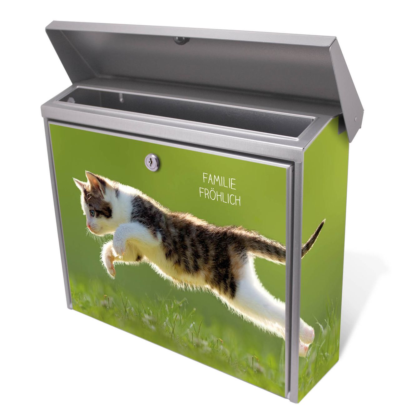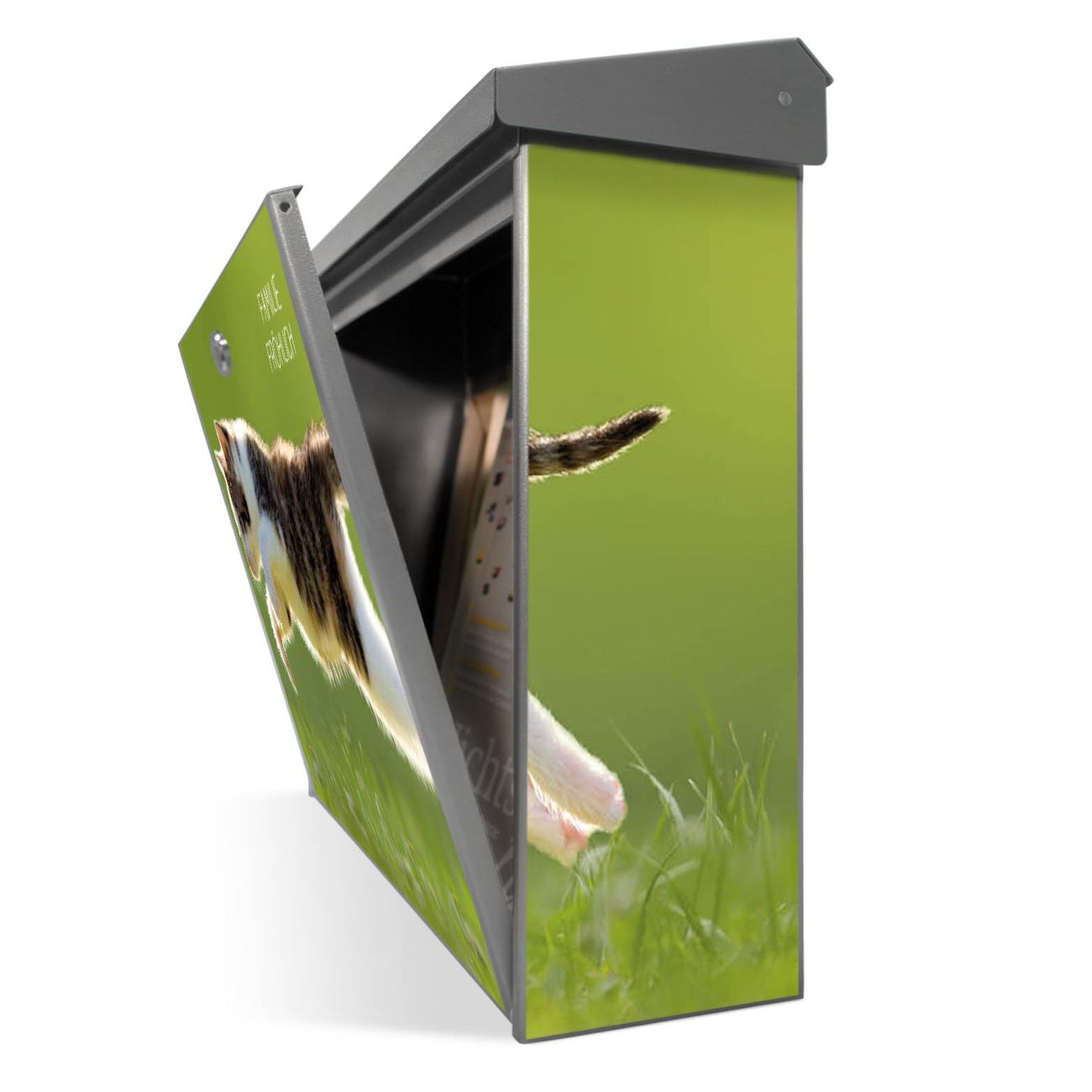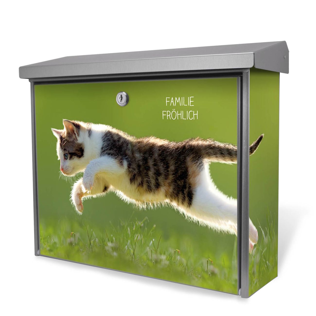 Der Postkasten mit Jagende Katze Motiv hat ein sehr ansprechendes und zeitloses Design. Unsere Motivpalette hält jede Menge Varianten bereit, ob klassisch, modern, verspielt oder witzig - für jeden haben wir das passende Motiv parat. Der Briefkasten ist das Aushängeschild Ihres Hauses.