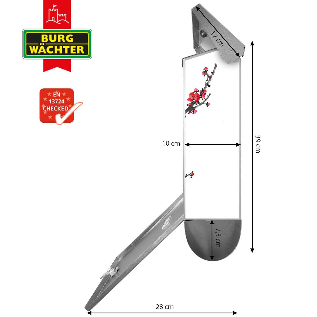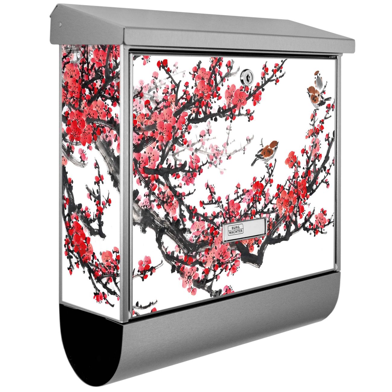Der BURG-WÄCHTER Edelstahl Briefkasten mit Motiv Japanische Blüten 1 und Zeitungsrolle bietet Ihnen mit seinem Fassungsvermögen genügend Platz auch für große A4 Sendungen und Zeitschriften. Das integrierte Regendach schützt Ihre Post vor dem Eindringen von Regen.