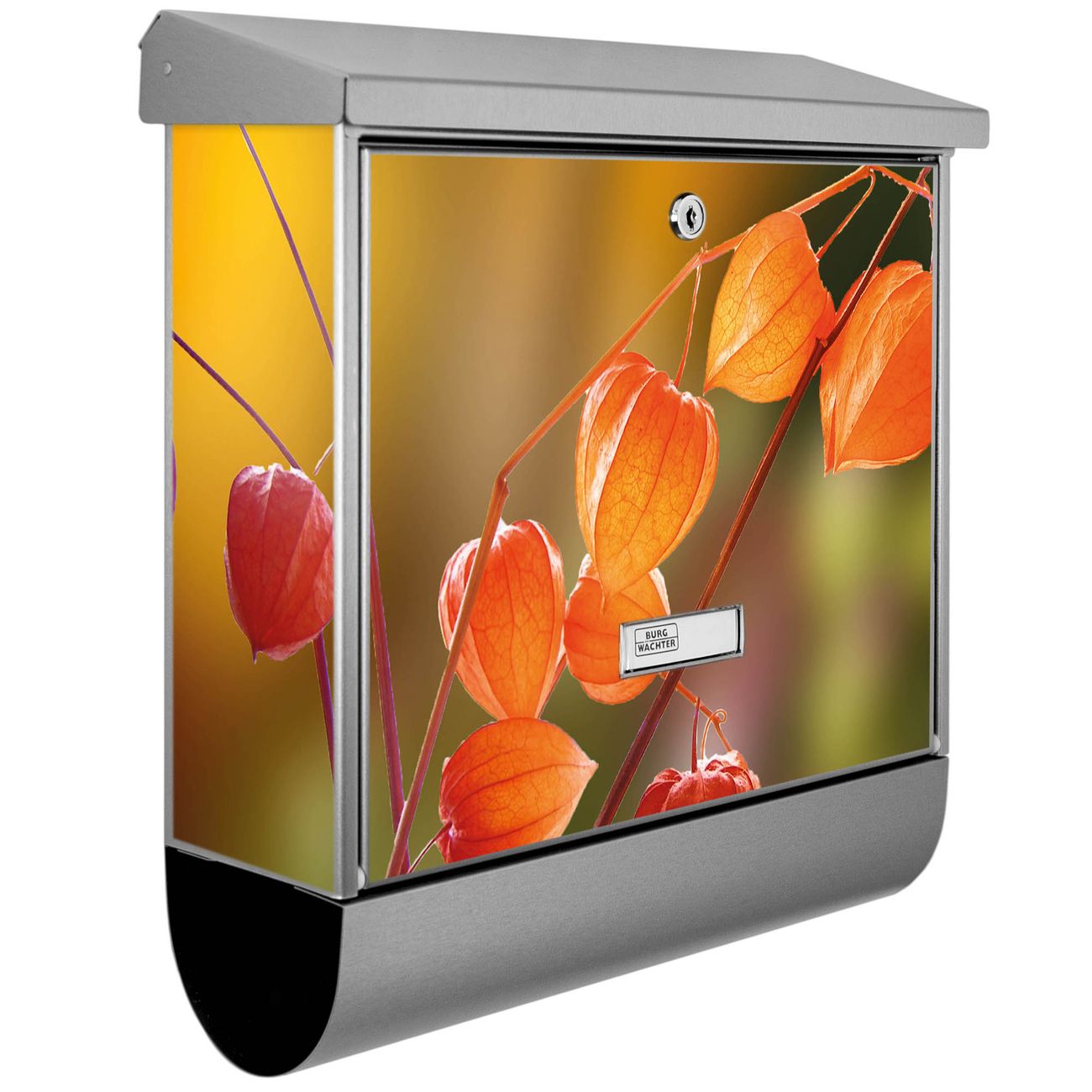 Der BURG-WÄCHTER Edelstahl Briefkasten mit Motiv Lampionblume und Zeitungsrolle bietet Ihnen mit seinem Fassungsvermögen genügend Platz auch für große A4 Sendungen und Zeitschriften. Das integrierte Regendach schützt Ihre Post vor dem Eindringen von Regen.