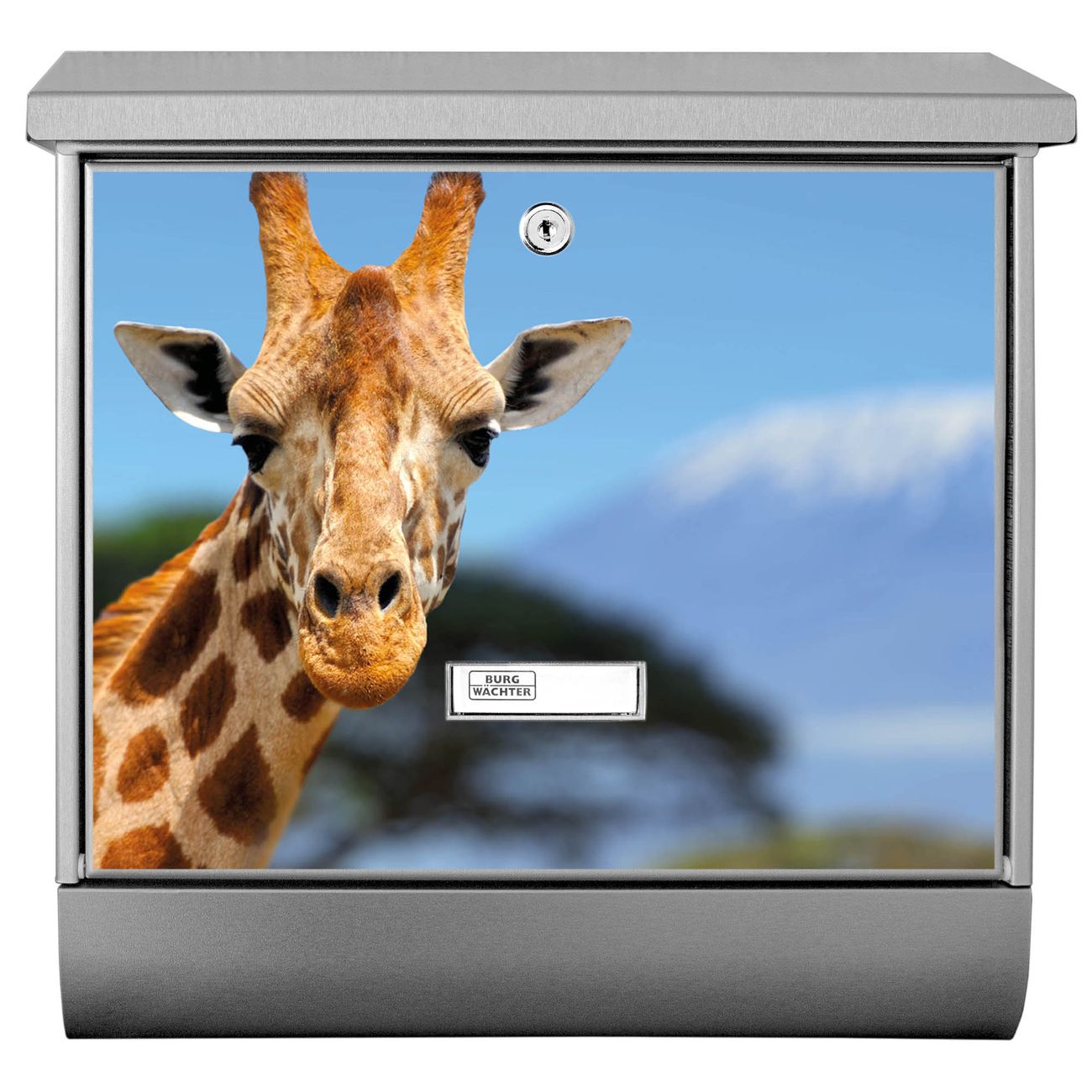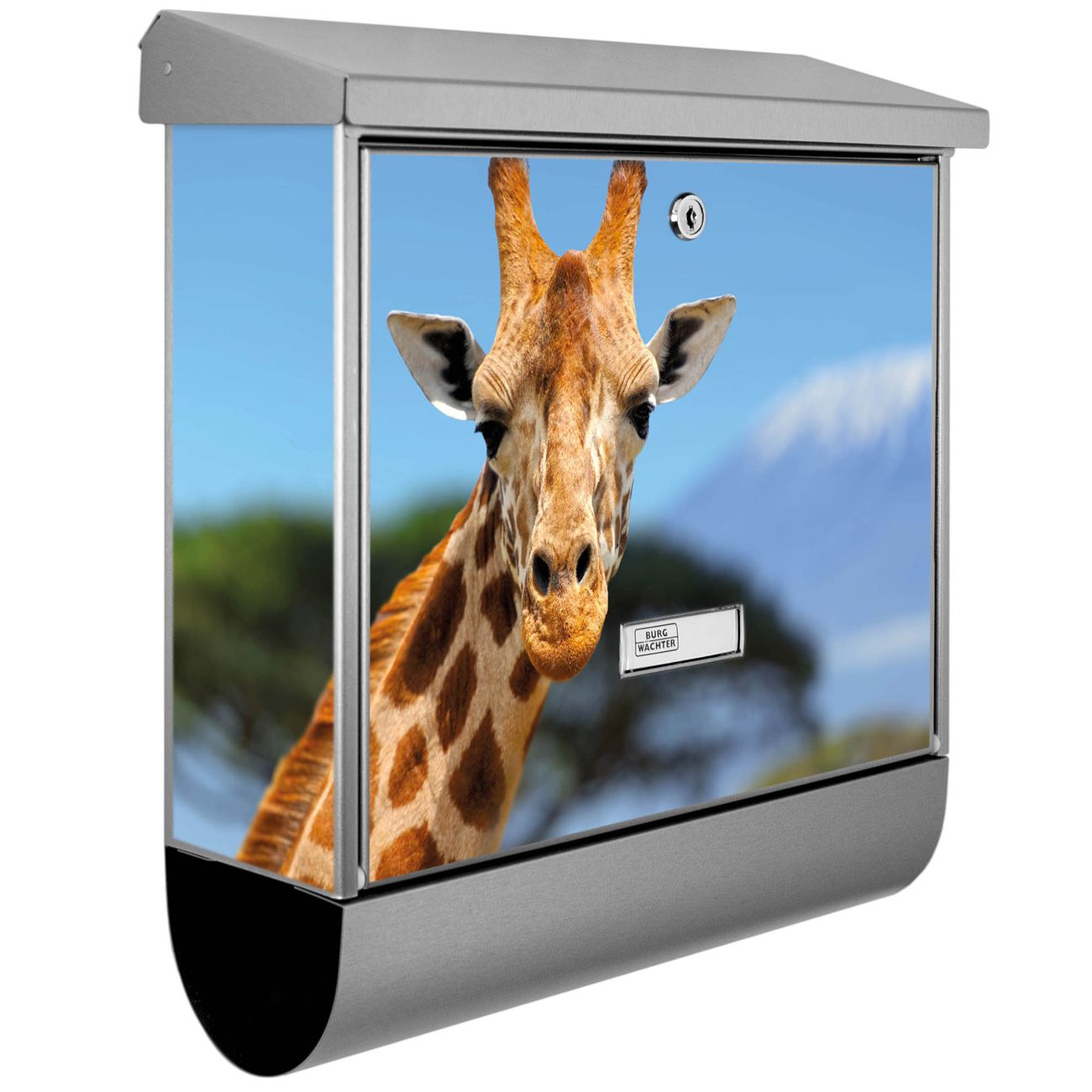 Der BURG-WÄCHTER Edelstahl Briefkasten mit Motiv Miss Kilimandscharo und Zeitungsrolle bietet Ihnen mit seinem Fassungsvermögen genügend Platz auch für große A4 Sendungen und Zeitschriften. Das integrierte Regendach schützt Ihre Post vor dem Eindringen von Regen.