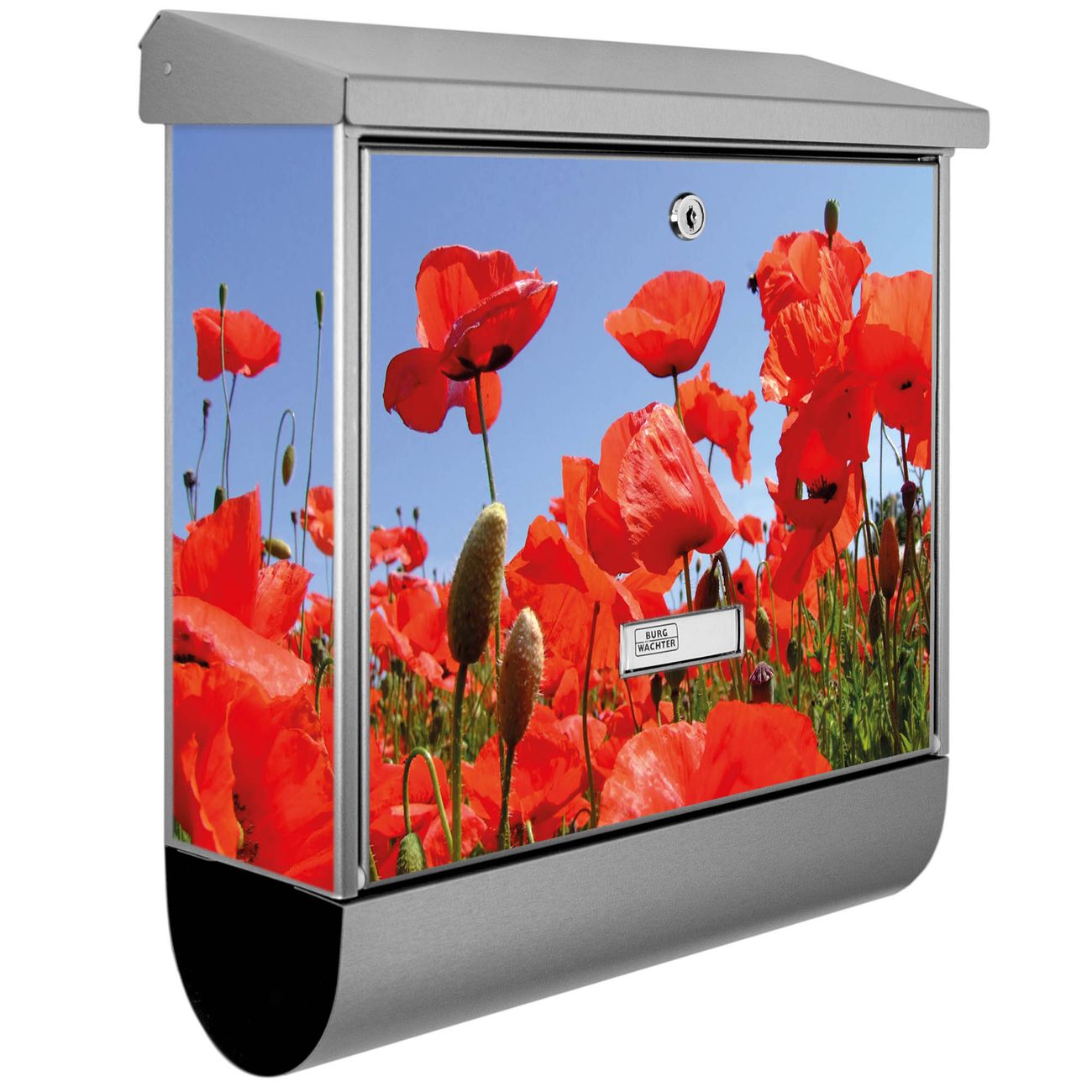 Der BURG-WÄCHTER Edelstahl Briefkasten mit Motiv Mohnblumen und Zeitungsrolle bietet Ihnen mit seinem Fassungsvermögen genügend Platz auch für große A4 Sendungen und Zeitschriften. Das integrierte Regendach schützt Ihre Post vor dem Eindringen von Regen.