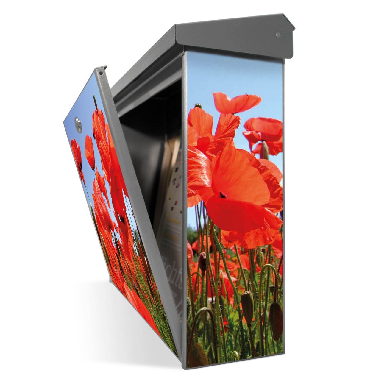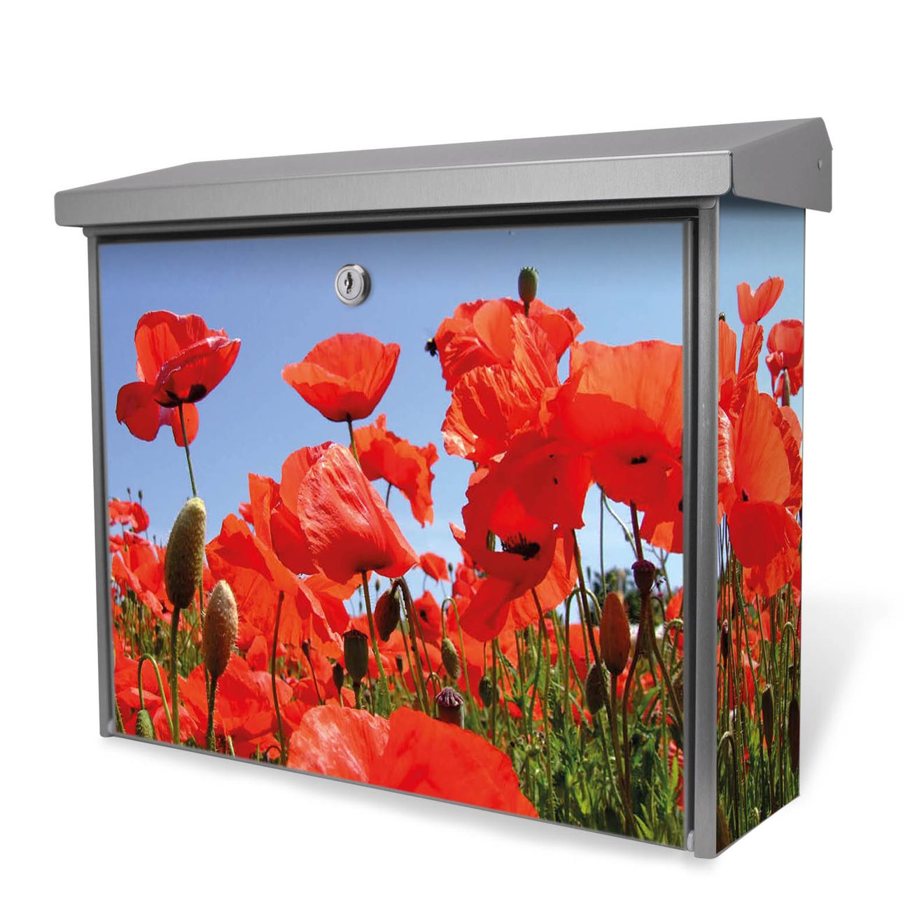 Der Postkasten mit Mohnblumen Motiv hat ein sehr ansprechendes und zeitloses Design. Unsere Motivpalette hält jede Menge Varianten bereit, ob klassisch, modern, verspielt oder witzig - für jeden haben wir das passende Motiv parat. Der Briefkasten ist das Aushängeschild Ihres Hauses.