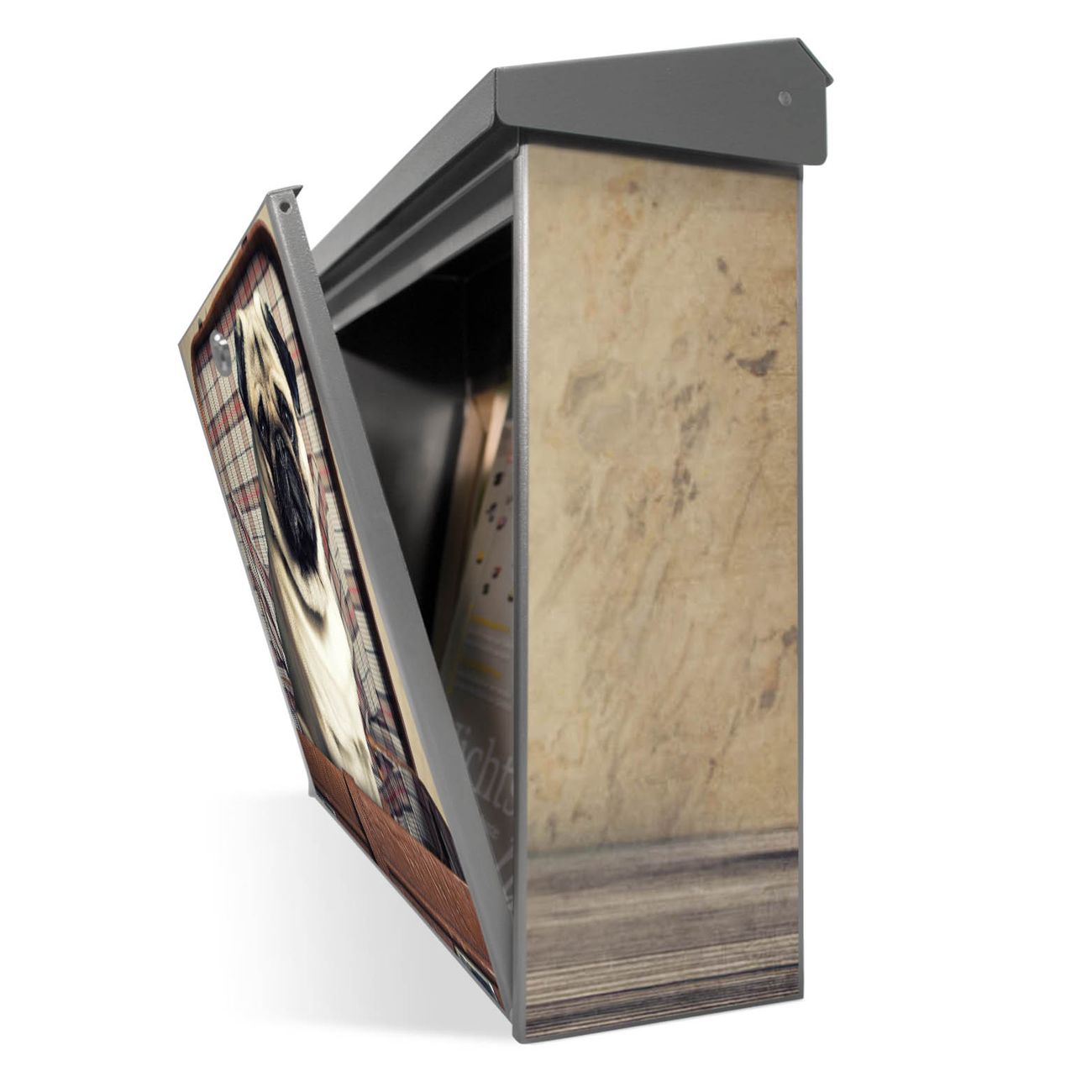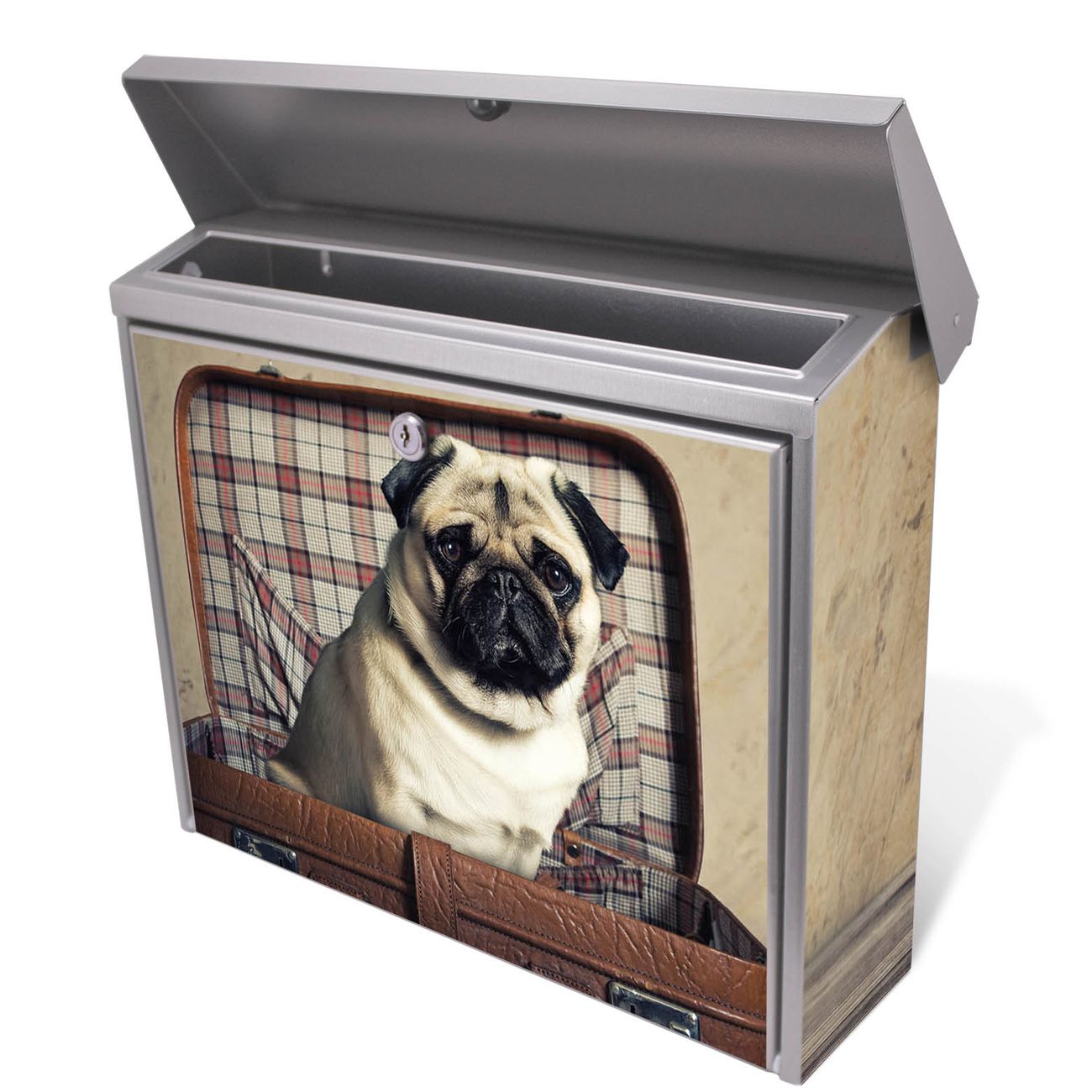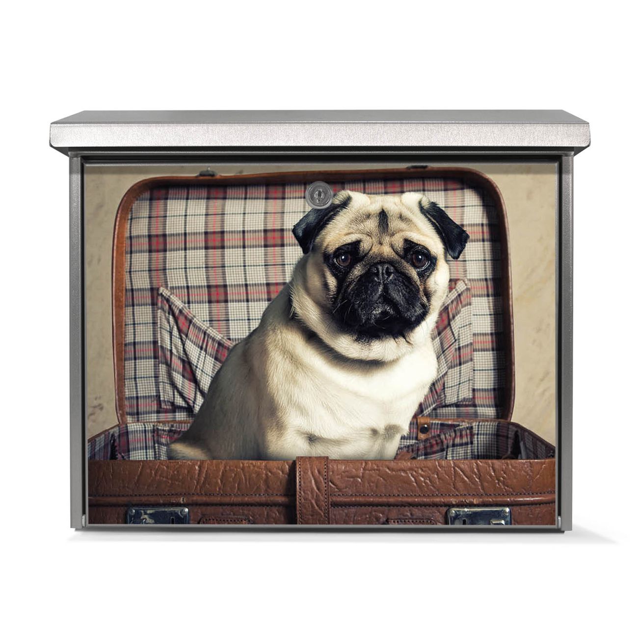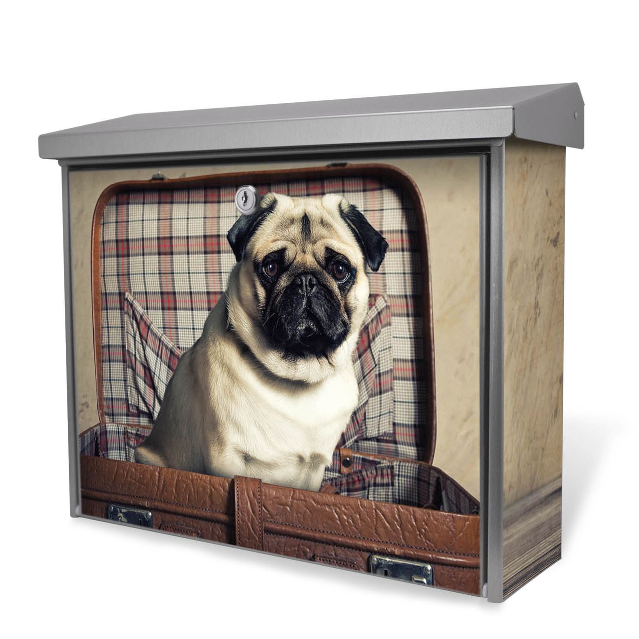 Der Postkasten mit Mops im Koffer Motiv hat ein sehr ansprechendes und zeitloses Design. Unsere Motivpalette hält jede Menge Varianten bereit, ob klassisch, modern, verspielt oder witzig - für jeden haben wir das passende Motiv parat. Der Briefkasten ist das Aushängeschild Ihres Hauses.
