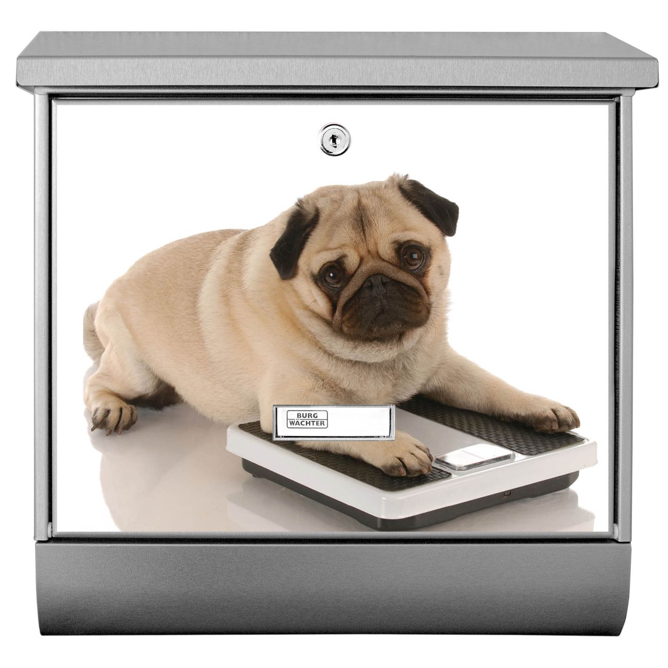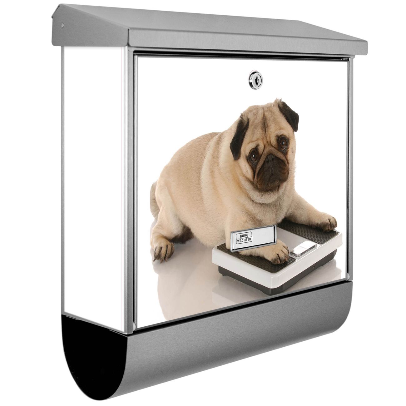 Der BURG-WÄCHTER Edelstahl Briefkasten mit Motiv Mops und Zeitungsrolle bietet Ihnen mit seinem Fassungsvermögen genügend Platz auch für große A4 Sendungen und Zeitschriften. Das integrierte Regendach schützt Ihre Post vor dem Eindringen von Regen.