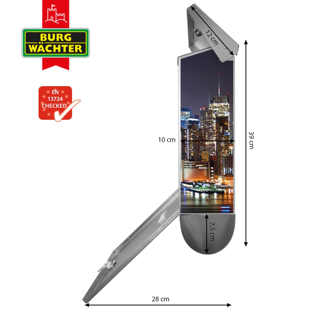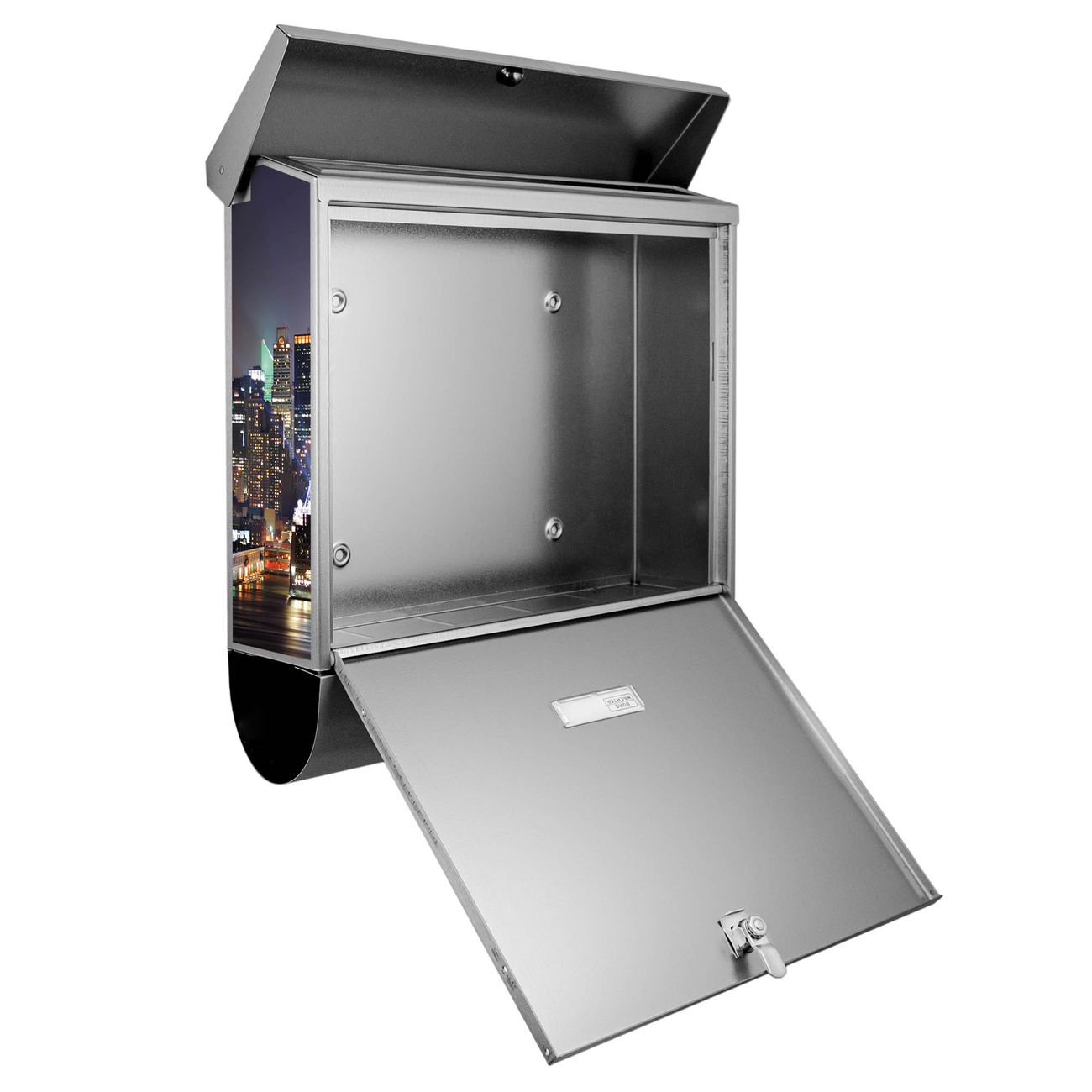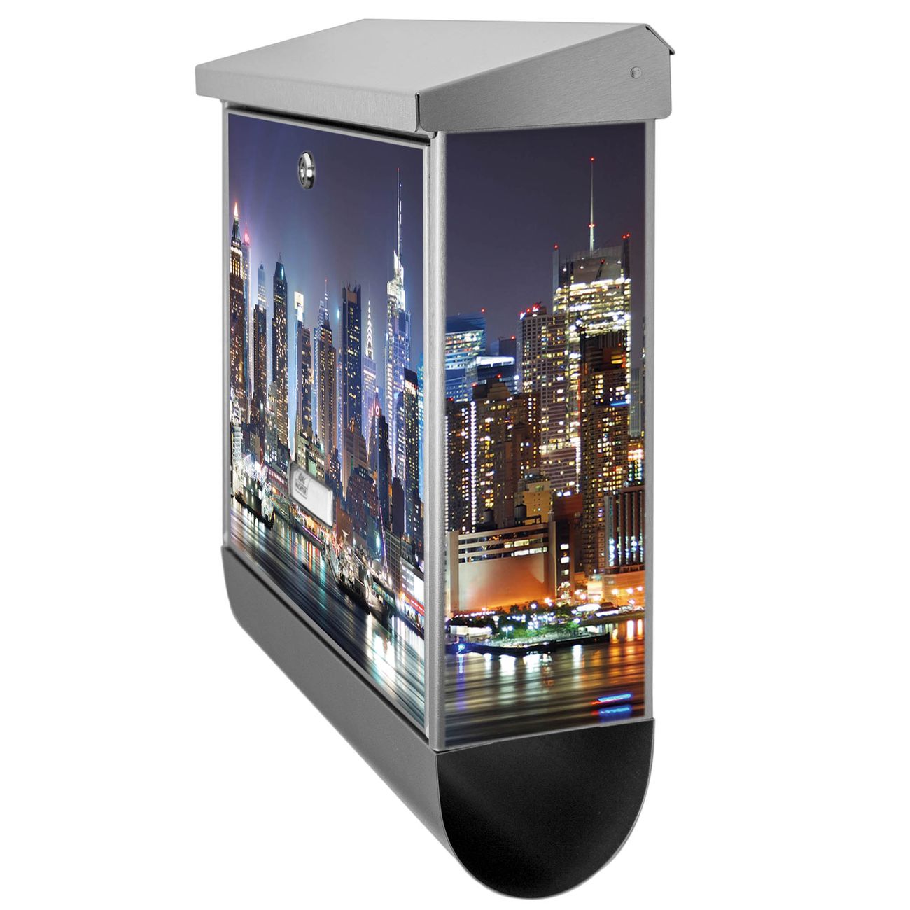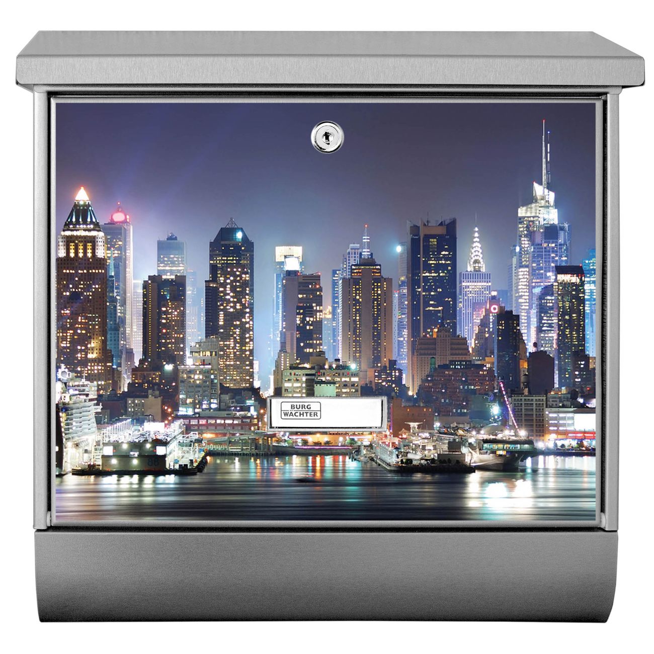 Der BURG-WÄCHTER Edelstahl Briefkasten mit Motiv New York und Zeitungsrolle bietet Ihnen mit seinem Fassungsvermögen genügend Platz auch für große A4 Sendungen und Zeitschriften. Das integrierte Regendach schützt Ihre Post vor dem Eindringen von Regen.
