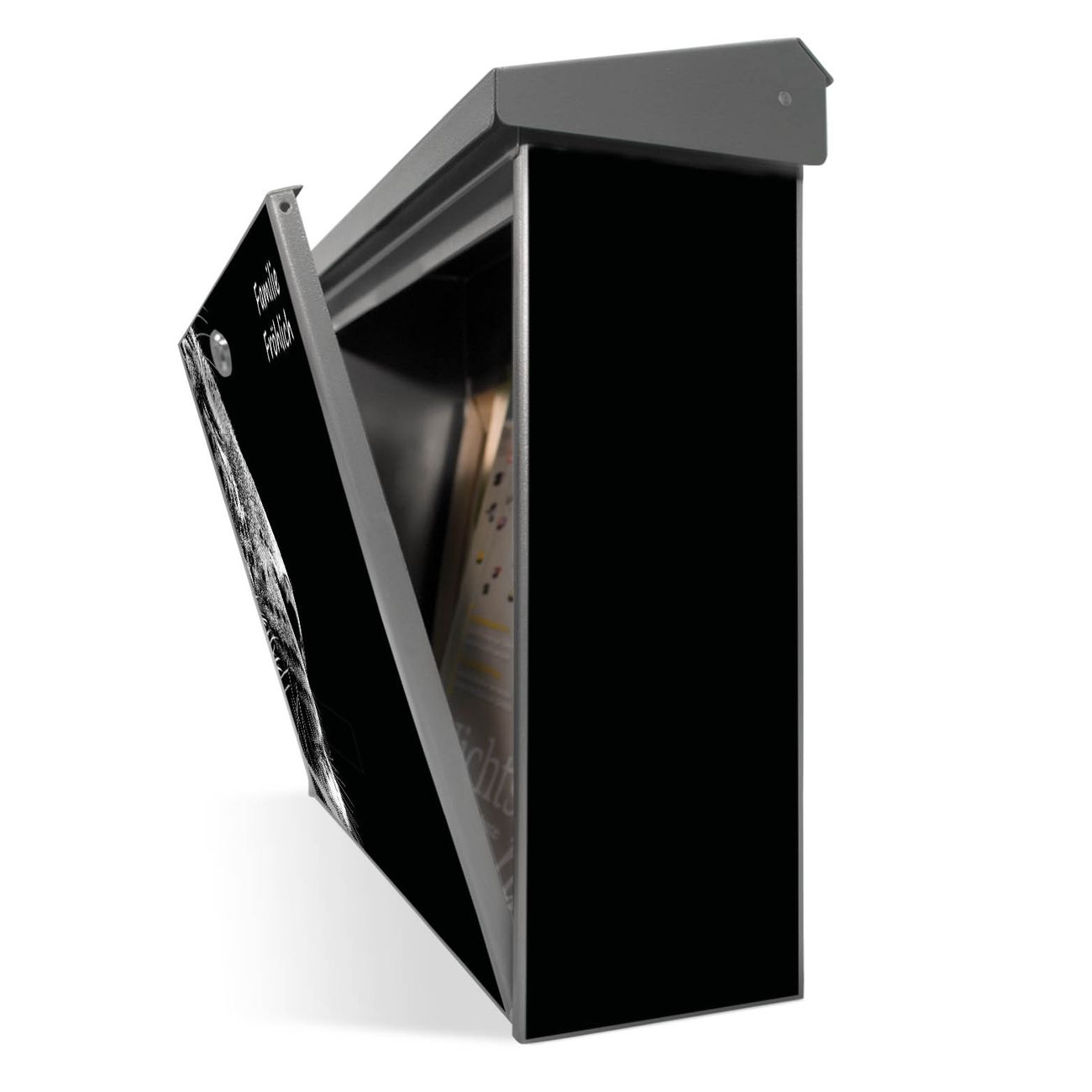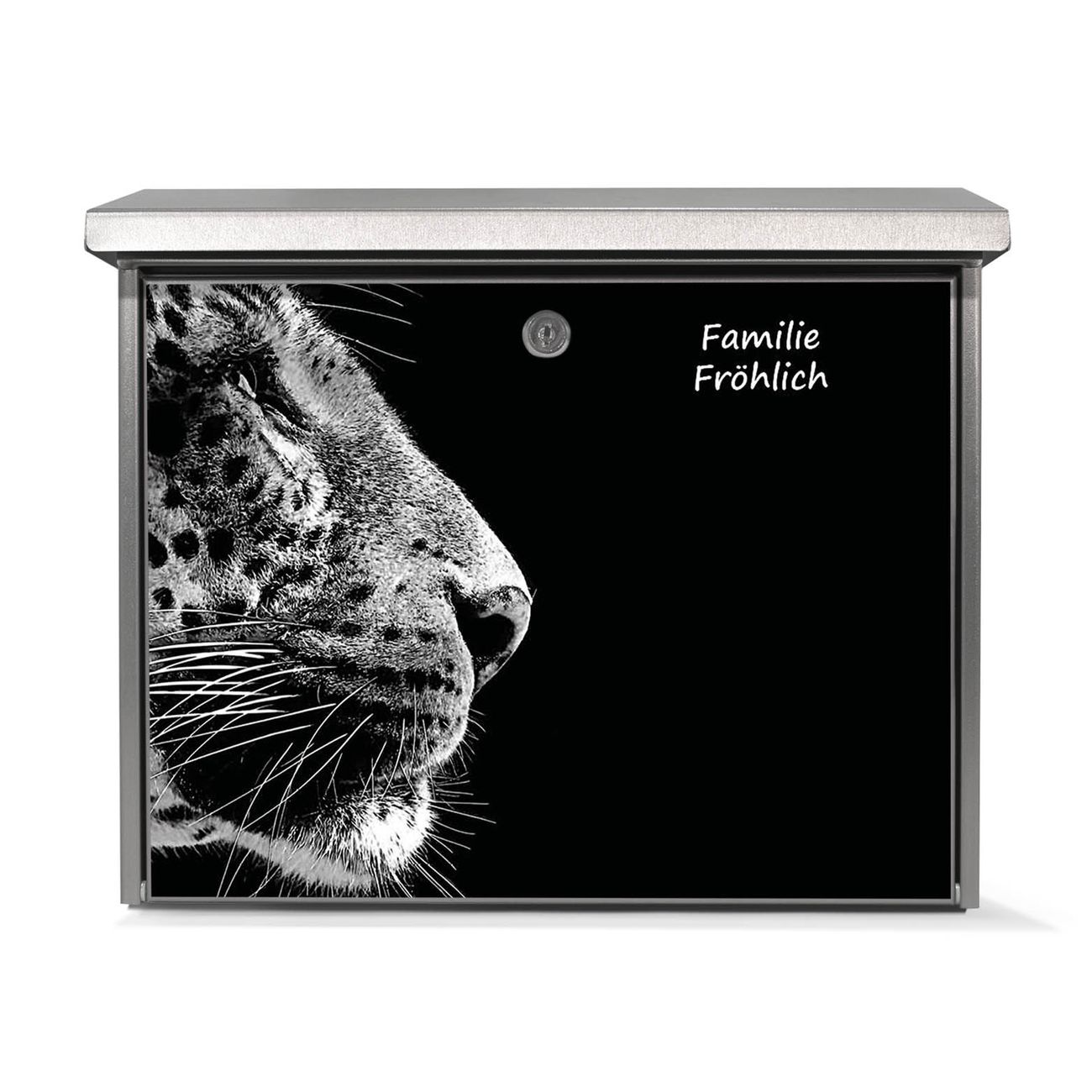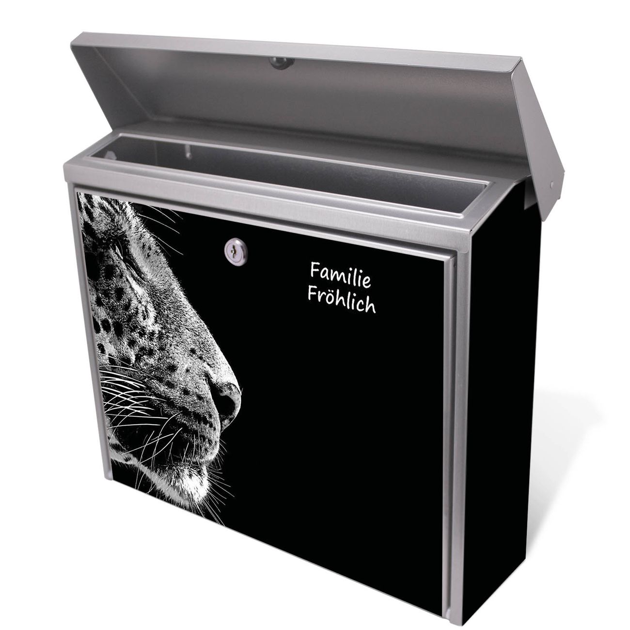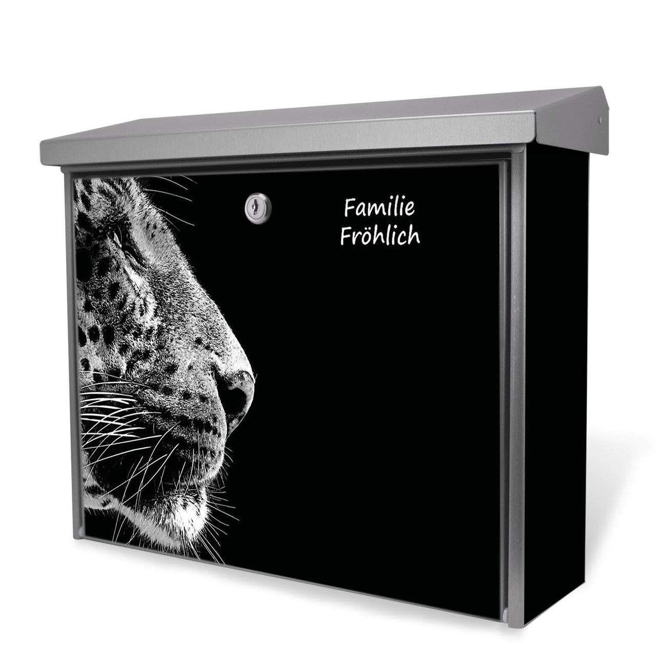 Der Briefkasten besteht aus Edelstahl, einem hochwertigen Material das witterungsbeständig ist. Das Motiv besteht aus einer wetter- und UV-festen Folie, die Ihren Briefkasten zusätzlich vor Kratzern schützt. Der Postkasten ist 31,5cm hoch, 38,5cm breit und 12cm tief. Der Briefeinwurf ist 33,2cm x 2,7cm, Format DIN C4. Der Briefkasten wird mit Montagematerial und zwei Schlüsseln geliefert.