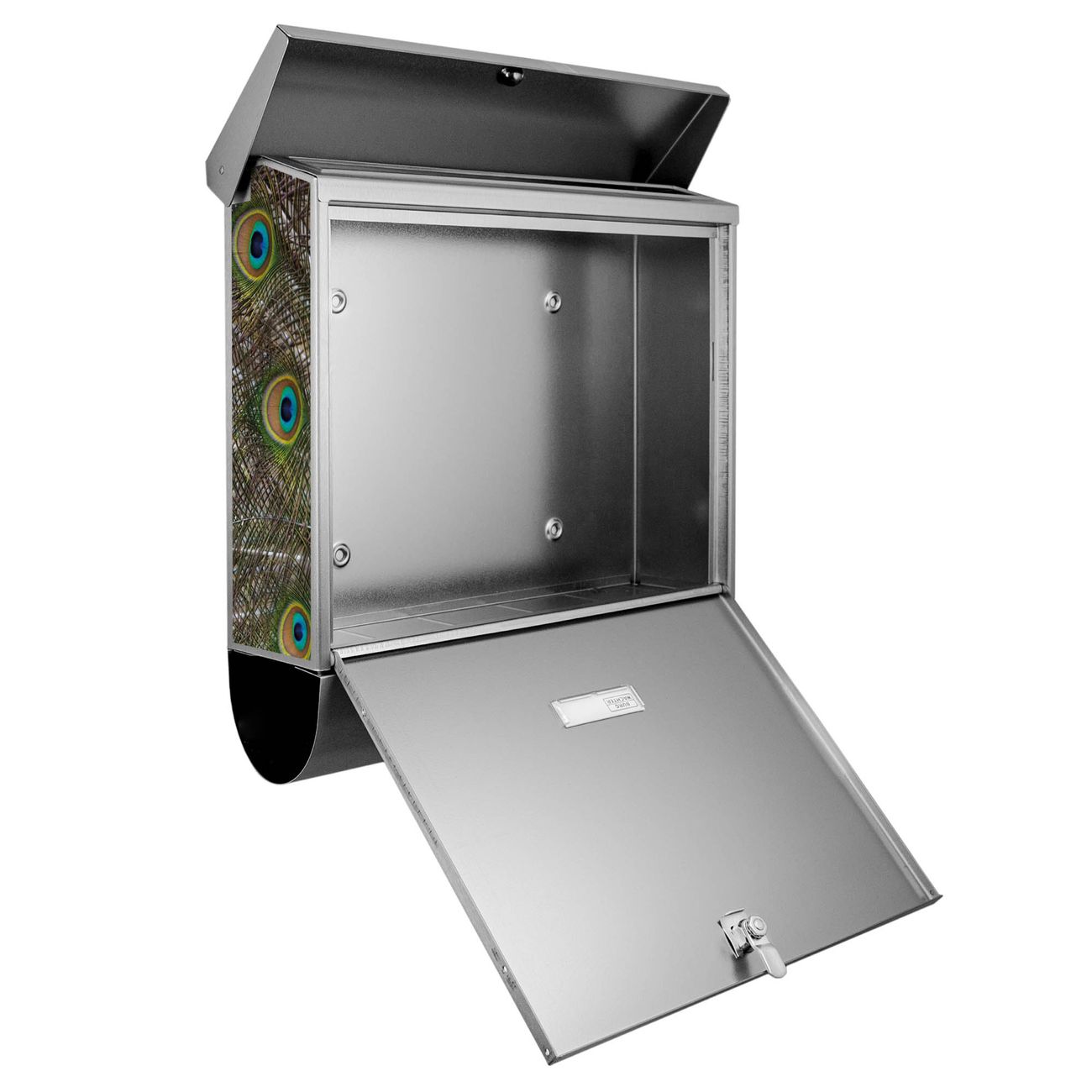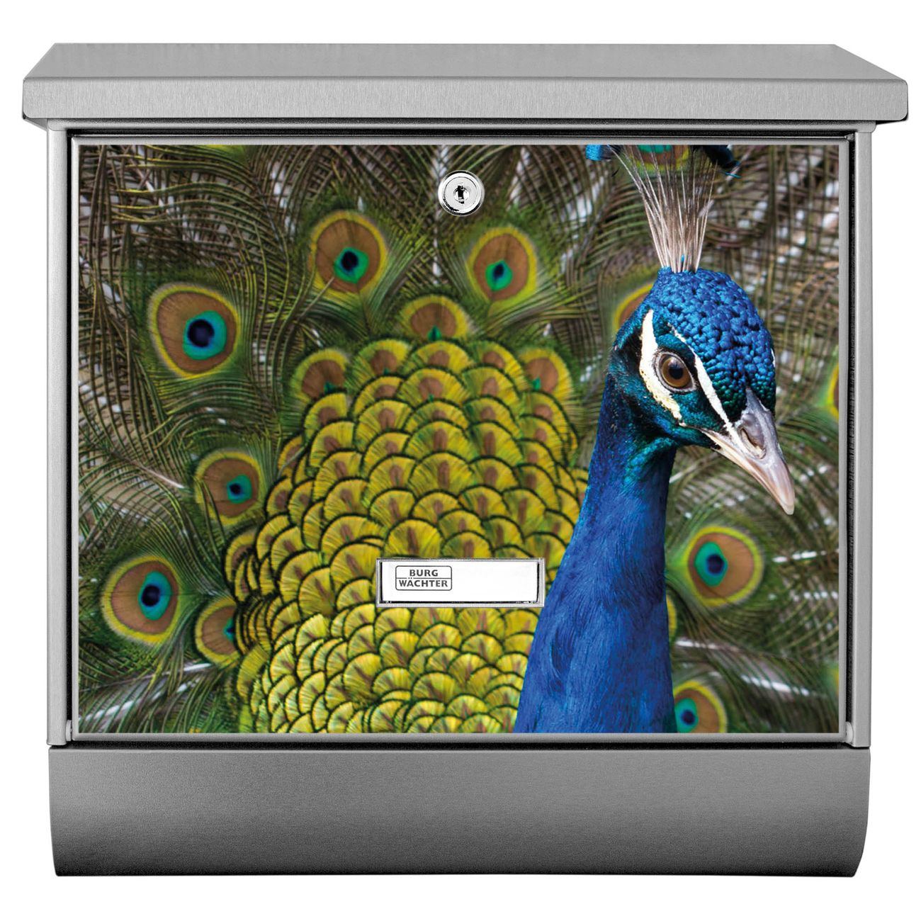 Der BURG-WÄCHTER Edelstahl Briefkasten mit Motiv Pfau und Zeitungsrolle bietet Ihnen mit seinem Fassungsvermögen genügend Platz auch für große A4 Sendungen und Zeitschriften. Das integrierte Regendach schützt Ihre Post vor dem Eindringen von Regen.