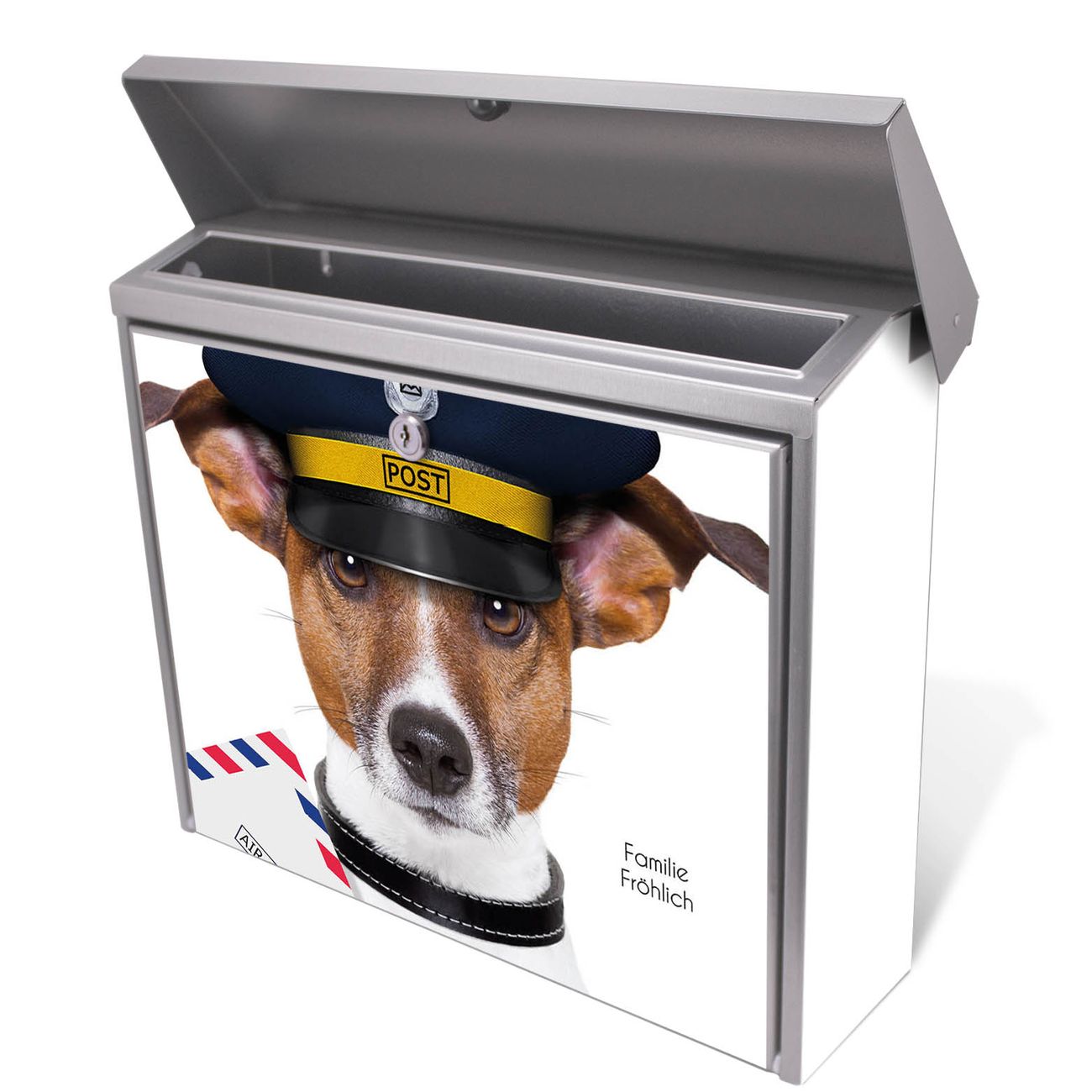 Der Postkasten mit Postbote Jack Russel Motiv hat ein sehr ansprechendes und zeitloses Design. Unsere Motivpalette hält jede Menge Varianten bereit, ob klassisch, modern, verspielt oder witzig - für jeden haben wir das passende Motiv parat. Der Briefkasten ist das Aushängeschild Ihres Hauses.