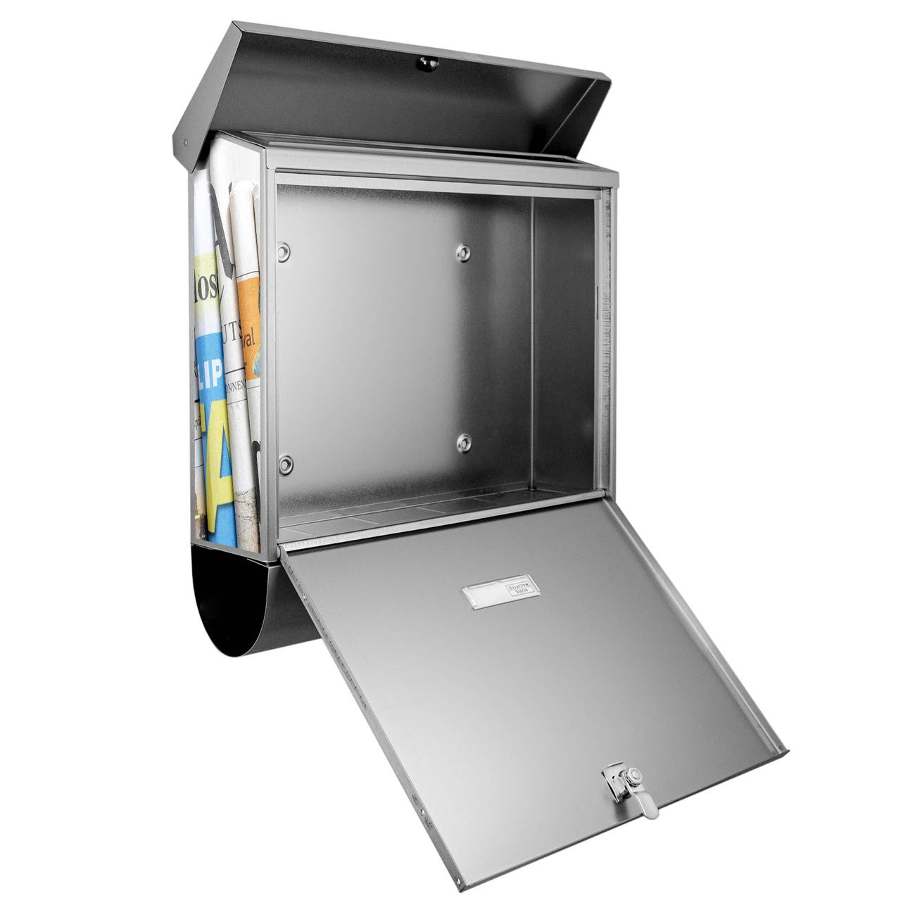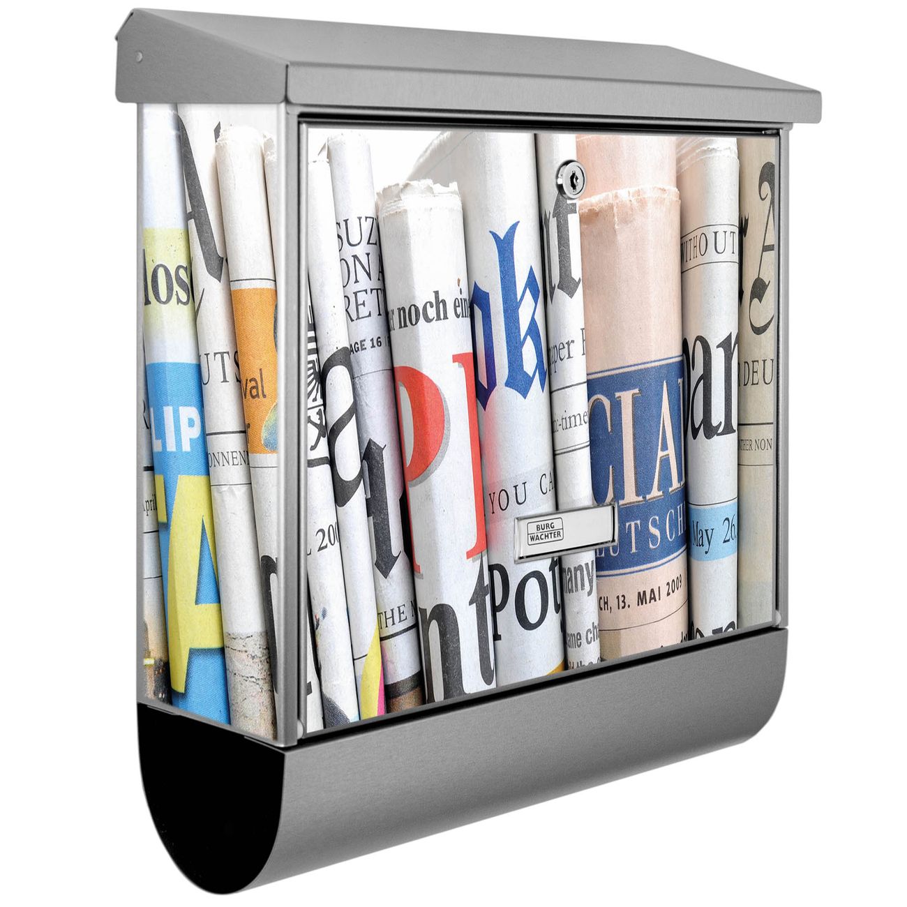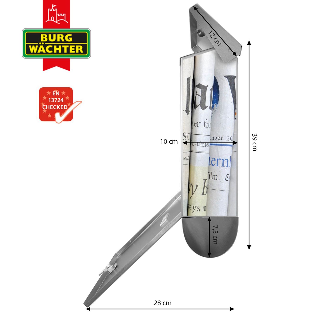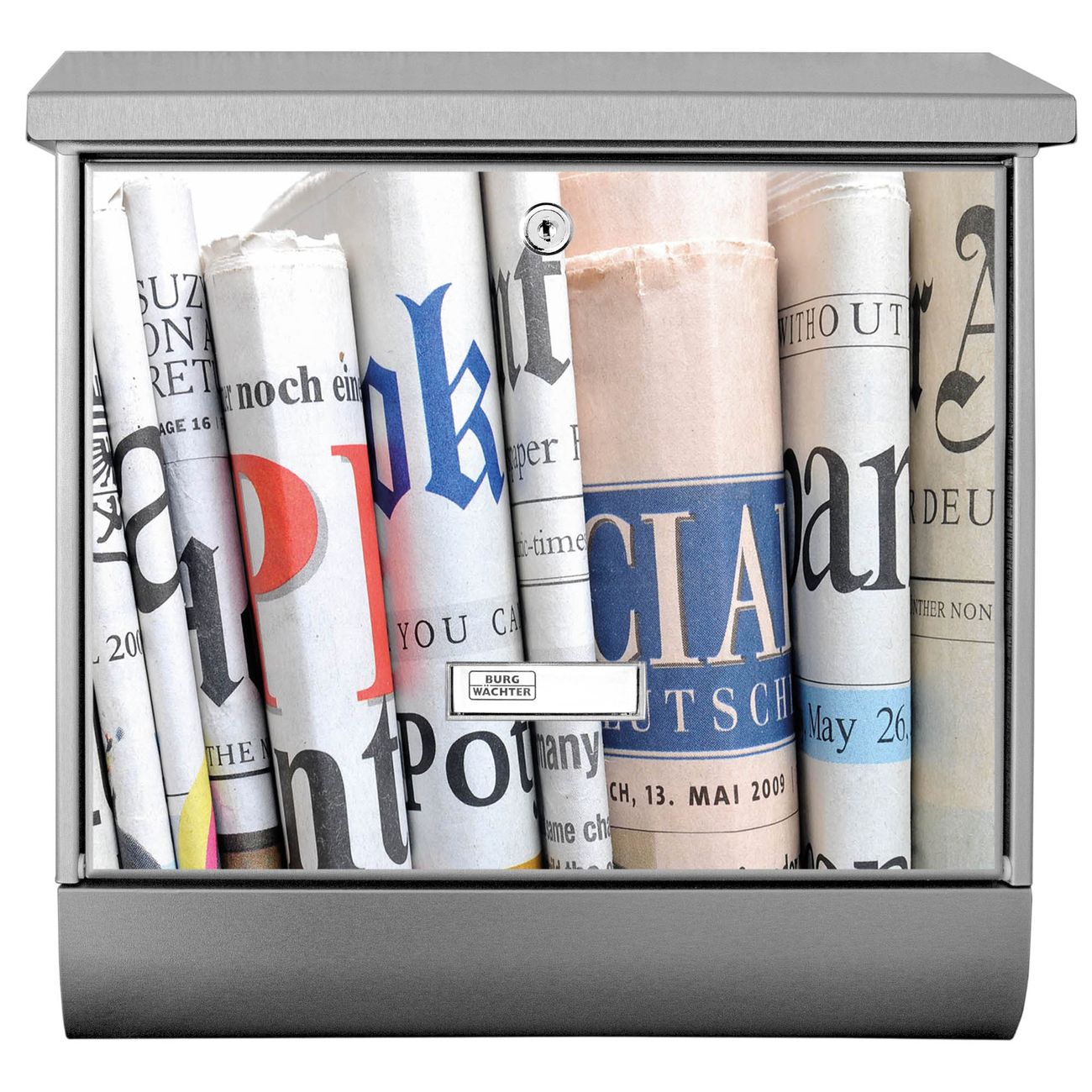Der BURG-WÄCHTER Edelstahl Briefkasten mit Motiv Presse und Zeitungsrolle bietet Ihnen mit seinem Fassungsvermögen genügend Platz auch für große A4 Sendungen und Zeitschriften. Das integrierte Regendach schützt Ihre Post vor dem Eindringen von Regen.