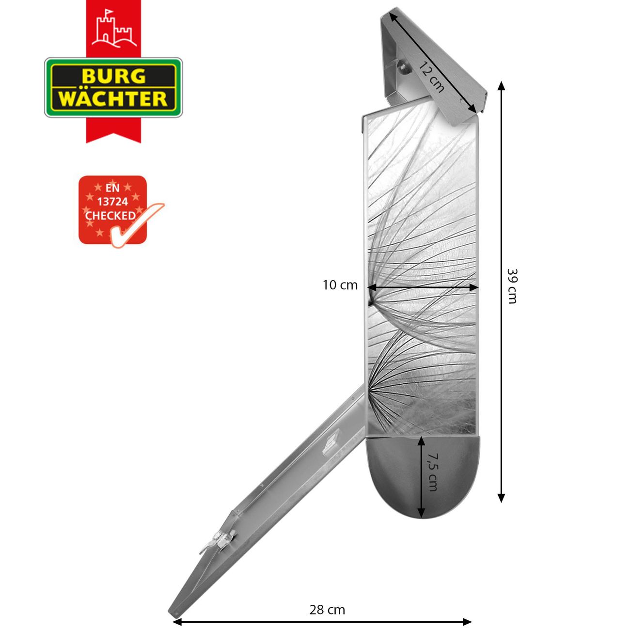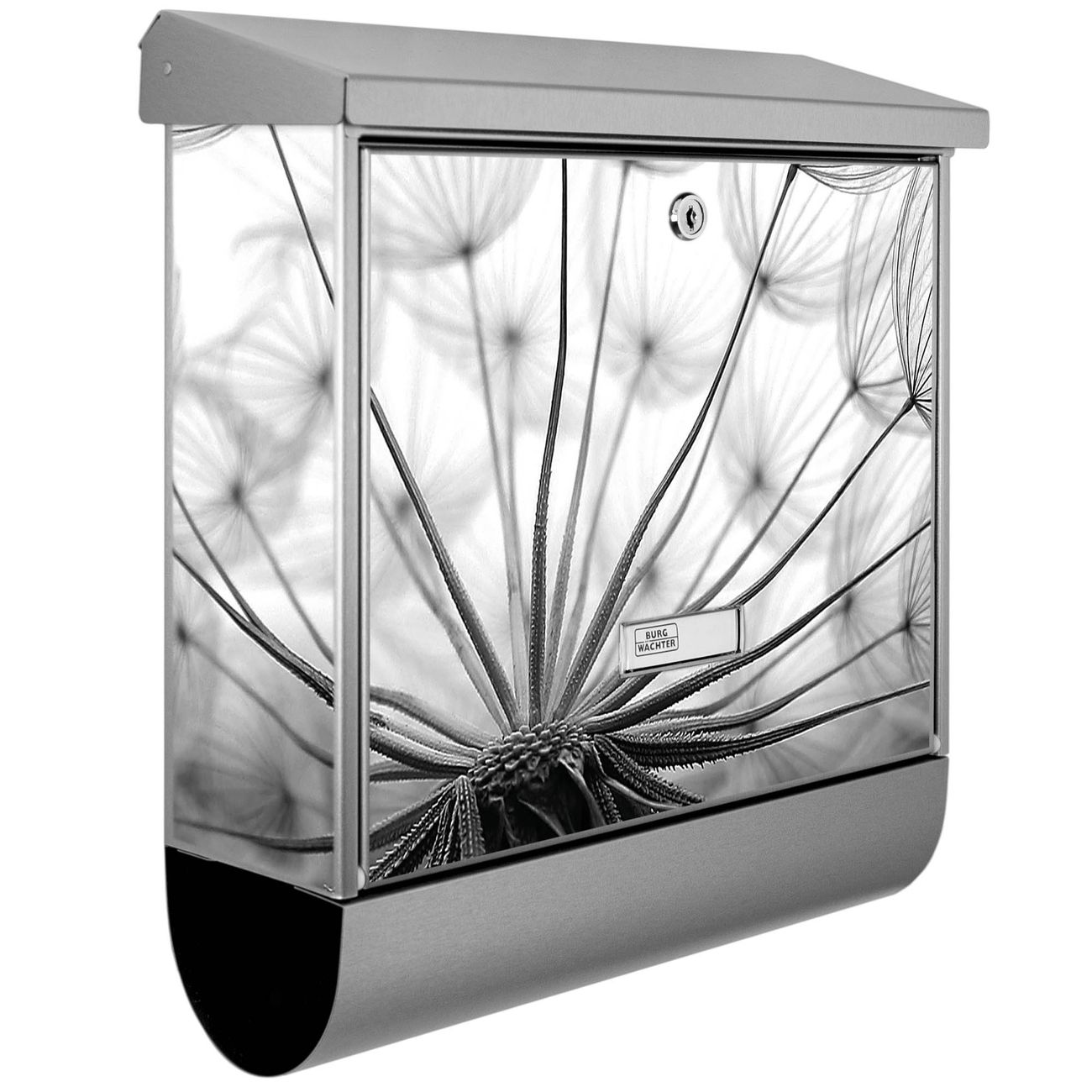 Der BURG-WÄCHTER Edelstahl Briefkasten mit Motiv Ready For Takeoff und Zeitungsrolle bietet Ihnen mit seinem Fassungsvermögen genügend Platz auch für große A4 Sendungen und Zeitschriften. Das integrierte Regendach schützt Ihre Post vor dem Eindringen von Regen.