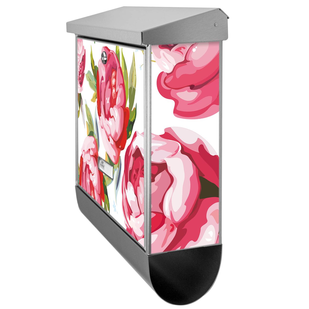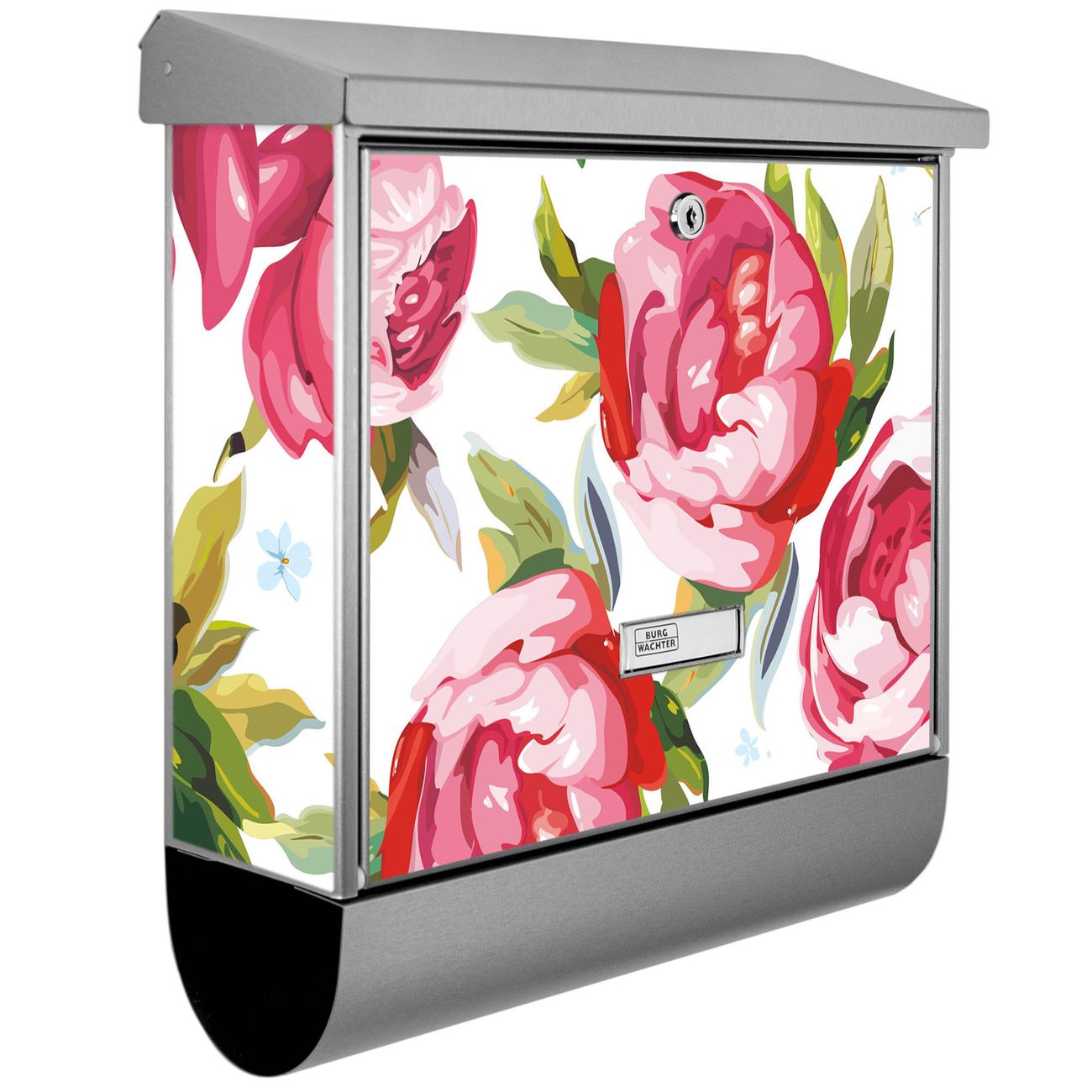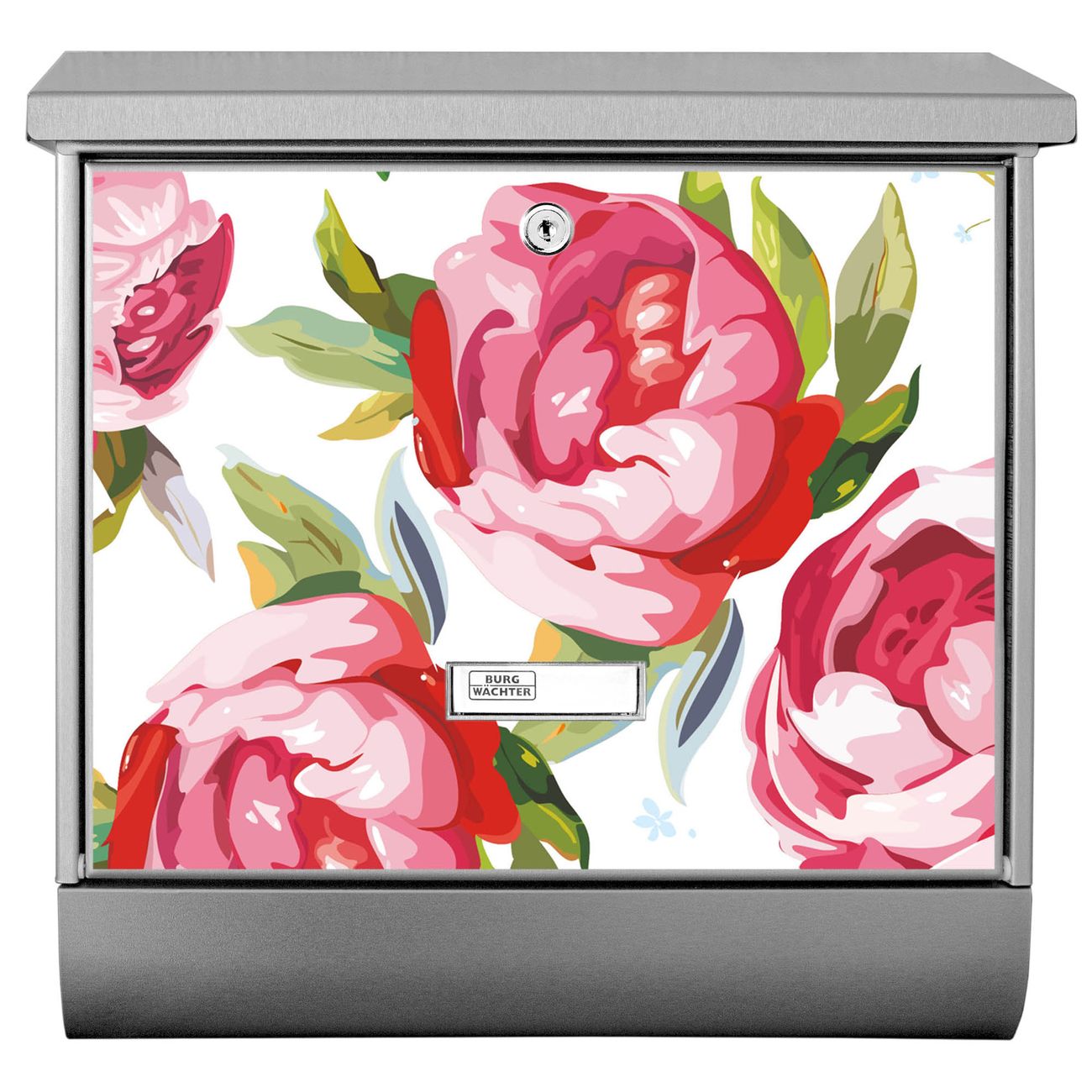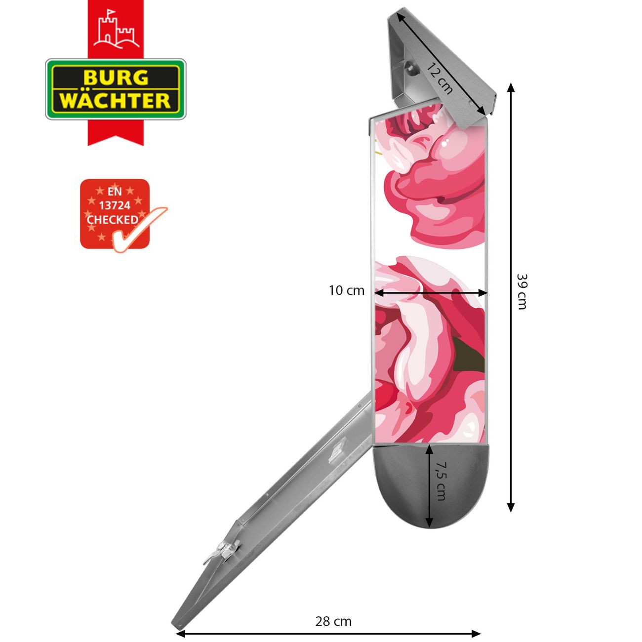 Der BURG-WÄCHTER Edelstahl Briefkasten mit Motiv Rosen Rustikal und Zeitungsrolle bietet Ihnen mit seinem Fassungsvermögen genügend Platz auch für große A4 Sendungen und Zeitschriften. Das integrierte Regendach schützt Ihre Post vor dem Eindringen von Regen.
