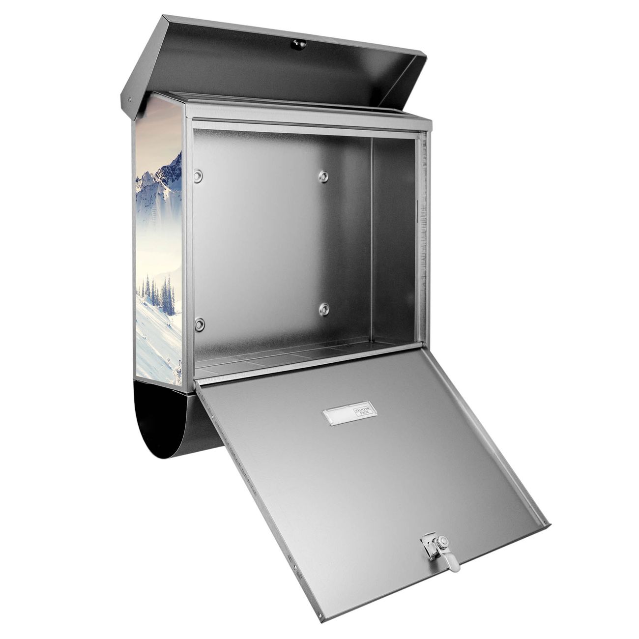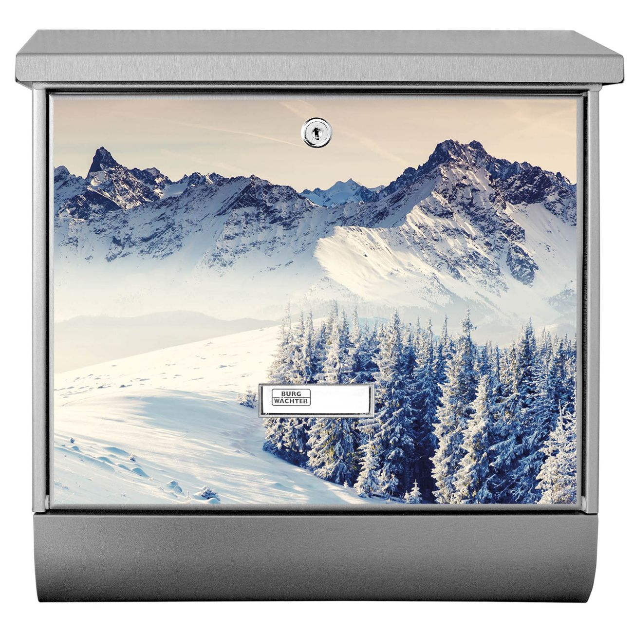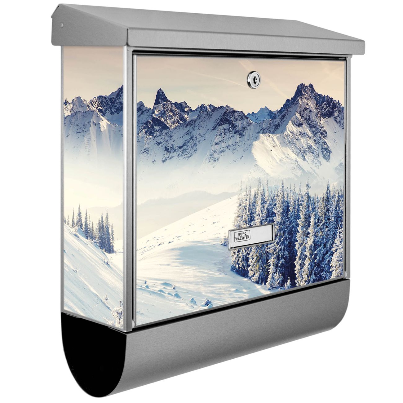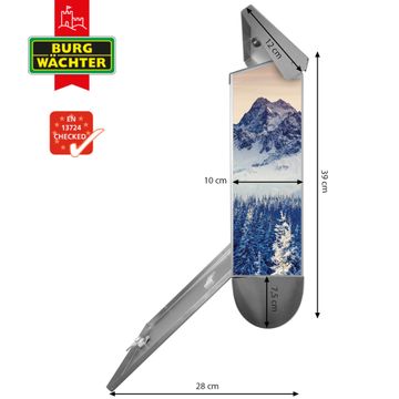 Der BURG-WÄCHTER Edelstahl Briefkasten mit Motiv Schneebedeckte Berge und Zeitungsrolle bietet Ihnen mit seinem Fassungsvermögen genügend Platz auch für große A4 Sendungen und Zeitschriften. Das integrierte Regendach schützt Ihre Post vor dem Eindringen von Regen.