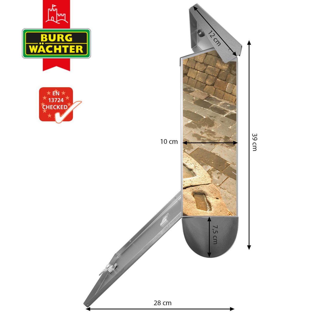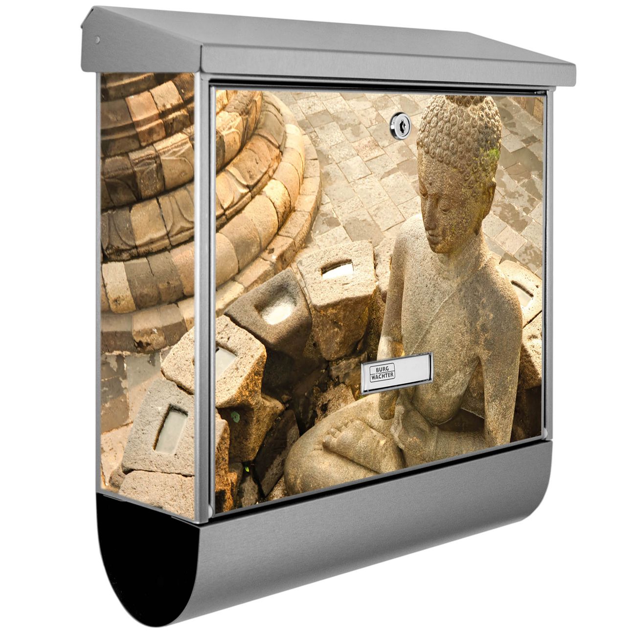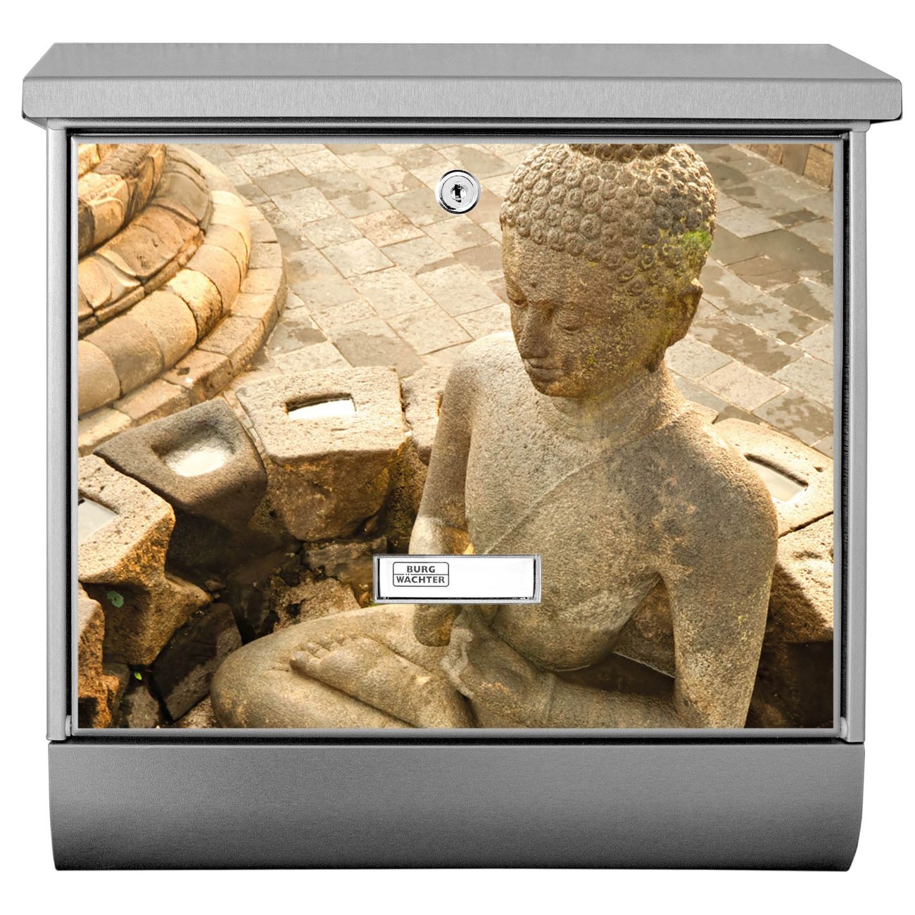 Der BURG-WÄCHTER Edelstahl Briefkasten mit Motiv Sitzender Buddha und Zeitungsrolle bietet Ihnen mit seinem Fassungsvermögen genügend Platz auch für große A4 Sendungen und Zeitschriften. Das integrierte Regendach schützt Ihre Post vor dem Eindringen von Regen.