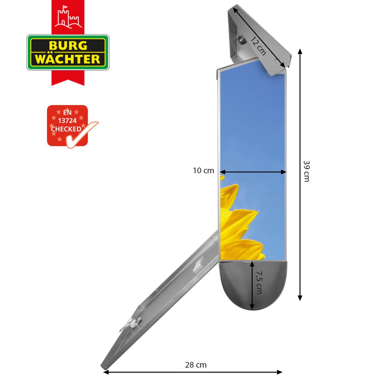 Der BURG-WÄCHTER Edelstahl Briefkasten mit Motiv Sonnenblume und Zeitungsrolle bietet Ihnen mit seinem Fassungsvermögen genügend Platz auch für große A4 Sendungen und Zeitschriften. Das integrierte Regendach schützt Ihre Post vor dem Eindringen von Regen.
