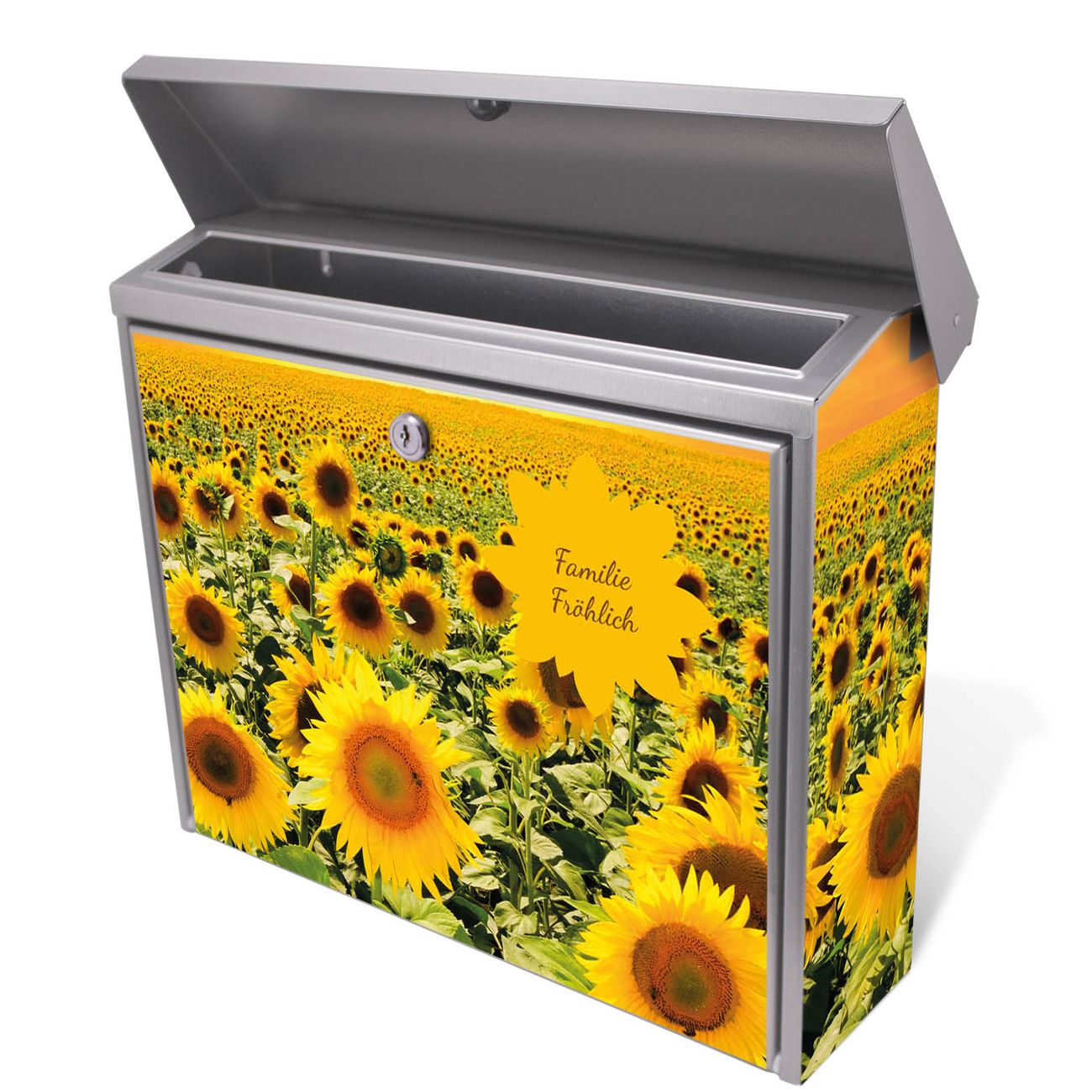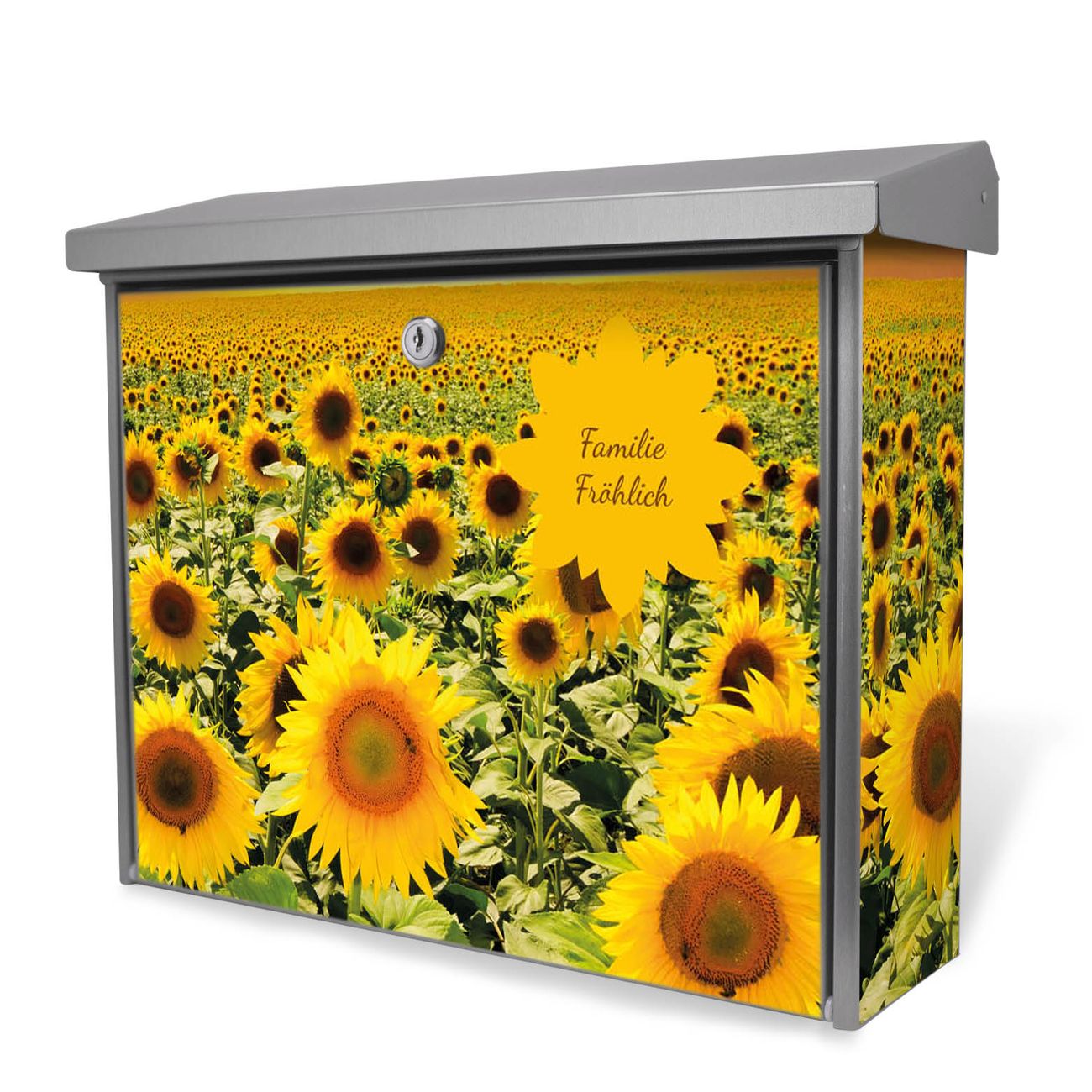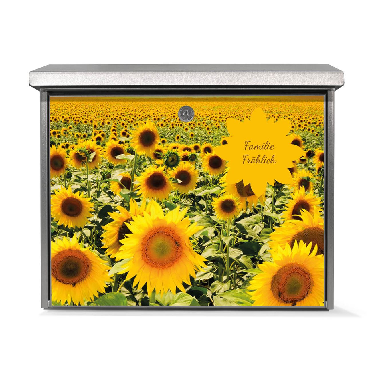 Der Postkasten mit Sonnenblumenmeer Motiv hat ein sehr ansprechendes und zeitloses Design. Unsere Motivpalette hält jede Menge Varianten bereit, ob klassisch, modern, verspielt oder witzig - für jeden haben wir das passende Motiv parat. Der Briefkasten ist das Aushängeschild Ihres Hauses.