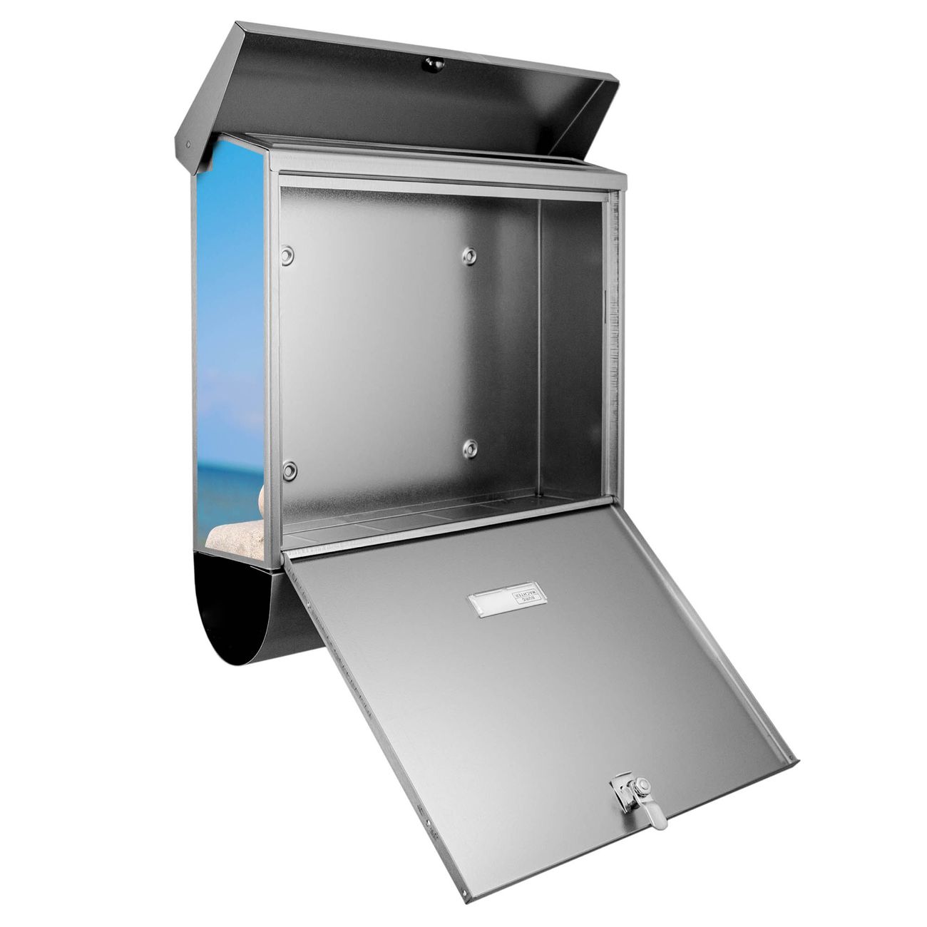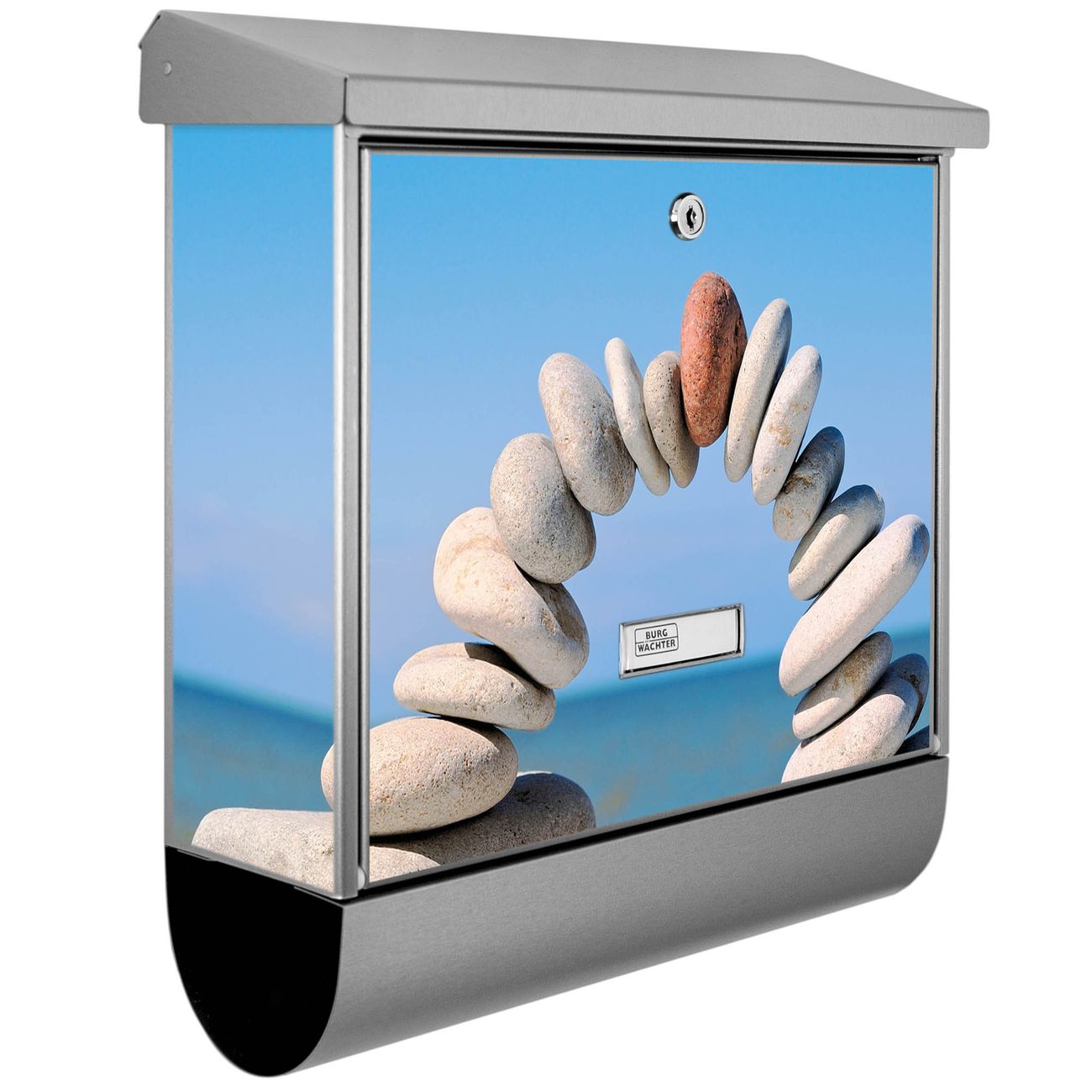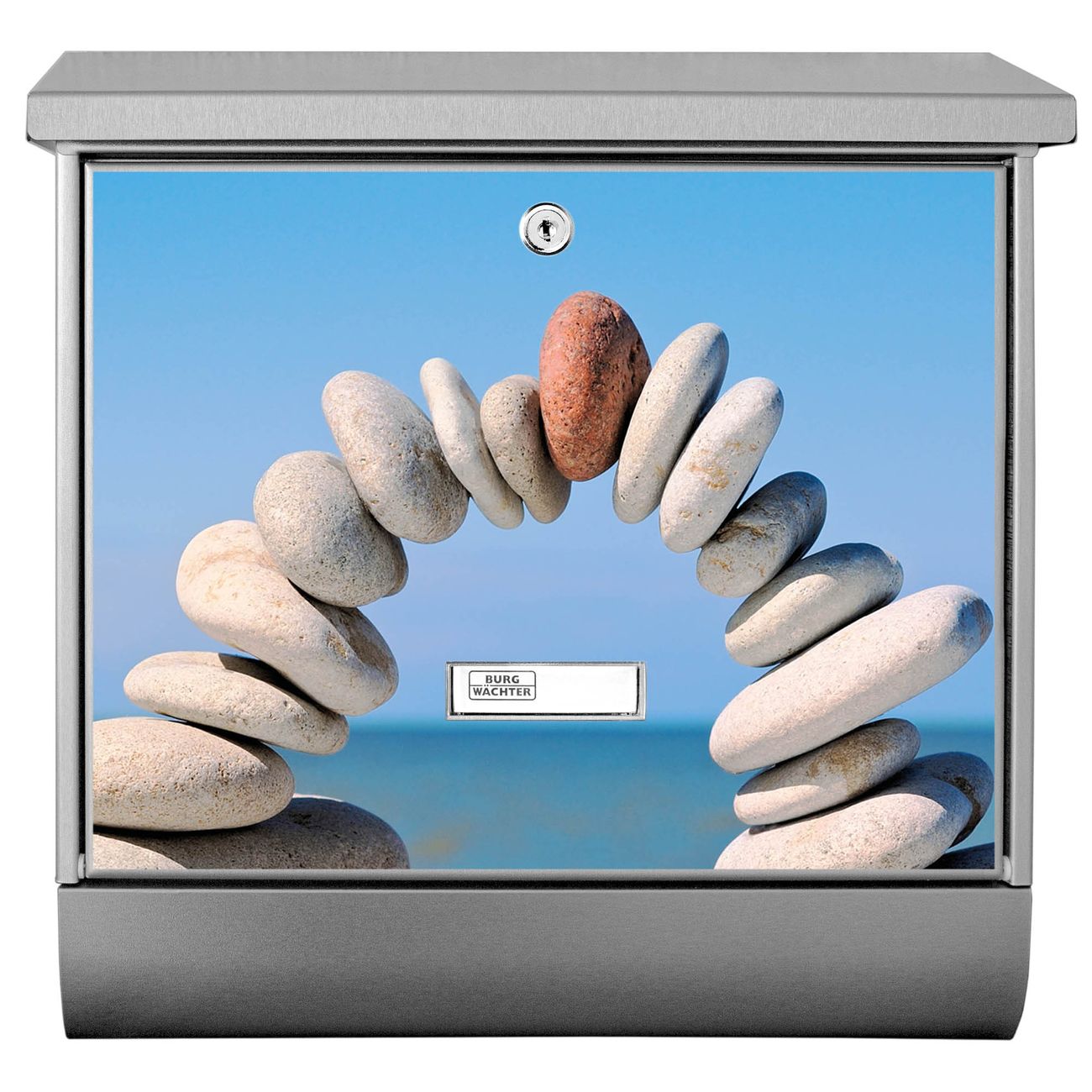Der BURG-WÄCHTER Edelstahl Briefkasten mit Motiv Steine&Meer und Zeitungsrolle bietet Ihnen mit seinem Fassungsvermögen genügend Platz auch für große A4 Sendungen und Zeitschriften. Das integrierte Regendach schützt Ihre Post vor dem Eindringen von Regen.