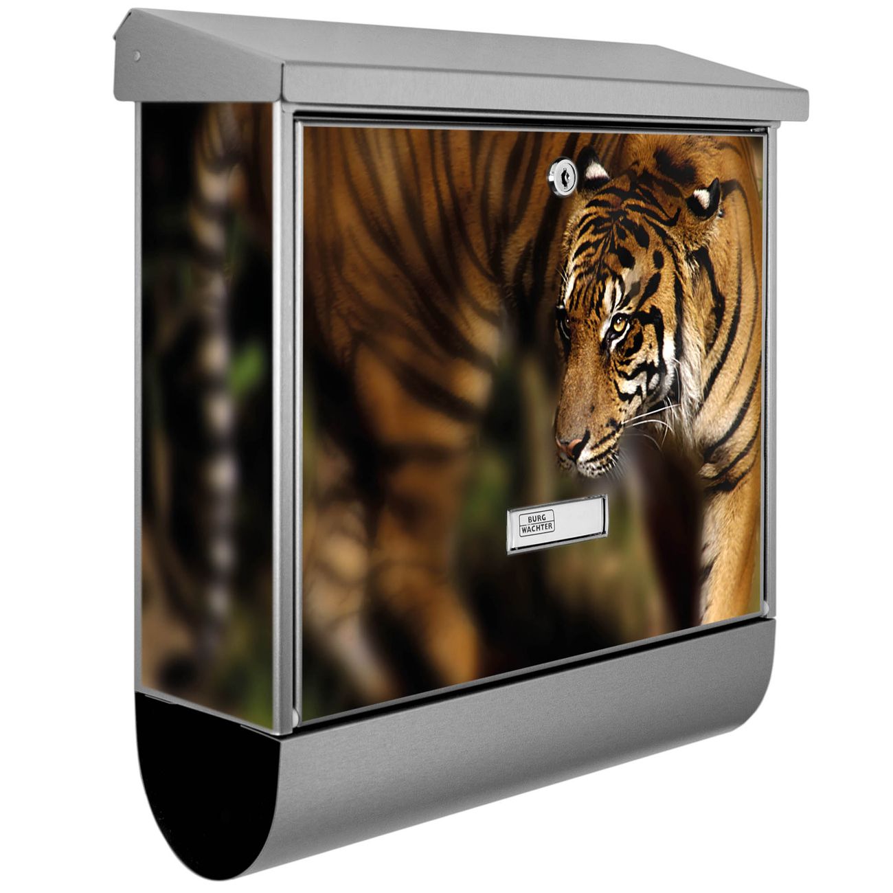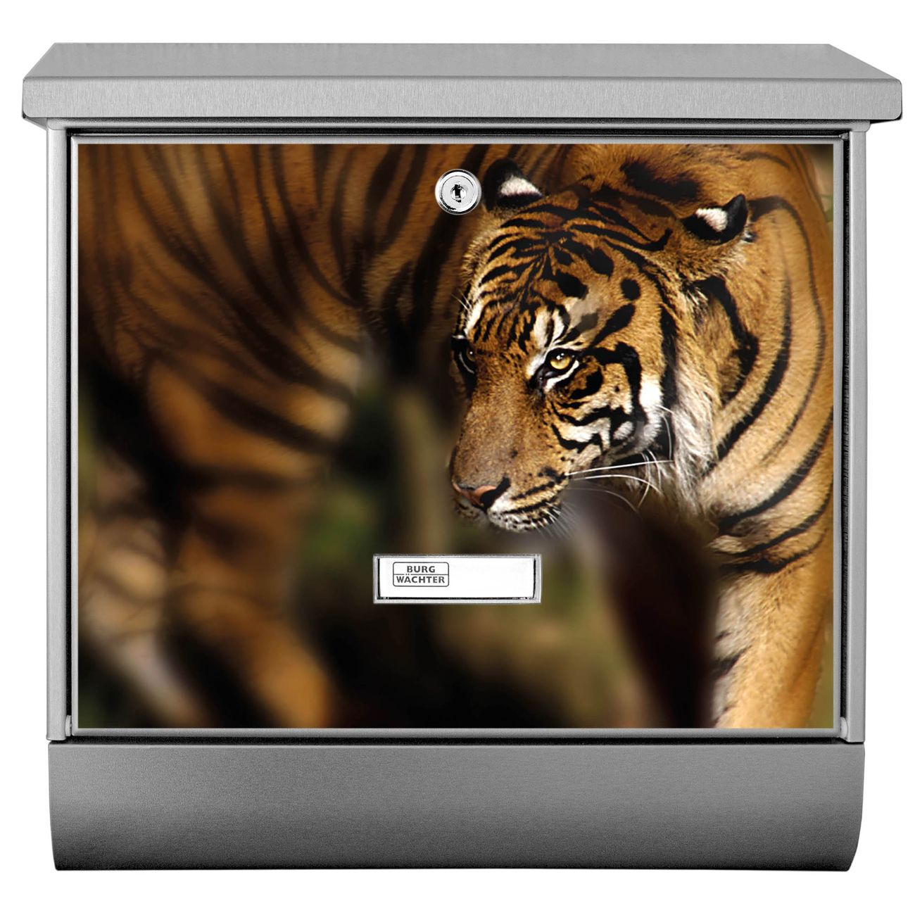 Der BURG-WÄCHTER Edelstahl Briefkasten mit Motiv Tiger und Zeitungsrolle bietet Ihnen mit seinem Fassungsvermögen genügend Platz auch für große A4 Sendungen und Zeitschriften. Das integrierte Regendach schützt Ihre Post vor dem Eindringen von Regen.