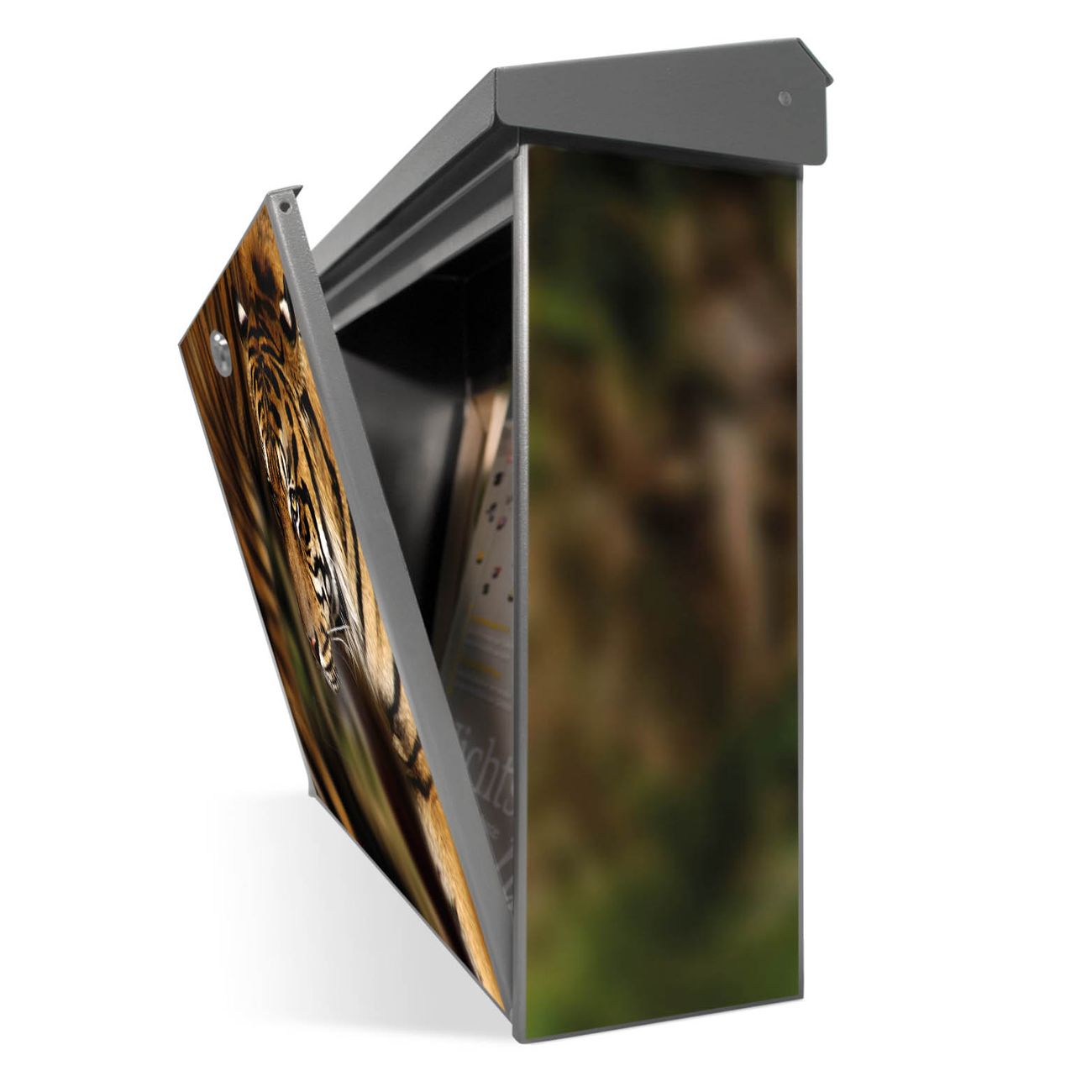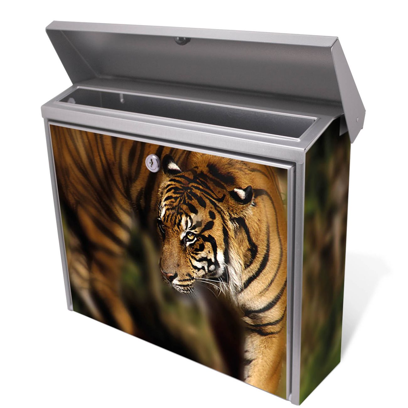 Der Postkasten mit Tiger Motiv hat ein sehr ansprechendes und zeitloses Design. Unsere Motivpalette hält jede Menge Varianten bereit, ob klassisch, modern, verspielt oder witzig - für jeden haben wir das passende Motiv parat. Der Briefkasten ist das Aushängeschild Ihres Hauses.