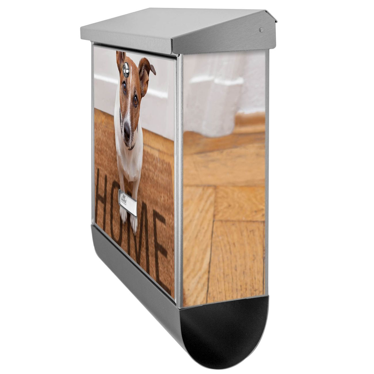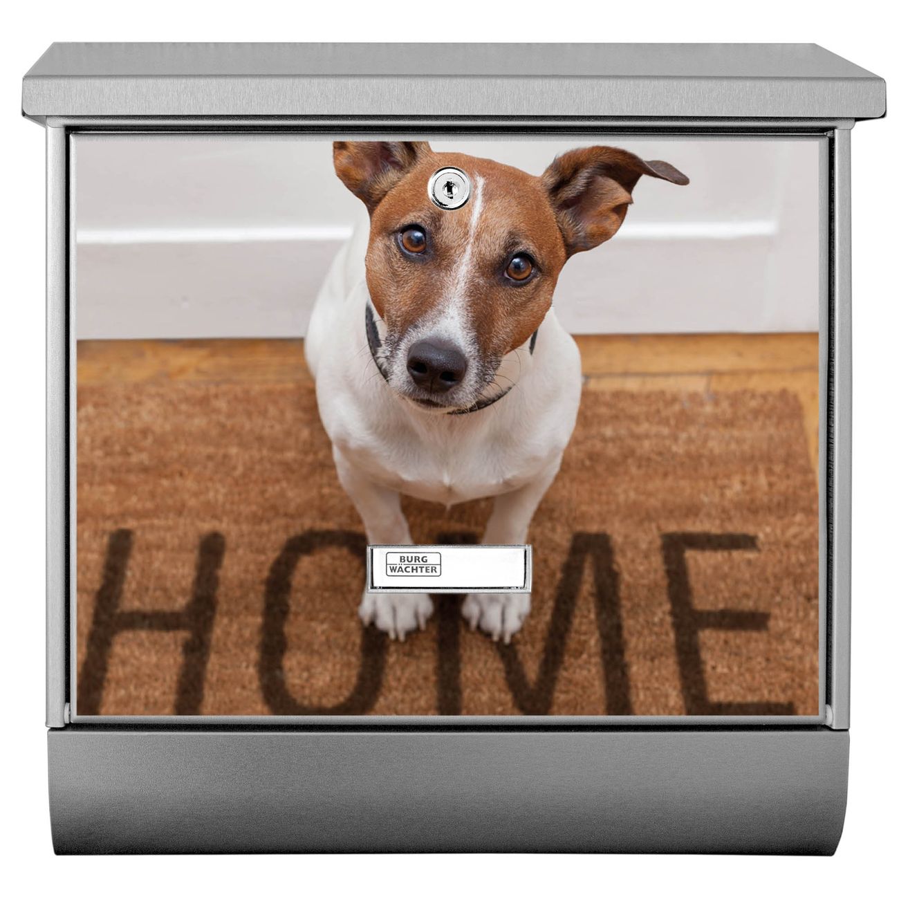 Der BURG-WÄCHTER Edelstahl Briefkasten mit Motiv Wachhund Jack Russel und Zeitungsrolle bietet Ihnen mit seinem Fassungsvermögen genügend Platz auch für große A4 Sendungen und Zeitschriften. Das integrierte Regendach schützt Ihre Post vor dem Eindringen von Regen.