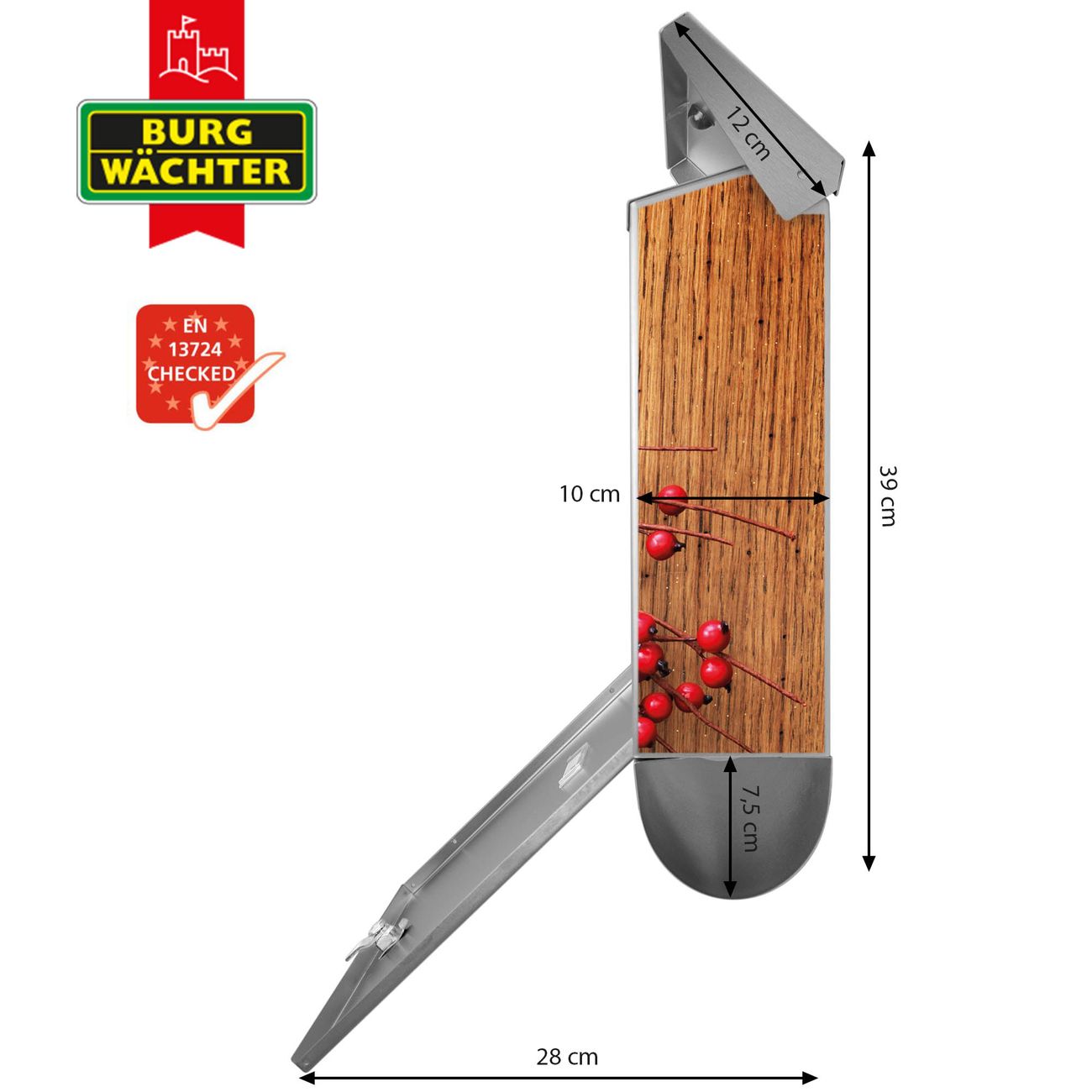 Der BURG-WÄCHTER Edelstahl Briefkasten mit Motiv Weihnachtskranz und Zeitungsrolle bietet Ihnen mit seinem Fassungsvermögen genügend Platz auch für große A4 Sendungen und Zeitschriften. Das integrierte Regendach schützt Ihre Post vor dem Eindringen von Regen.