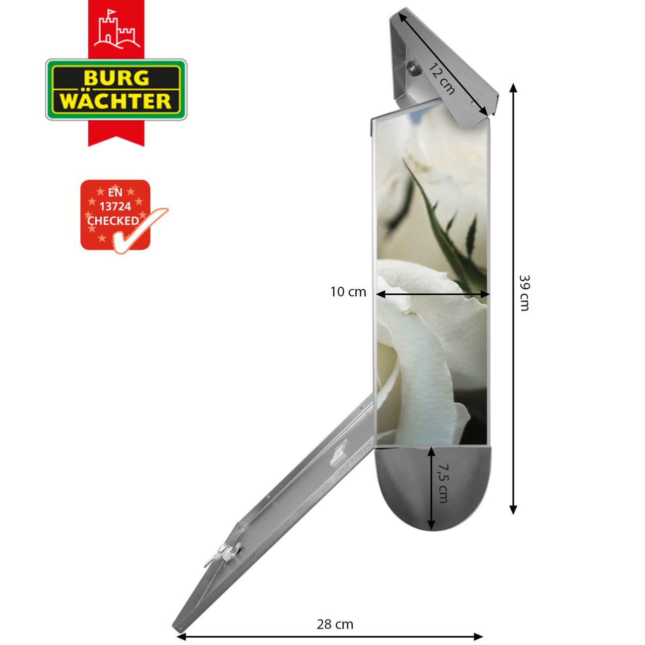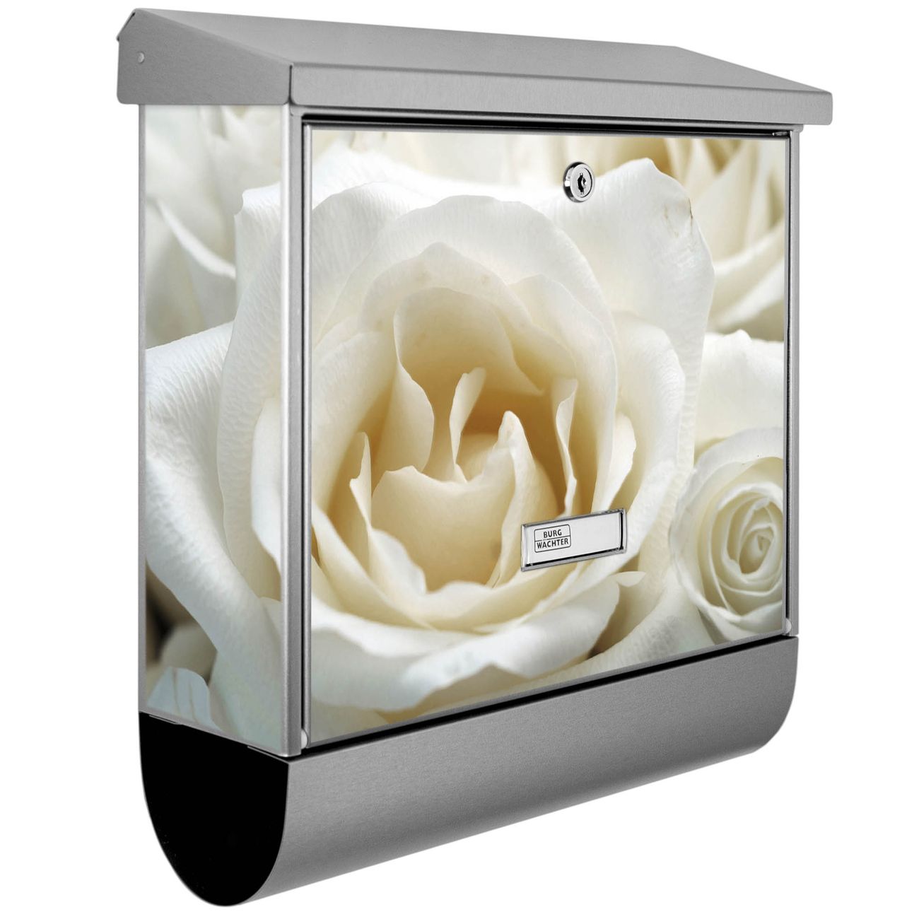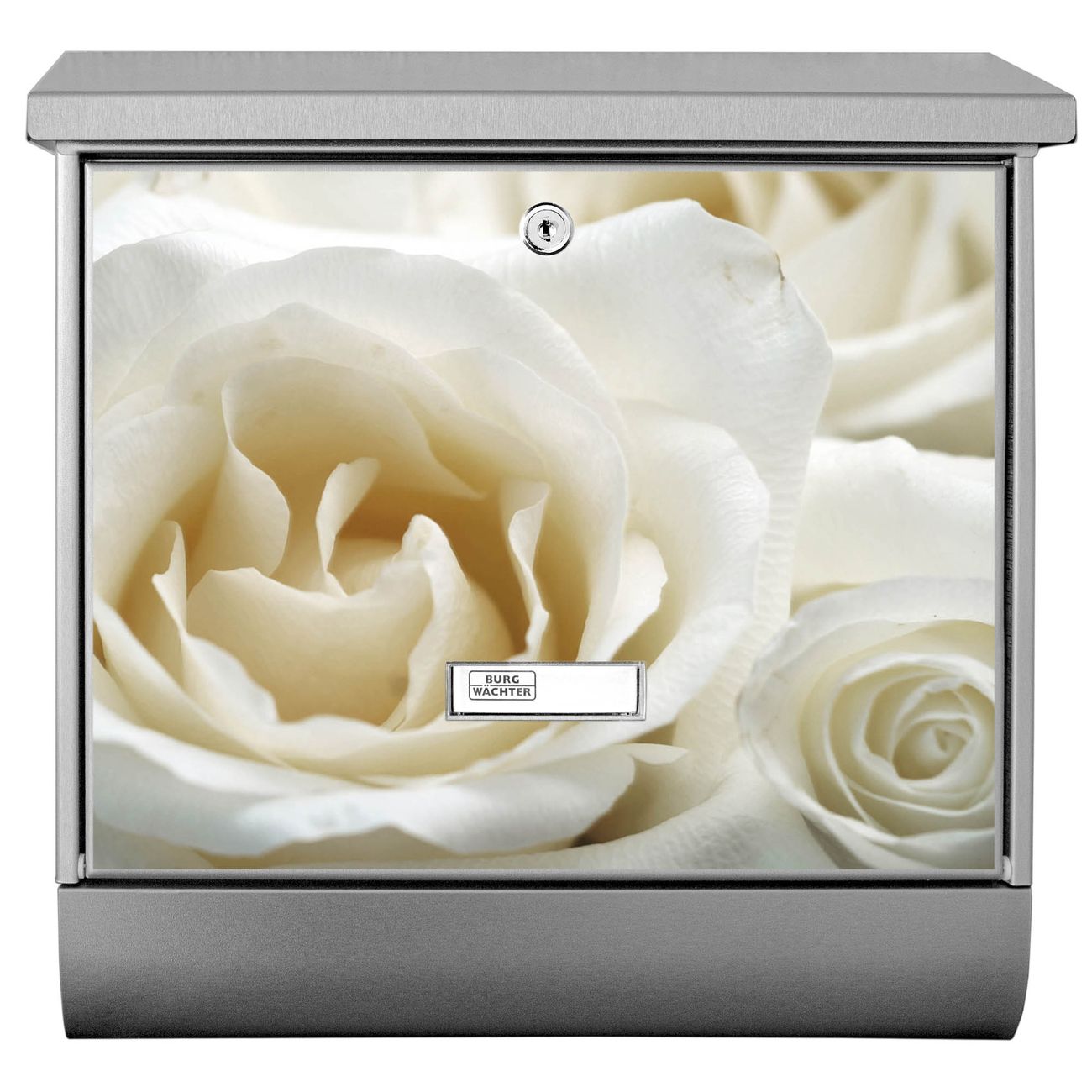 Der BURG-WÄCHTER Edelstahl Briefkasten mit Motiv White Roses und Zeitungsrolle bietet Ihnen mit seinem Fassungsvermögen genügend Platz auch für große A4 Sendungen und Zeitschriften. Das integrierte Regendach schützt Ihre Post vor dem Eindringen von Regen.