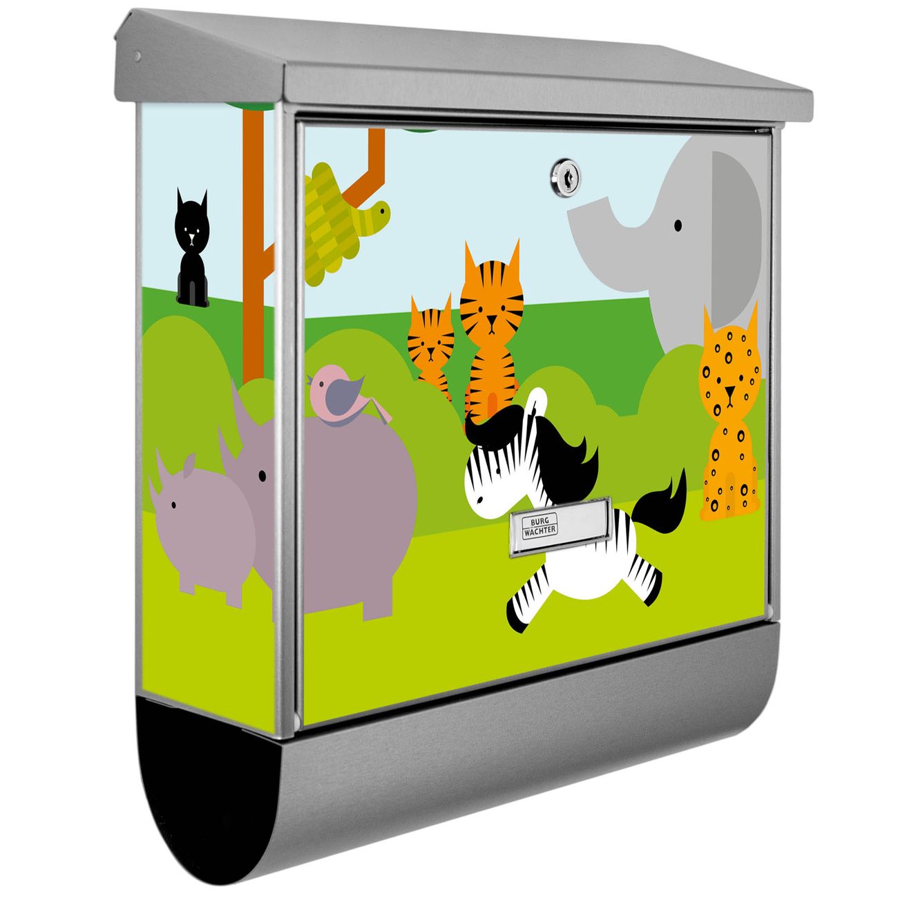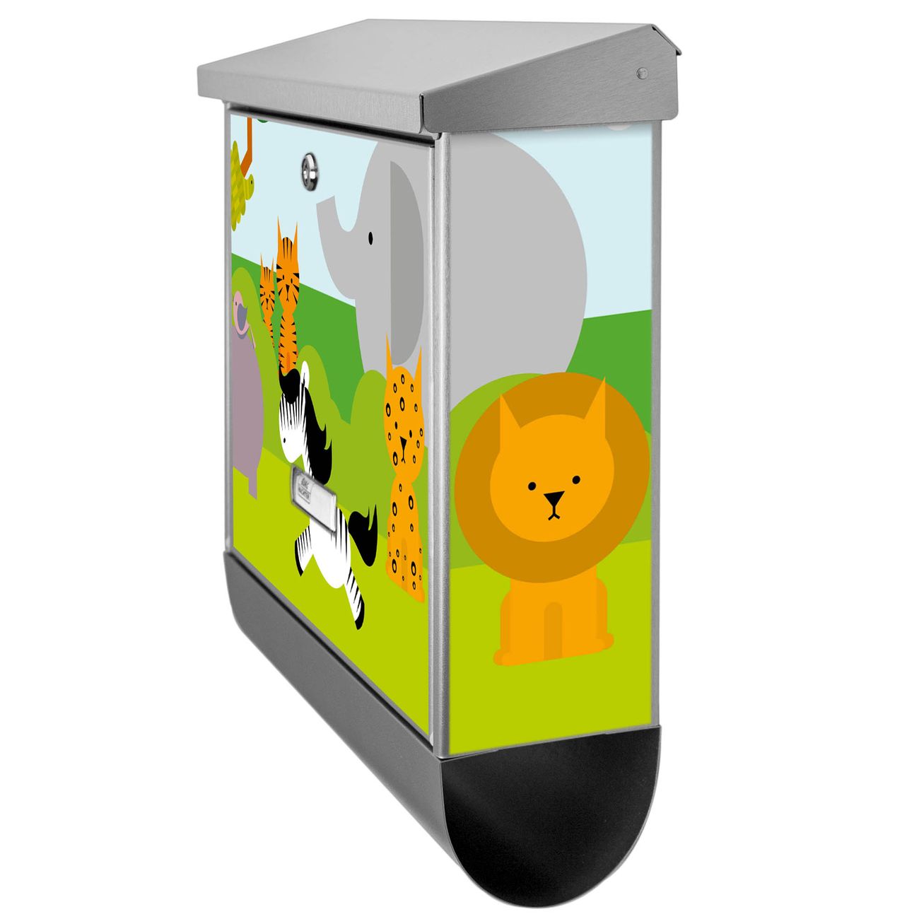 Der BURG-WÄCHTER Edelstahl Briefkasten mit Motiv Wilde Tiere und Zeitungsrolle bietet Ihnen mit seinem Fassungsvermögen genügend Platz auch für große A4 Sendungen und Zeitschriften. Das integrierte Regendach schützt Ihre Post vor dem Eindringen von Regen.