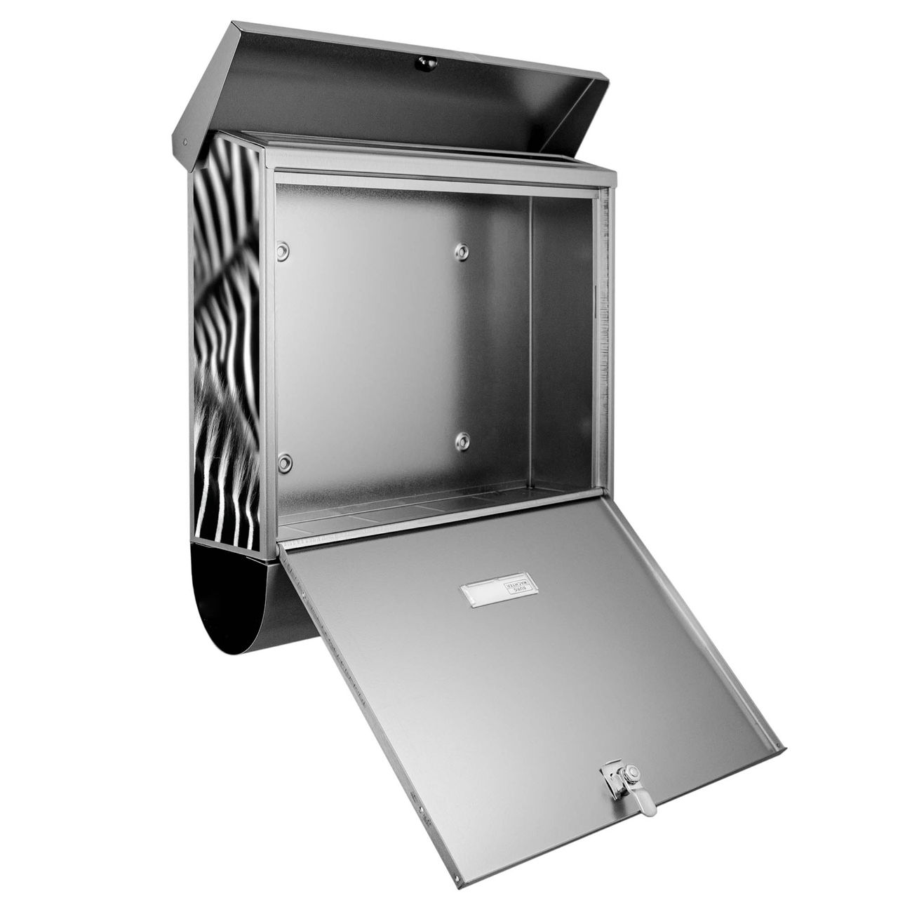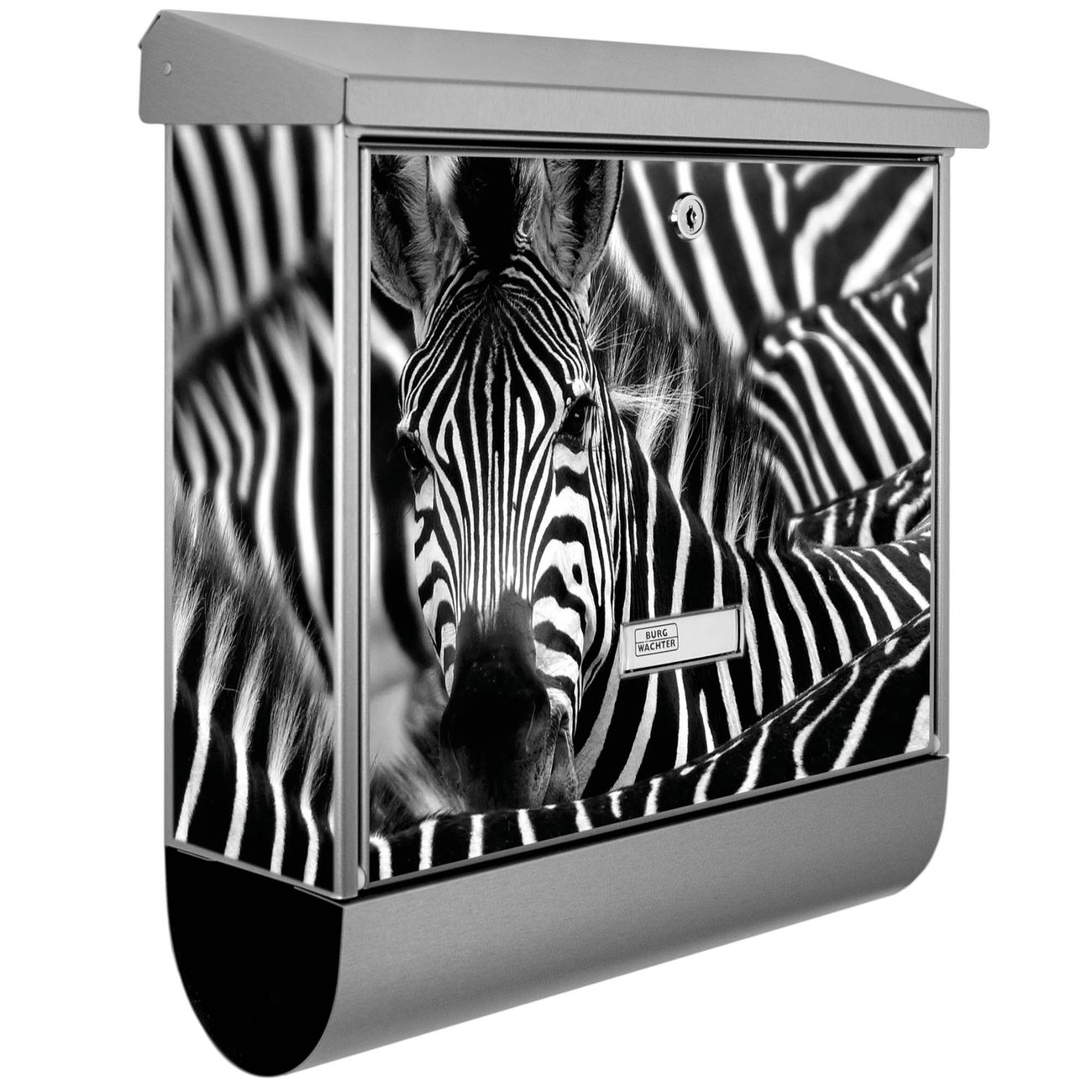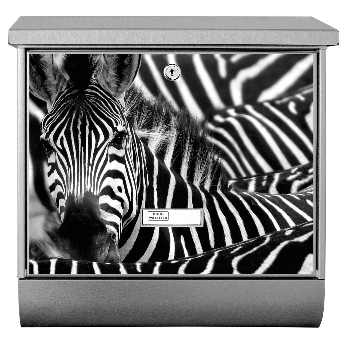 Der BURG-WÄCHTER Edelstahl Briefkasten mit Motiv Zebras und Zeitungsrolle bietet Ihnen mit seinem Fassungsvermögen genügend Platz auch für große A4 Sendungen und Zeitschriften. Das integrierte Regendach schützt Ihre Post vor dem Eindringen von Regen.