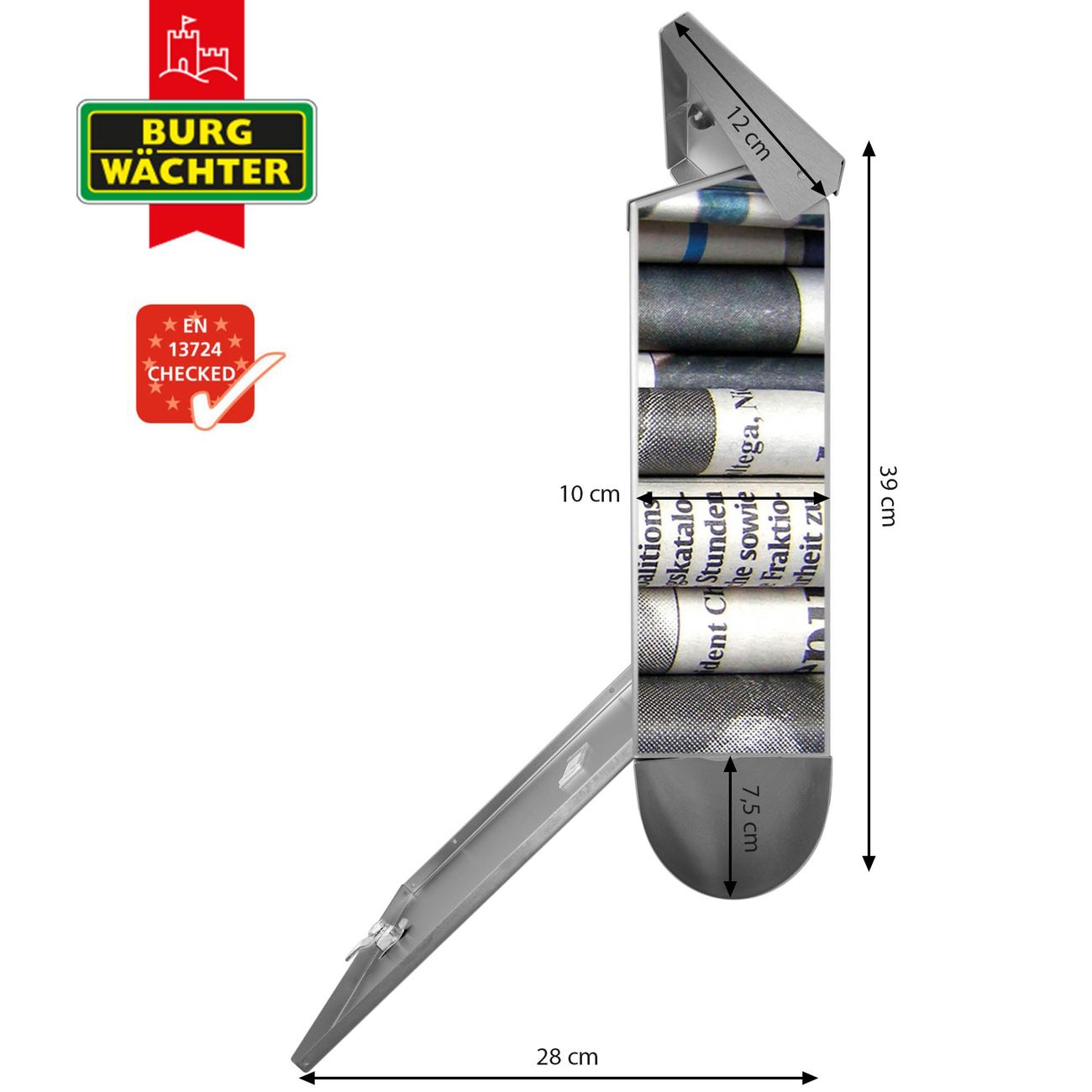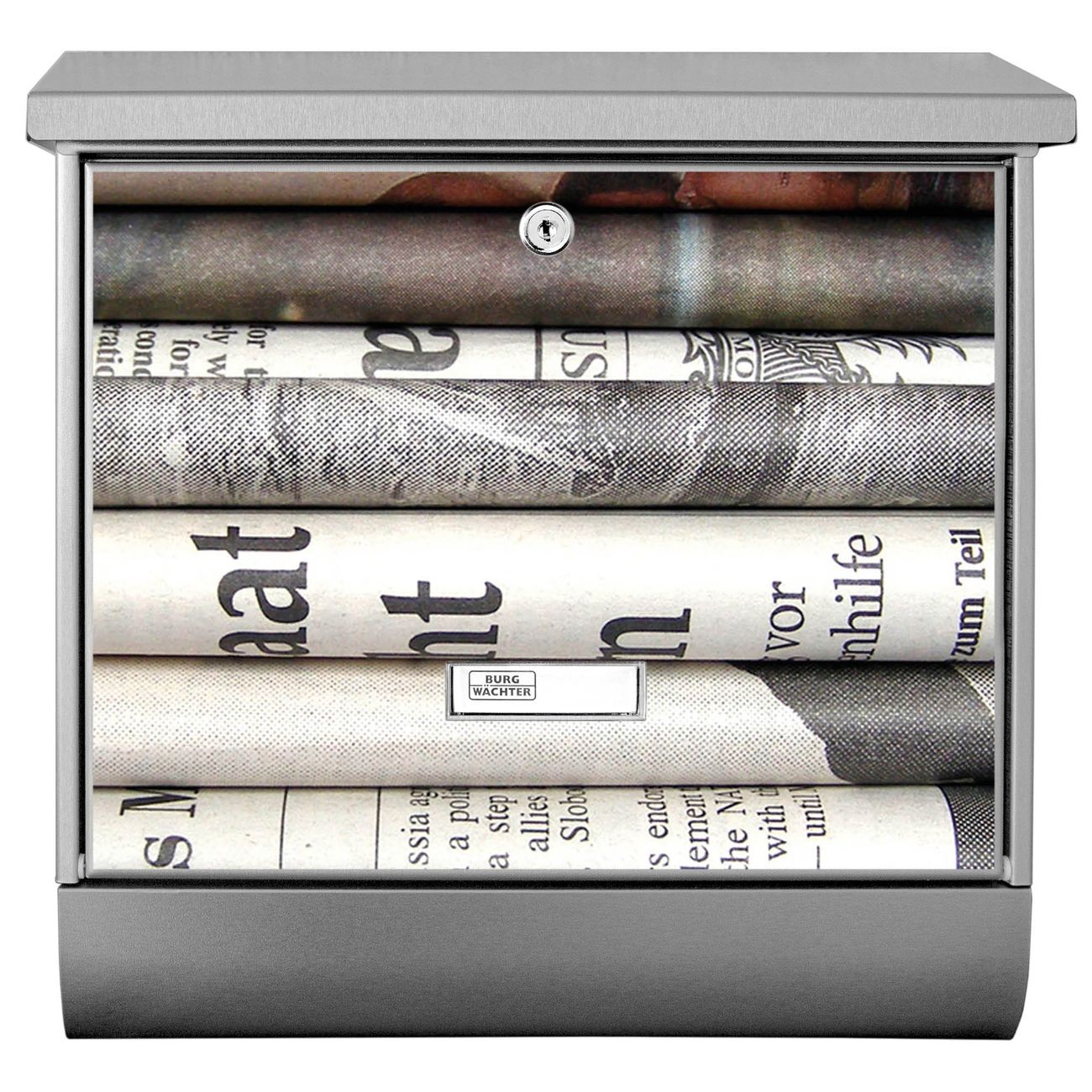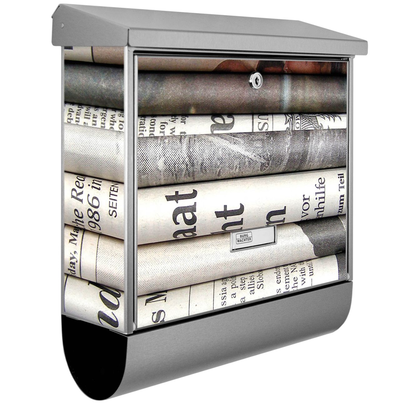 Der BURG-WÄCHTER Edelstahl Briefkasten mit Motiv Zeitungen und Zeitungsrolle bietet Ihnen mit seinem Fassungsvermögen genügend Platz auch für große A4 Sendungen und Zeitschriften. Das integrierte Regendach schützt Ihre Post vor dem Eindringen von Regen.