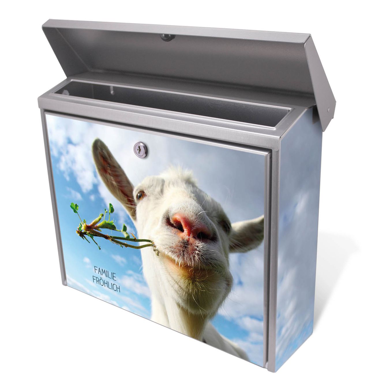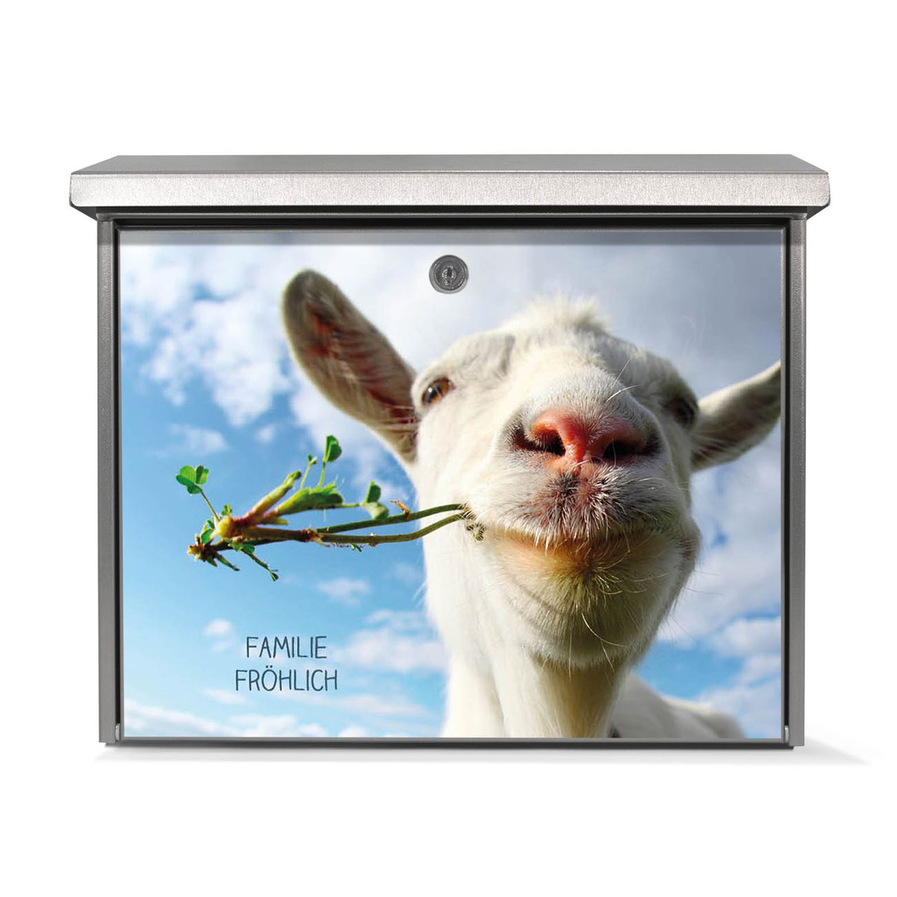 Der Postkasten mit Ziege 2 Motiv hat ein sehr ansprechendes und zeitloses Design. Unsere Motivpalette hält jede Menge Varianten bereit, ob klassisch, modern, verspielt oder witzig - für jeden haben wir das passende Motiv parat. Der Briefkasten ist das Aushängeschild Ihres Hauses.