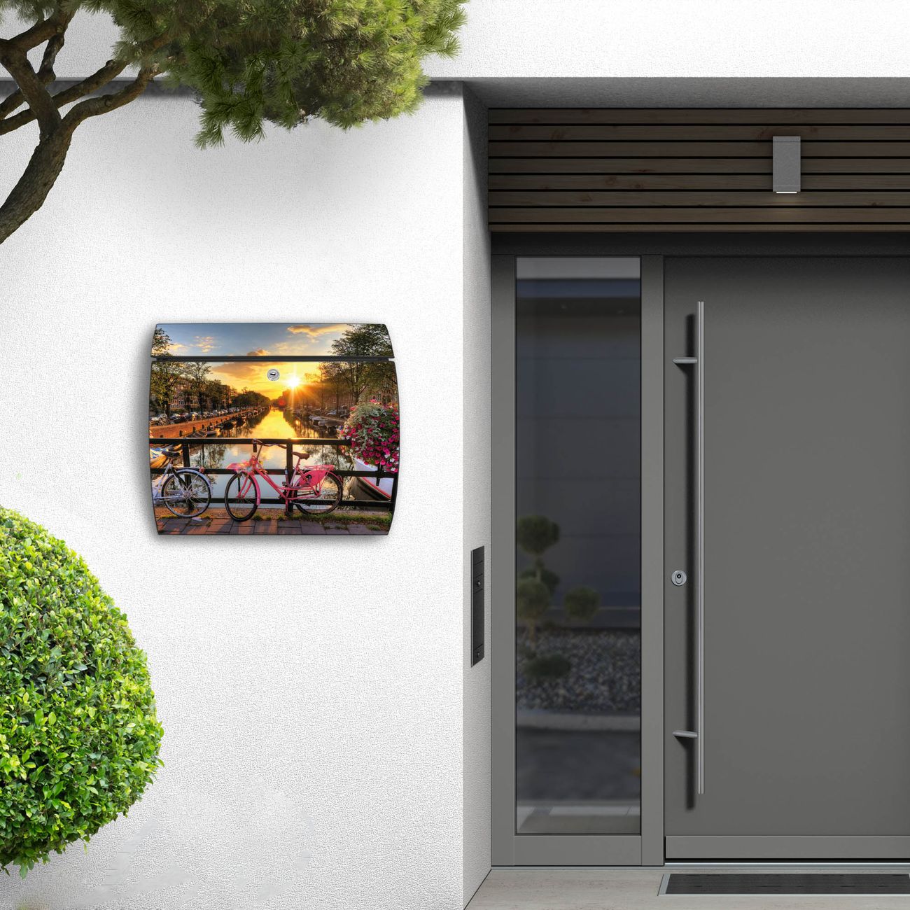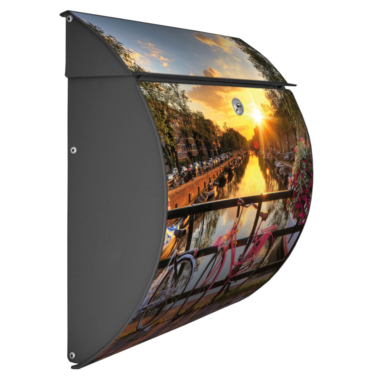 FUNKTION: DESIGN: Das Burg Wächter Modell Toscana mit Motiv Amsterdam Mit Rad hat ein sehr ansprechendes und zeitloses Design und ist besonderes wetterfest. Heben Sie Sich von der tristen grauen Masse ab, ohne auf Funktionalität zu verzichten. Wir bieten Ihnen ebenfalls Namensschilder, bereits beschriftet oder frei zu beschriften, und verschiedene selbst gestaltete Bitte-Keine-Werbung-Aufkleber. DETAILS: Der Postkasten besteht aus vollflächig verzinktem Stahl welcher in Anthrazit oder Weiß lackiert wurde oder aus Edelstahl (je nach gewählter Variante). Das Motiv besteht aus einer wetter- und UV-festen Folie, die mit einem Schutzlaminat überzogen ist, durch die Ihren Briefkasten zusätzlich vor Kratzern geschützt ist und auf den Briefkasten kaschiert wurde. Sie erhalten zu Ihrem neuen Design Briefkasten 2 Schlüssel sowie das passende Montagematerial. BANJADO: Ihr Briefkasten wird von Burg Wächter in Deutschland gefertigt und in unserer kleinen Manufaktur von Hand veredelt. Die Motivfolie ist lösungsmittelfrei und schutzlaminiert, dies sorgt für einen langen Halt. Wir legen großen Wert auf die Verbindung von Funktionalität und Design. Sie erhalten besondere Handarbeit aus Sachsen und Made in Germany.