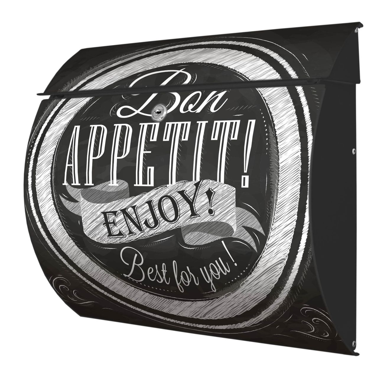 FUNKTION: DESIGN: Das Burg Wächter Modell Toscana mit Motiv Bon Appetit hat ein sehr ansprechendes und zeitloses Design und ist besonderes wetterfest. Heben Sie Sich von der tristen grauen Masse ab, ohne auf Funktionalität zu verzichten. Wir bieten Ihnen ebenfalls Namensschilder, bereits beschriftet oder frei zu beschriften, und verschiedene selbst gestaltete Bitte-Keine-Werbung-Aufkleber. DETAILS: Der Postkasten besteht aus vollflächig verzinktem Stahl welcher in Anthrazit oder Weiß lackiert wurde oder aus Edelstahl (je nach gewählter Variante). Das Motiv besteht aus einer wetter- und UV-festen Folie, die mit einem Schutzlaminat überzogen ist, durch die Ihren Briefkasten zusätzlich vor Kratzern geschützt ist und auf den Briefkasten kaschiert wurde. Sie erhalten zu Ihrem neuen Design Briefkasten 2 Schlüssel sowie das passende Montagematerial. BANJADO: Ihr Briefkasten wird von Burg Wächter in Deutschland gefertigt und in unserer kleinen Manufaktur von Hand veredelt. Die Motivfolie ist lösungsmittelfrei und schutzlaminiert, dies sorgt für einen langen Halt. Wir legen großen Wert auf die Verbindung von Funktionalität und Design. Sie erhalten besondere Handarbeit aus Sachsen und Made in Germany.