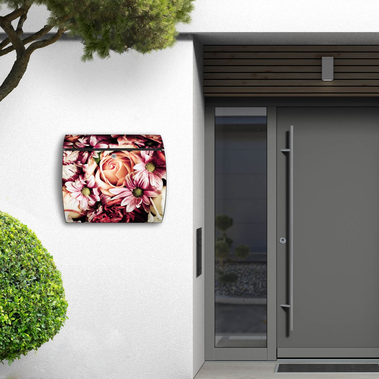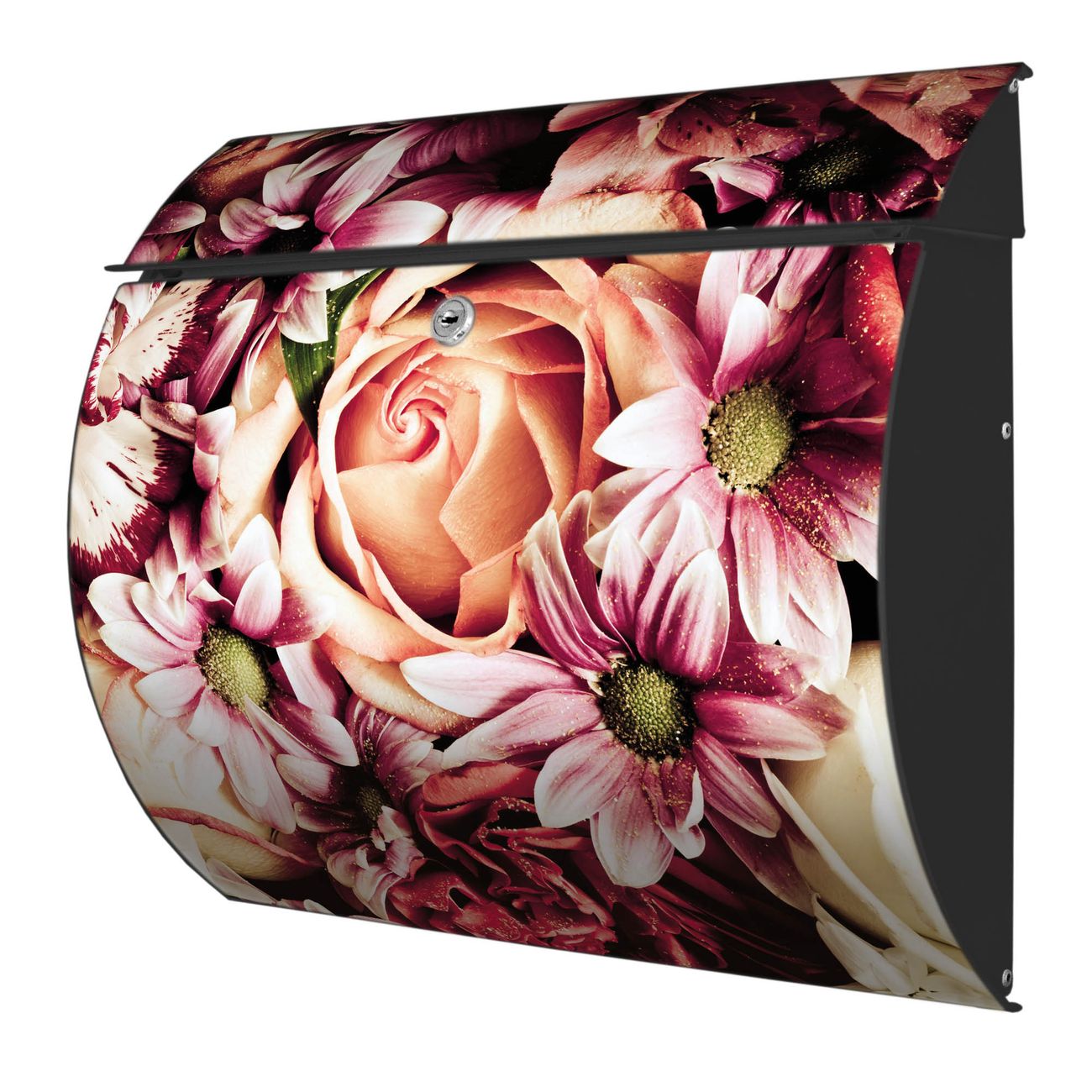 Der geschwungene Burg Wächter Briefkasten Toscana mit Motiv Brautstrauss bietet Ihnen mit seinem großen Fassungsvermögen genügend Platz auch für große A4 Sendungen. Auf Wunsch können Sie bei uns den passenden Standfuß bestellen und so aus dem Wandbriefkasten einen Standbriefkasten machen. Der integrierte Öffnungsstopp ermöglicht eine einfache Handhabung beim Entnehmen der Post.