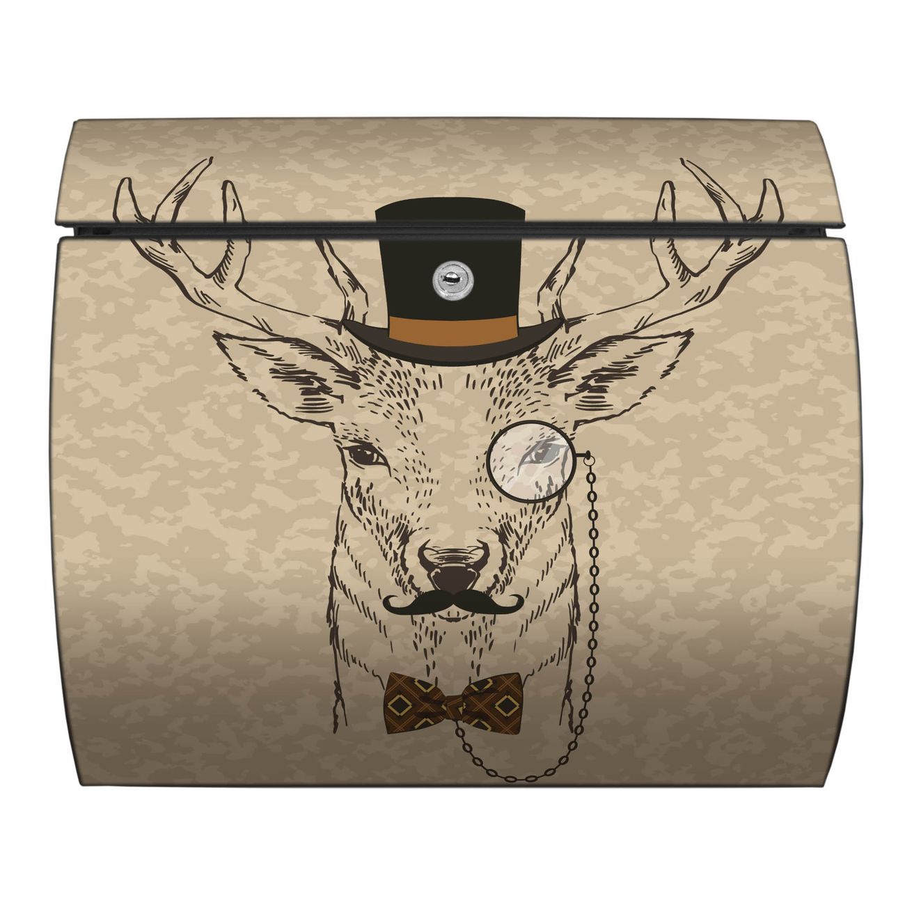 Der geschwungene Burg Wächter Briefkasten Toscana mit Motiv Direktor Hirsch bietet Ihnen mit seinem großen Fassungsvermögen genügend Platz auch für große A4 Sendungen. Auf Wunsch können Sie bei uns den passenden Standfuß bestellen und so aus dem Wandbriefkasten einen Standbriefkasten machen. Der integrierte Öffnungsstopp ermöglicht eine einfache Handhabung beim Entnehmen der Post.