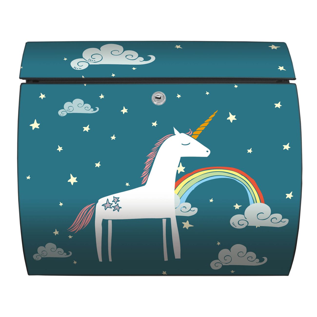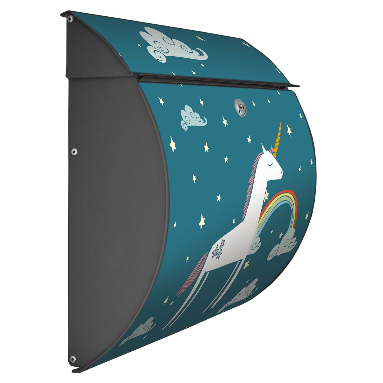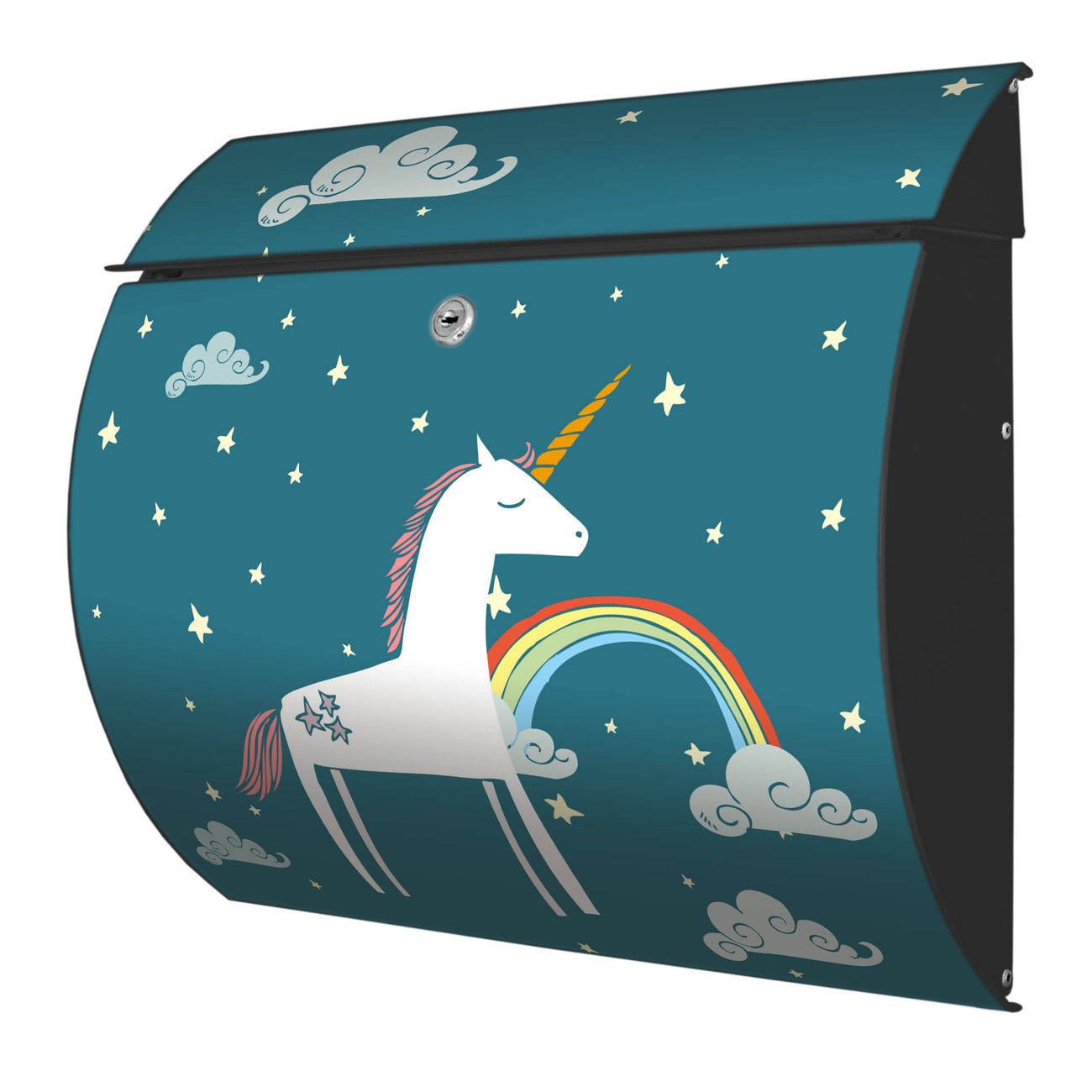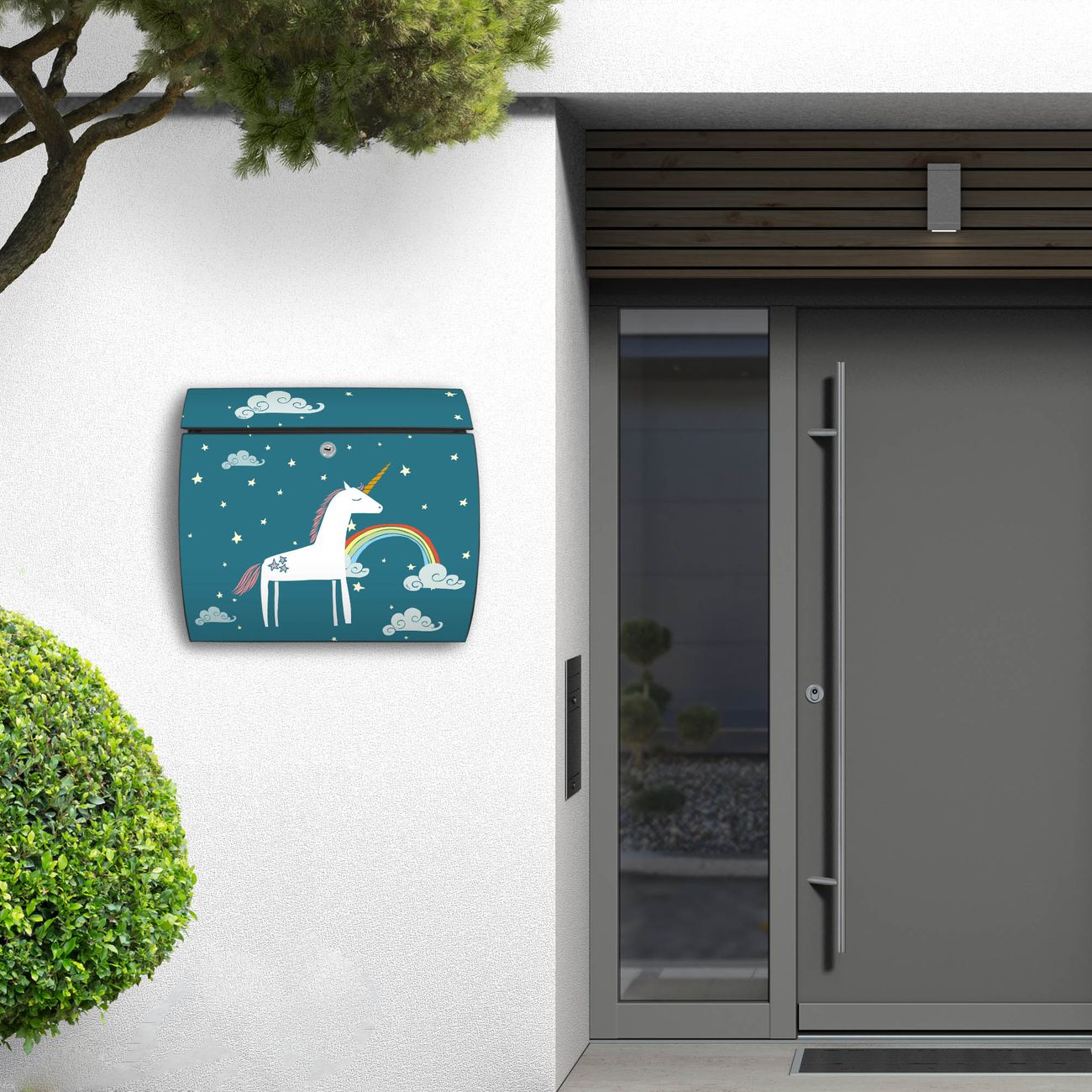 FUNKTION: DESIGN: Das Burg Wächter Modell Toscana mit Motiv Einhorn hat ein sehr ansprechendes und zeitloses Design und ist besonderes wetterfest. Heben Sie Sich von der tristen grauen Masse ab, ohne auf Funktionalität zu verzichten. Wir bieten Ihnen ebenfalls Namensschilder, bereits beschriftet oder frei zu beschriften, und verschiedene selbst gestaltete Bitte-Keine-Werbung-Aufkleber. DETAILS: Der Postkasten besteht aus vollflächig verzinktem Stahl welcher in Anthrazit oder Weiß lackiert wurde oder aus Edelstahl (je nach gewählter Variante). Das Motiv besteht aus einer wetter- und UV-festen Folie, die mit einem Schutzlaminat überzogen ist, durch die Ihren Briefkasten zusätzlich vor Kratzern geschützt ist und auf den Briefkasten kaschiert wurde. Sie erhalten zu Ihrem neuen Design Briefkasten 2 Schlüssel sowie das passende Montagematerial. BANJADO: Ihr Briefkasten wird von Burg Wächter in Deutschland gefertigt und in unserer kleinen Manufaktur von Hand veredelt. Die Motivfolie ist lösungsmittelfrei und schutzlaminiert, dies sorgt für einen langen Halt. Wir legen großen Wert auf die Verbindung von Funktionalität und Design. Sie erhalten besondere Handarbeit aus Sachsen und Made in Germany.