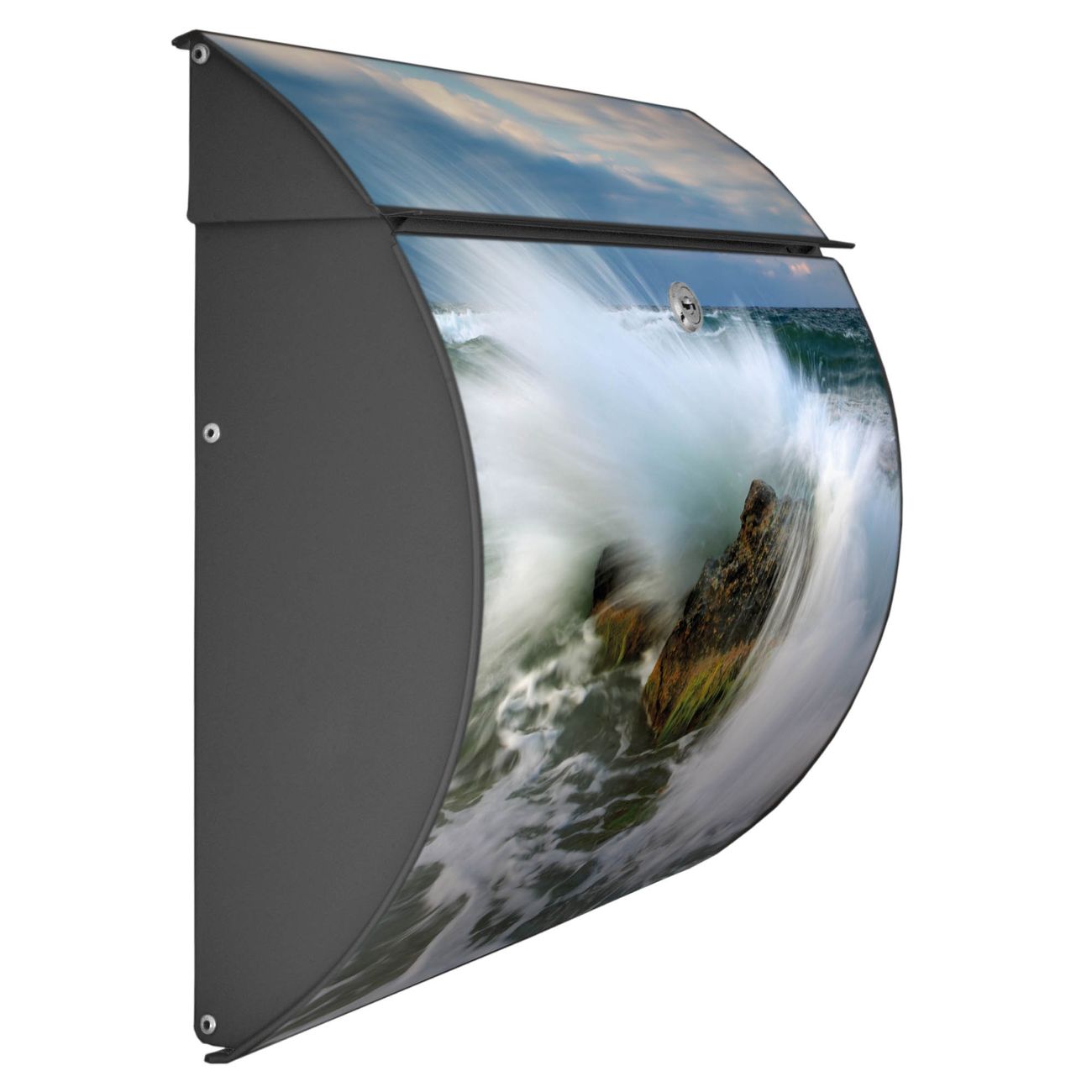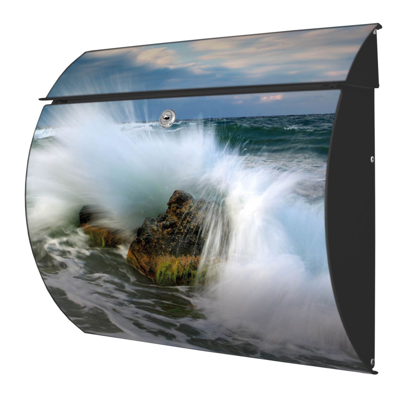 FUNKTION: DESIGN: Das Burg Wächter Modell Toscana mit Motiv Einsteinwelle hat ein sehr ansprechendes und zeitloses Design und ist besonderes wetterfest. Heben Sie Sich von der tristen grauen Masse ab, ohne auf Funktionalität zu verzichten. Wir bieten Ihnen ebenfalls Namensschilder, bereits beschriftet oder frei zu beschriften, und verschiedene selbst gestaltete Bitte-Keine-Werbung-Aufkleber. DETAILS: Der Postkasten besteht aus vollflächig verzinktem Stahl welcher in Anthrazit oder Weiß lackiert wurde oder aus Edelstahl (je nach gewählter Variante). Das Motiv besteht aus einer wetter- und UV-festen Folie, die mit einem Schutzlaminat überzogen ist, durch die Ihren Briefkasten zusätzlich vor Kratzern geschützt ist und auf den Briefkasten kaschiert wurde. Sie erhalten zu Ihrem neuen Design Briefkasten 2 Schlüssel sowie das passende Montagematerial. BANJADO: Ihr Briefkasten wird von Burg Wächter in Deutschland gefertigt und in unserer kleinen Manufaktur von Hand veredelt. Die Motivfolie ist lösungsmittelfrei und schutzlaminiert, dies sorgt für einen langen Halt. Wir legen großen Wert auf die Verbindung von Funktionalität und Design. Sie erhalten besondere Handarbeit aus Sachsen und Made in Germany.