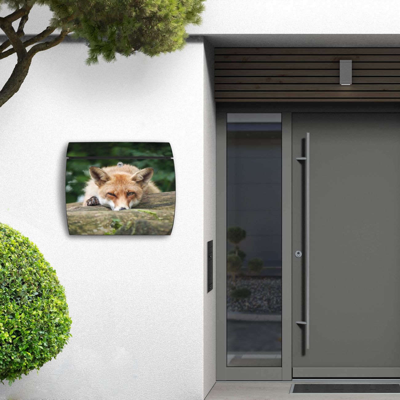 FUNKTION: DESIGN: Das Burg Wächter Modell Toscana mit Motiv Fuchs Relax hat ein sehr ansprechendes und zeitloses Design und ist besonderes wetterfest. Heben Sie Sich von der tristen grauen Masse ab, ohne auf Funktionalität zu verzichten. Wir bieten Ihnen ebenfalls Namensschilder, bereits beschriftet oder frei zu beschriften, und verschiedene selbst gestaltete Bitte-Keine-Werbung-Aufkleber. DETAILS: Der Postkasten besteht aus vollflächig verzinktem Stahl welcher in Anthrazit oder Weiß lackiert wurde oder aus Edelstahl (je nach gewählter Variante). Das Motiv besteht aus einer wetter- und UV-festen Folie, die mit einem Schutzlaminat überzogen ist, durch die Ihren Briefkasten zusätzlich vor Kratzern geschützt ist und auf den Briefkasten kaschiert wurde. Sie erhalten zu Ihrem neuen Design Briefkasten 2 Schlüssel sowie das passende Montagematerial. BANJADO: Ihr Briefkasten wird von Burg Wächter in Deutschland gefertigt und in unserer kleinen Manufaktur von Hand veredelt. Die Motivfolie ist lösungsmittelfrei und schutzlaminiert, dies sorgt für einen langen Halt. Wir legen großen Wert auf die Verbindung von Funktionalität und Design. Sie erhalten besondere Handarbeit aus Sachsen und Made in Germany.